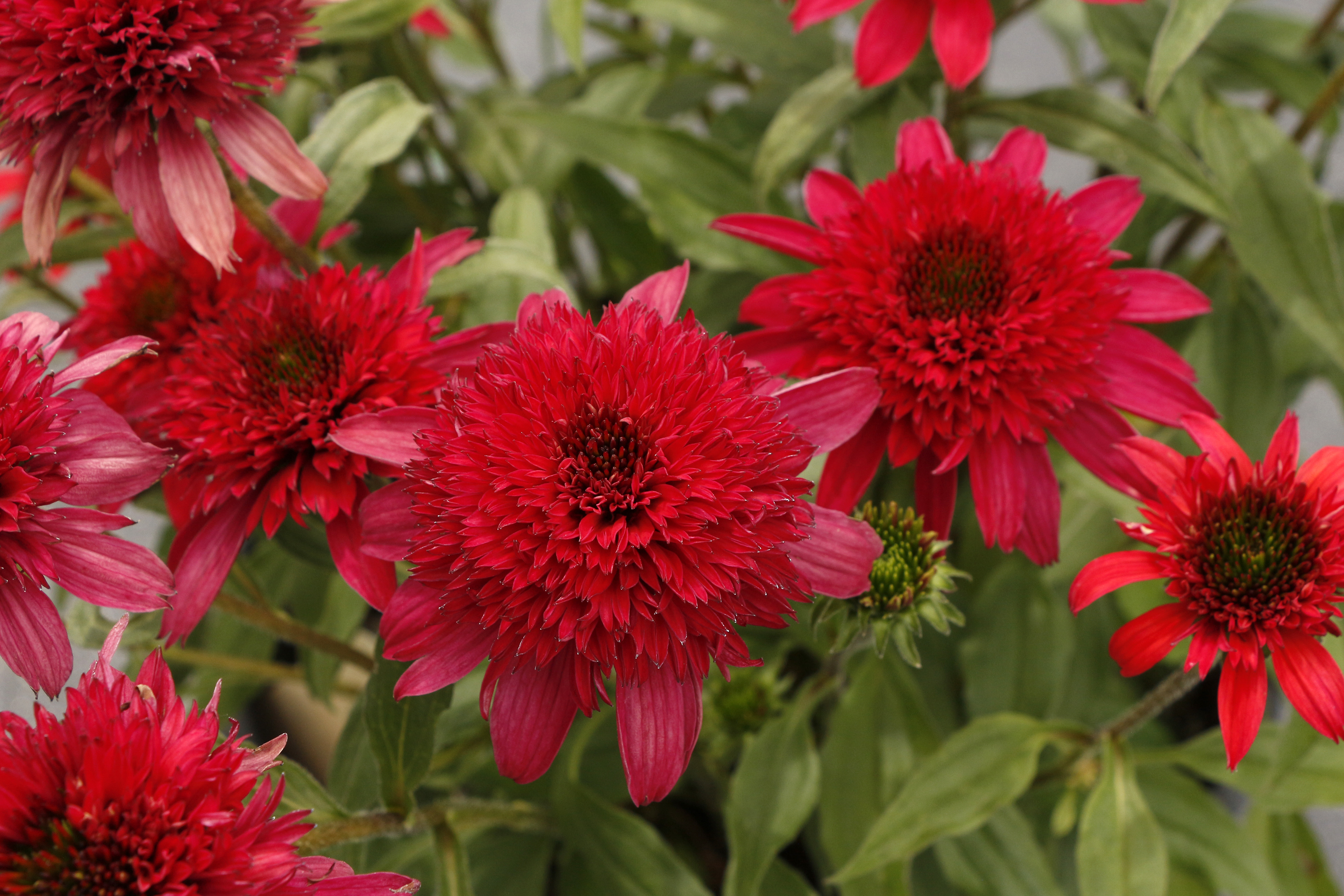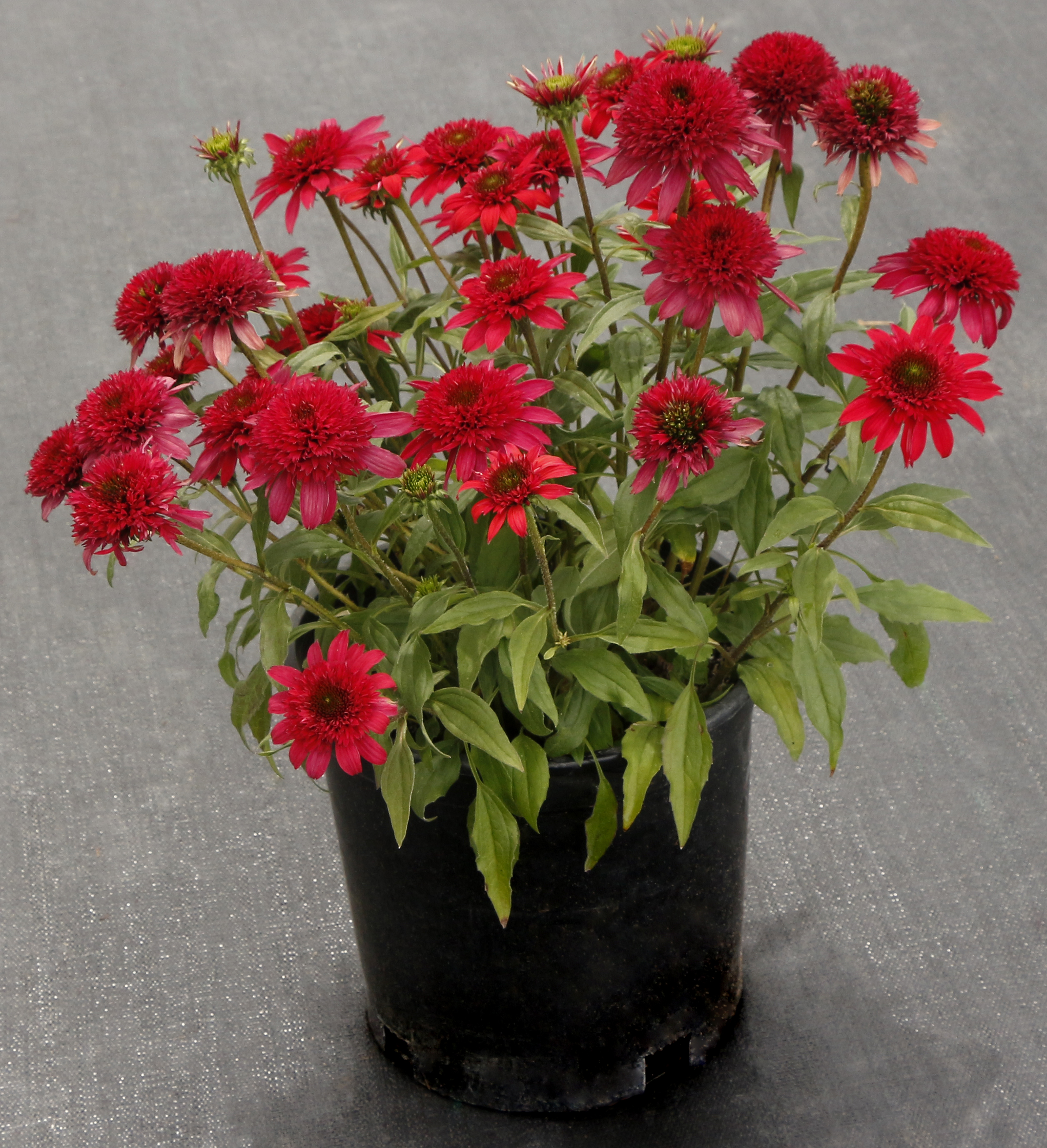 Bred for the pot crop market. A refreshing and super cute dwarf Echinacea! Low growing but high flower power in a juicy, bright wine color. Double, anemone type flowers start off with a dark eyed center and expand into a clear Sangria color. Very appropriate for summer. Branches from the base with narrow, pointed foliage clasping the upright stems. Perfectly sized for container use, these echinacea look great at retail and are fantastic for summer displays.