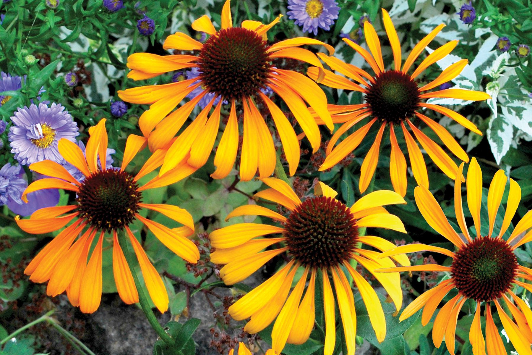 Charming yellow-orange starbursts explode over this compact beauty. Dark, round cones add to the appeal. Fragrant, more delicate flowers are useful in bouquets. Attracts butterflies in summer and seed hunting birds in the fall.