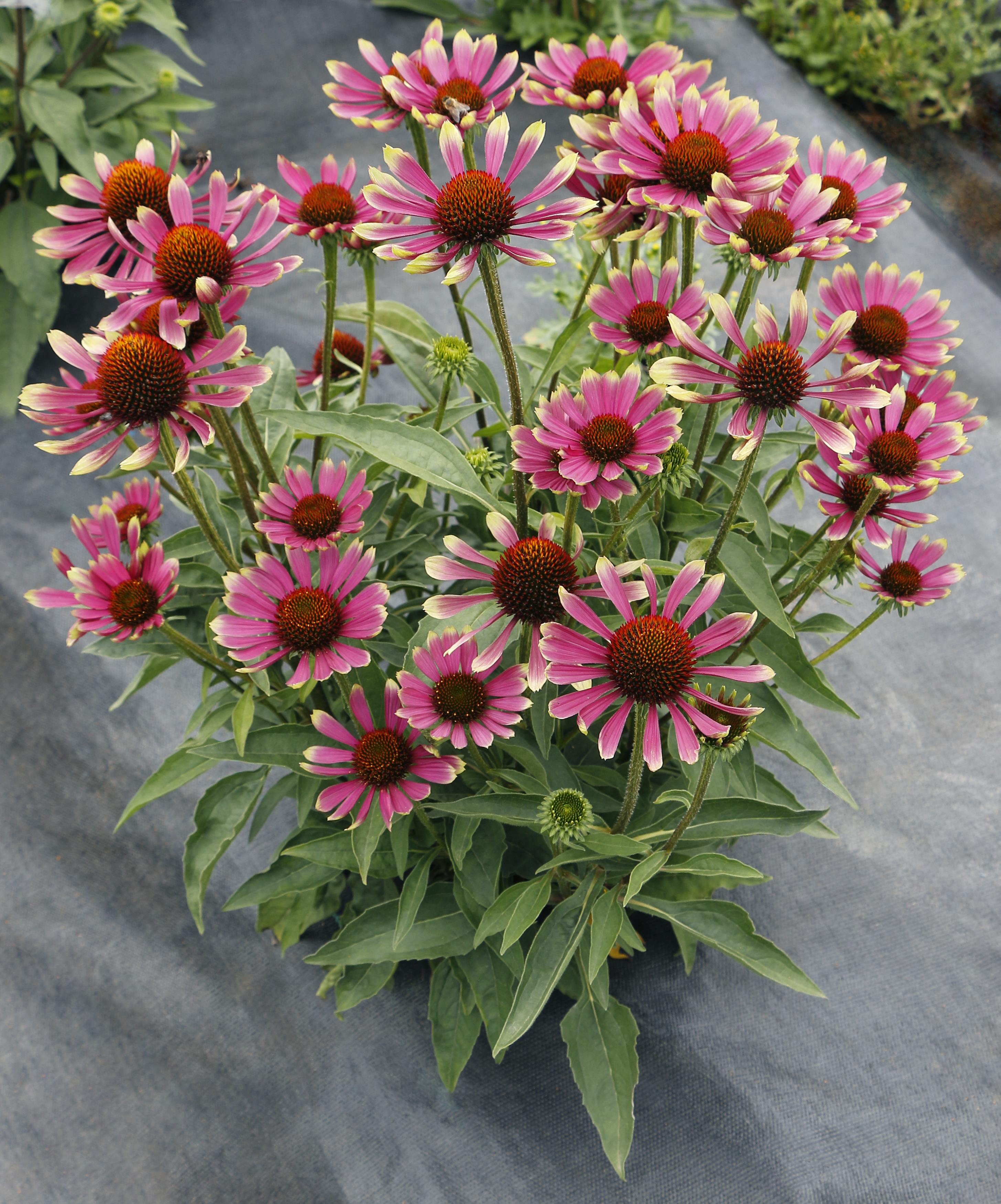 Plant one liner per 4-inch or gallon pot. Make sure not to cover the crown with soil by planting too deep; incorrect planting depth is the most common cause for losses in Echinacea. The soil levels of the pot and the liner should match up evenly. A broad-spectrum preventative fungicide after transplanting is recommended – check labels for desired rates and application intervals, and (as with any chemical) test on a small group of plants before applying to the entire crop.