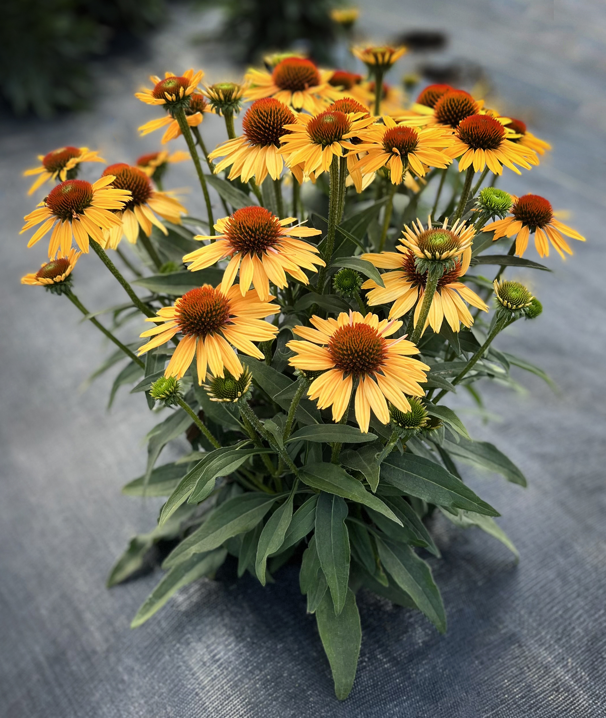 Bred for the pot crop market. Another great addition to the PRINCESS™ series of Echinacea. Rich, honey colored flowers are well scented and attract pollinators like crazy – especially butterflies! Tight compact habit and long lasting flowers for months. Deep green foliage, right to the ground, completes this clean and tailored Echinacea.