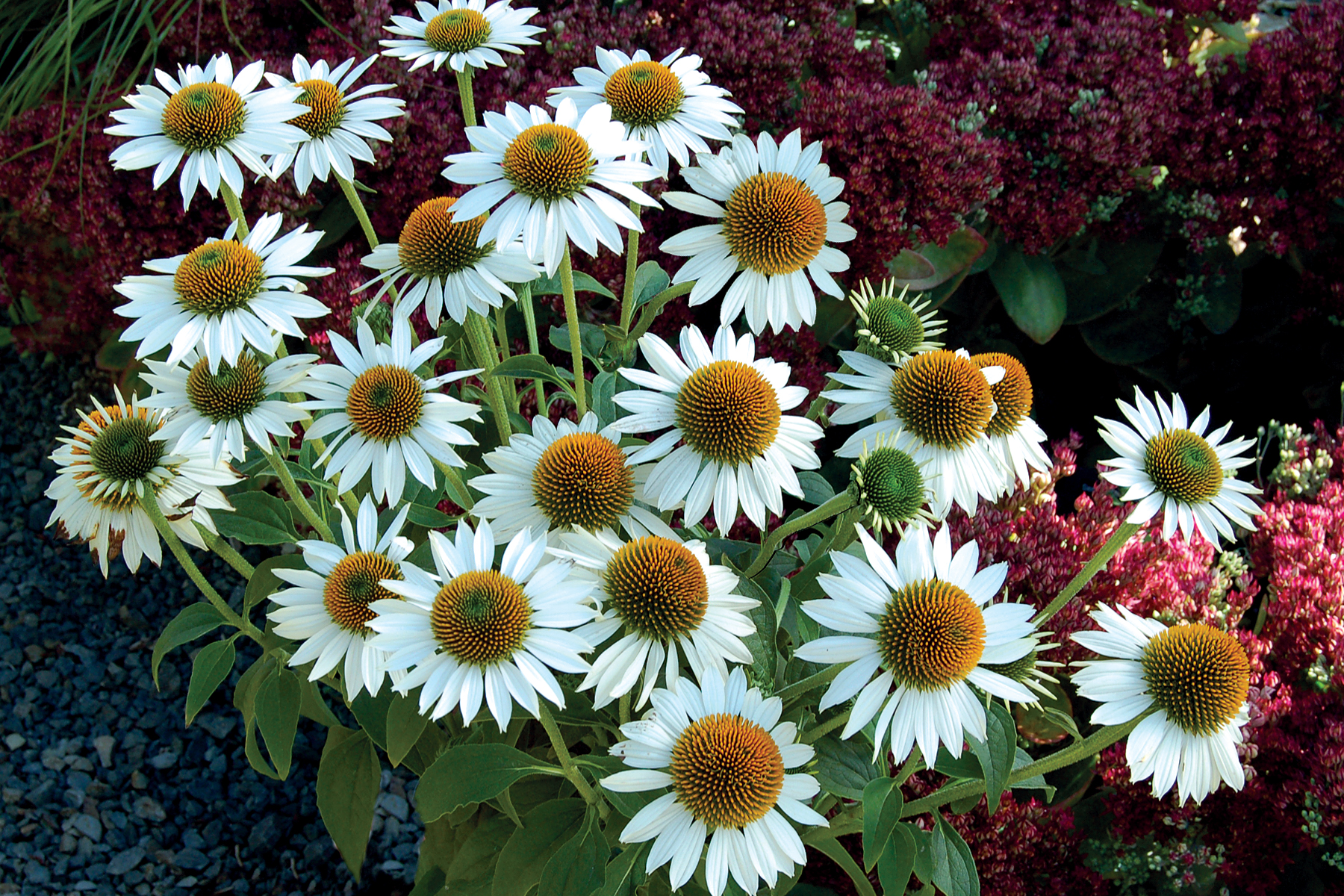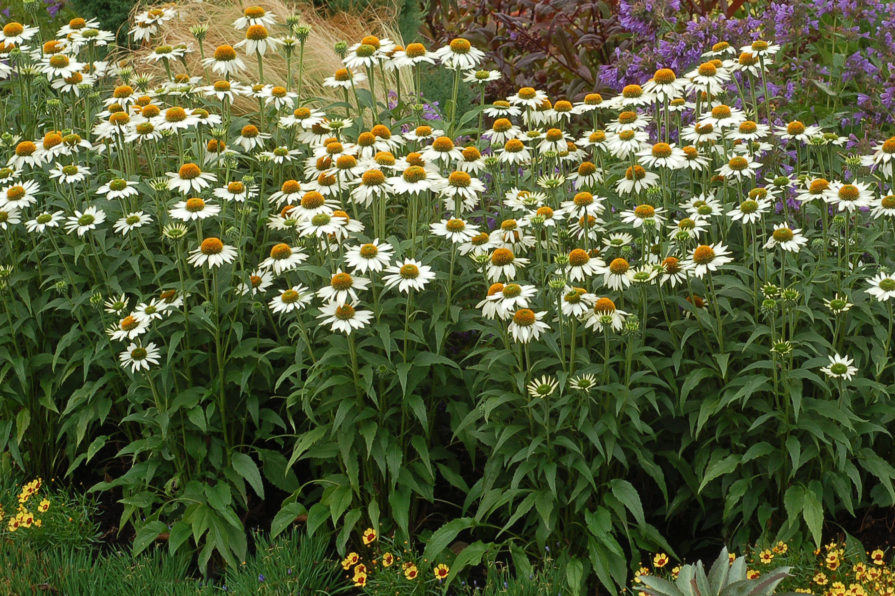 THE GOLD-STANDARD for Echinacea flower & form. Over 25, 4½” blooms on a 1 year old plant after dormancy! Remarkably strong, well-branched, 18-24″ tall plants produce pristine white flowers of superb quality with bright orange cones! Fragrant too. Wonderful in the border or for the cutting garden. Blooms all summer and into fall.