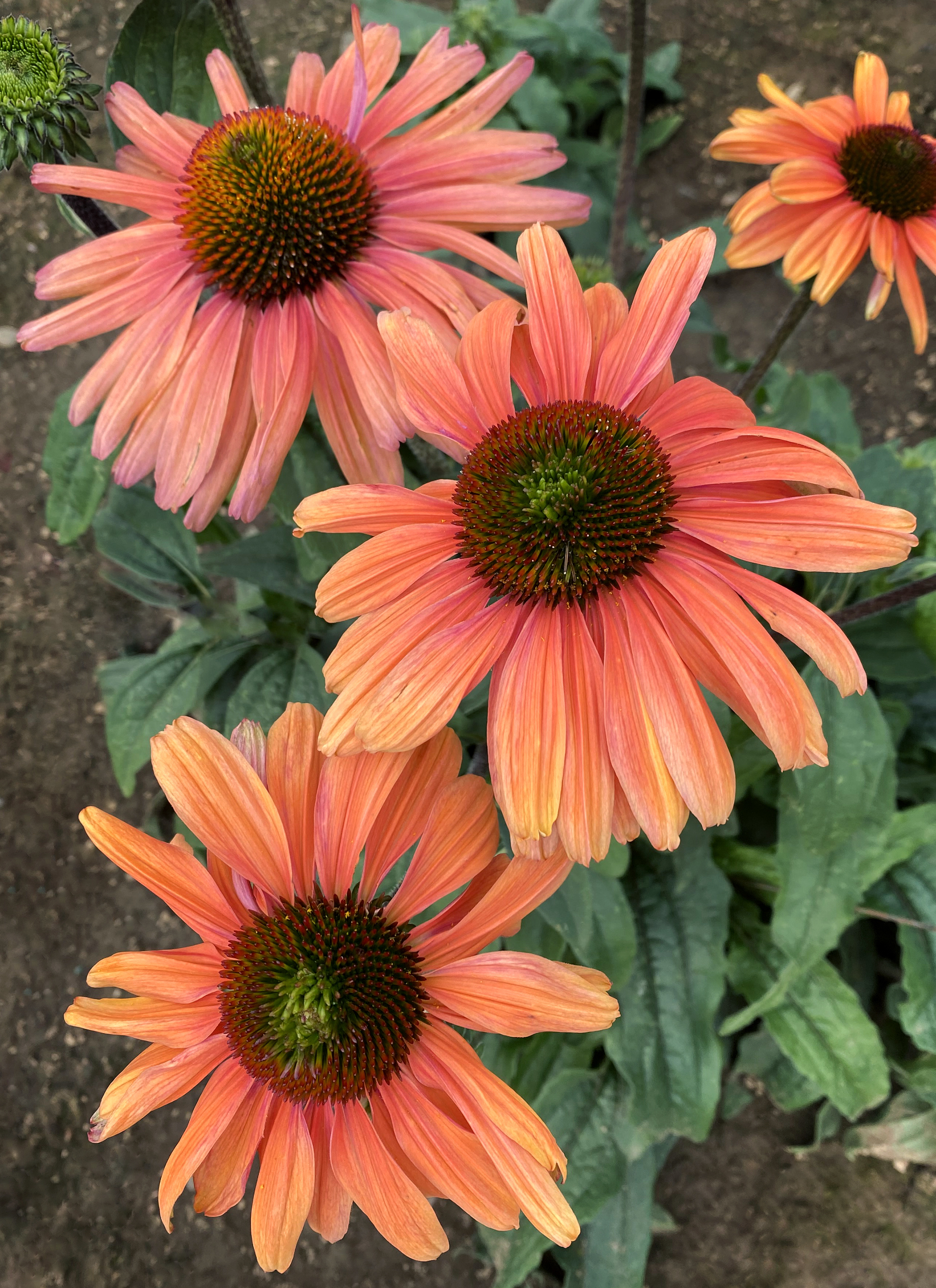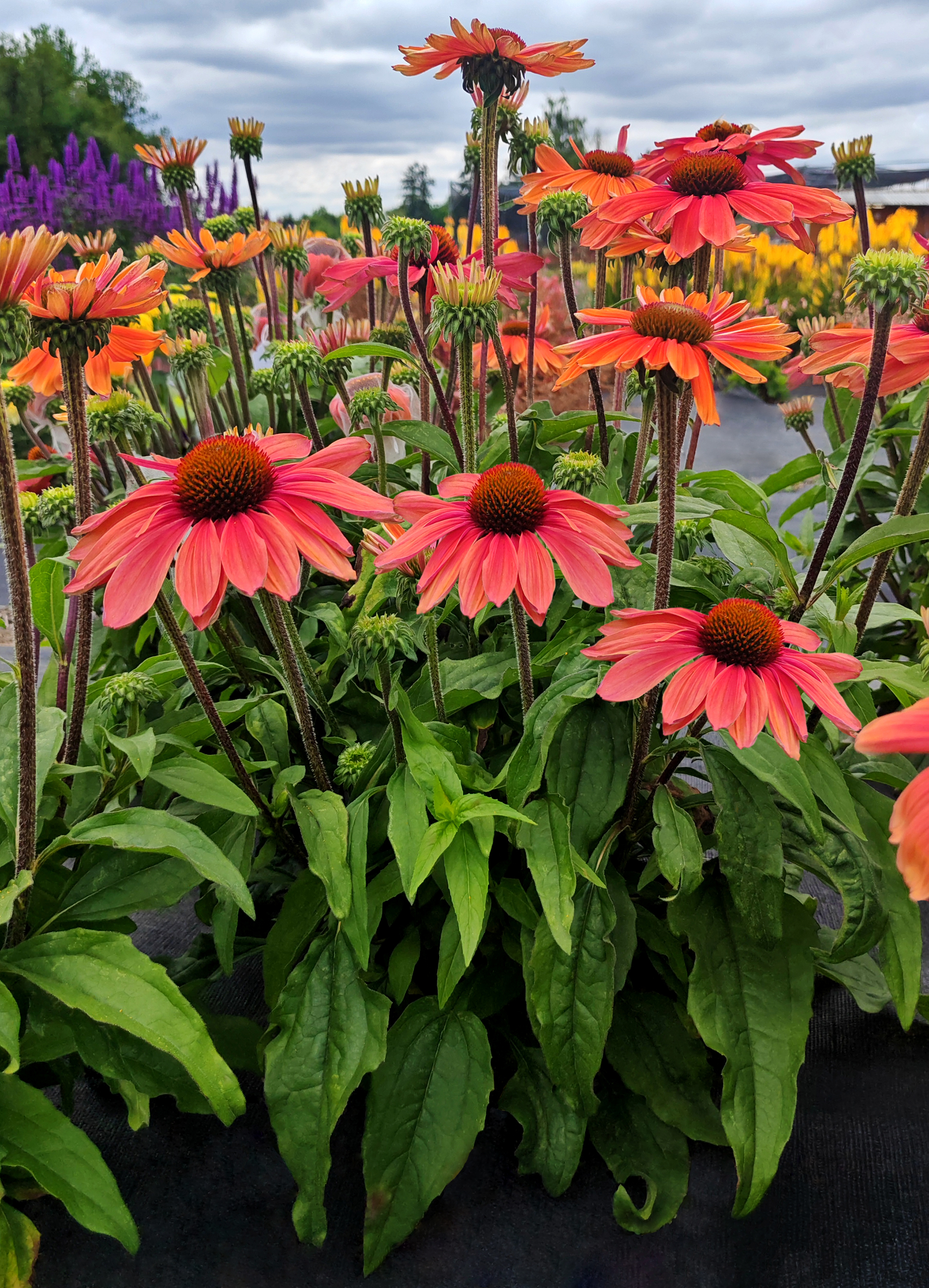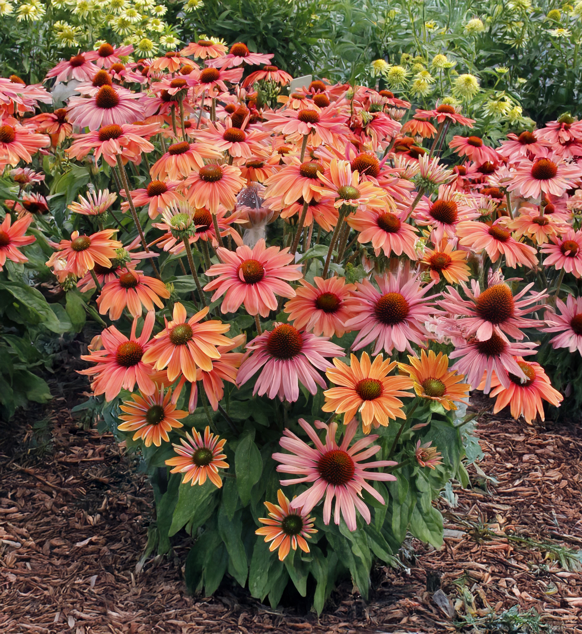 Bred as a landscape plant to have sturdy stems and present a mounding habit with good foliage cover. Like it’s sister, Echinacea REVELATION® ‘Coral’, REVELATION® ‘Monarch’ demands attention inn the garden. ‘Monarch’s’ warm peachy-orange tones light up a garden bed like nothing else. The huge flowers are well scented and attract butterflies, hummingbirds, and all sorts of pollinator insects. The large center cone has hosts of finches visiting in the fall, gathering a snack as they pass through.