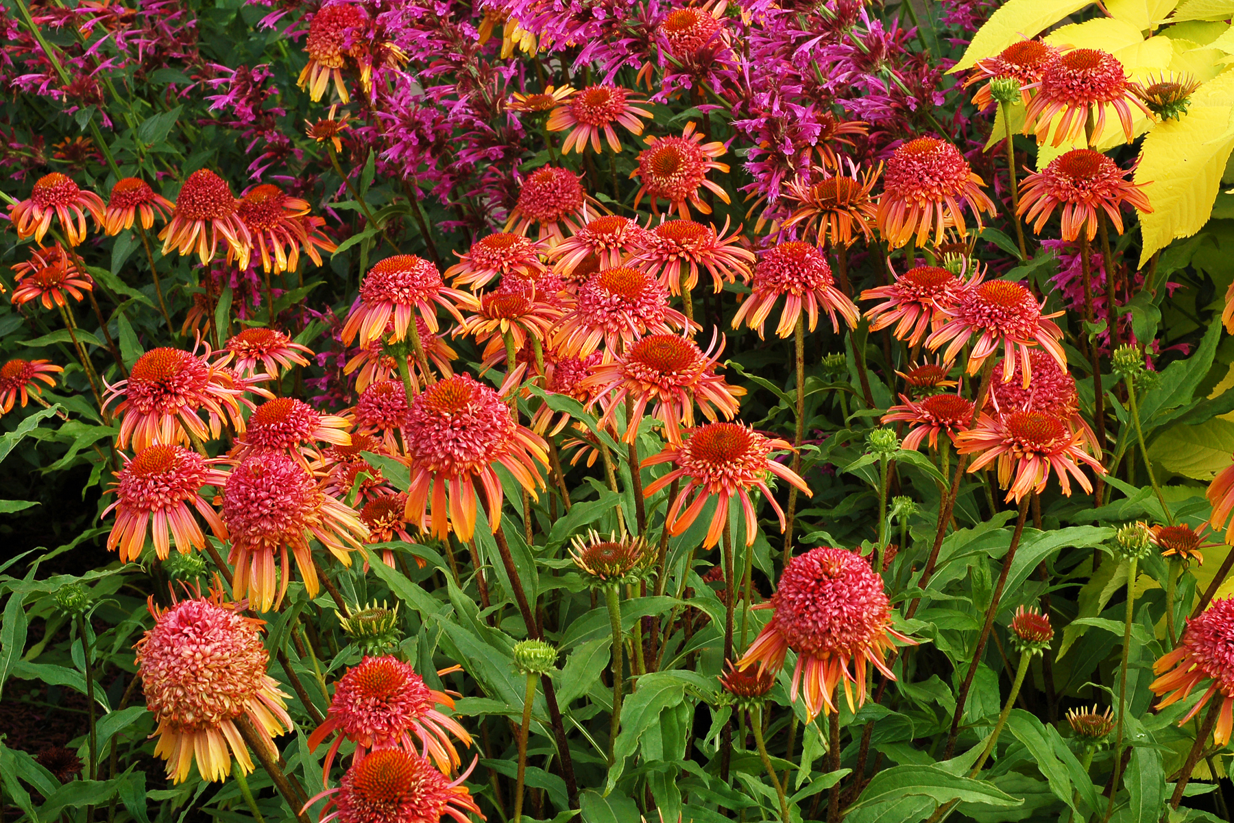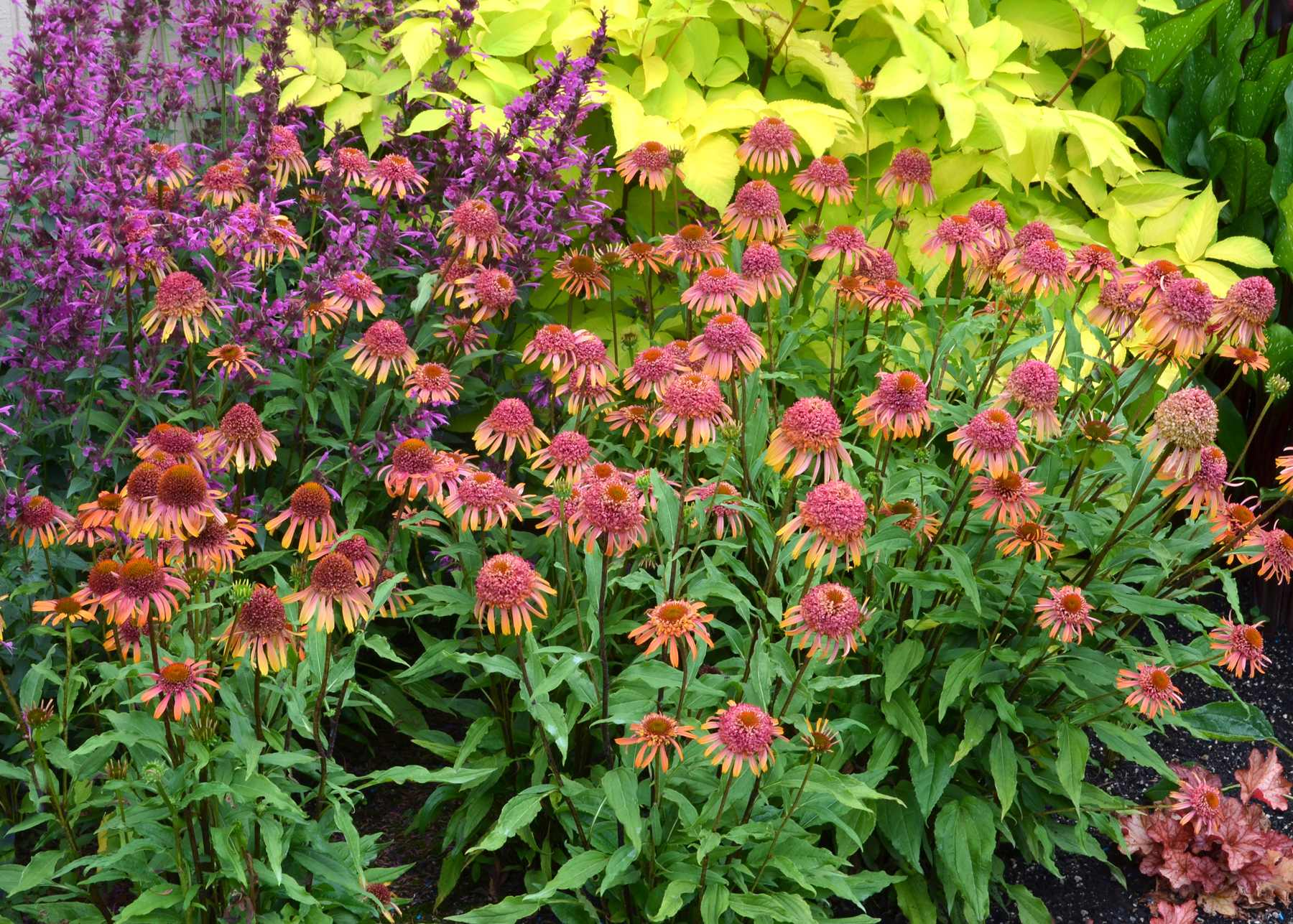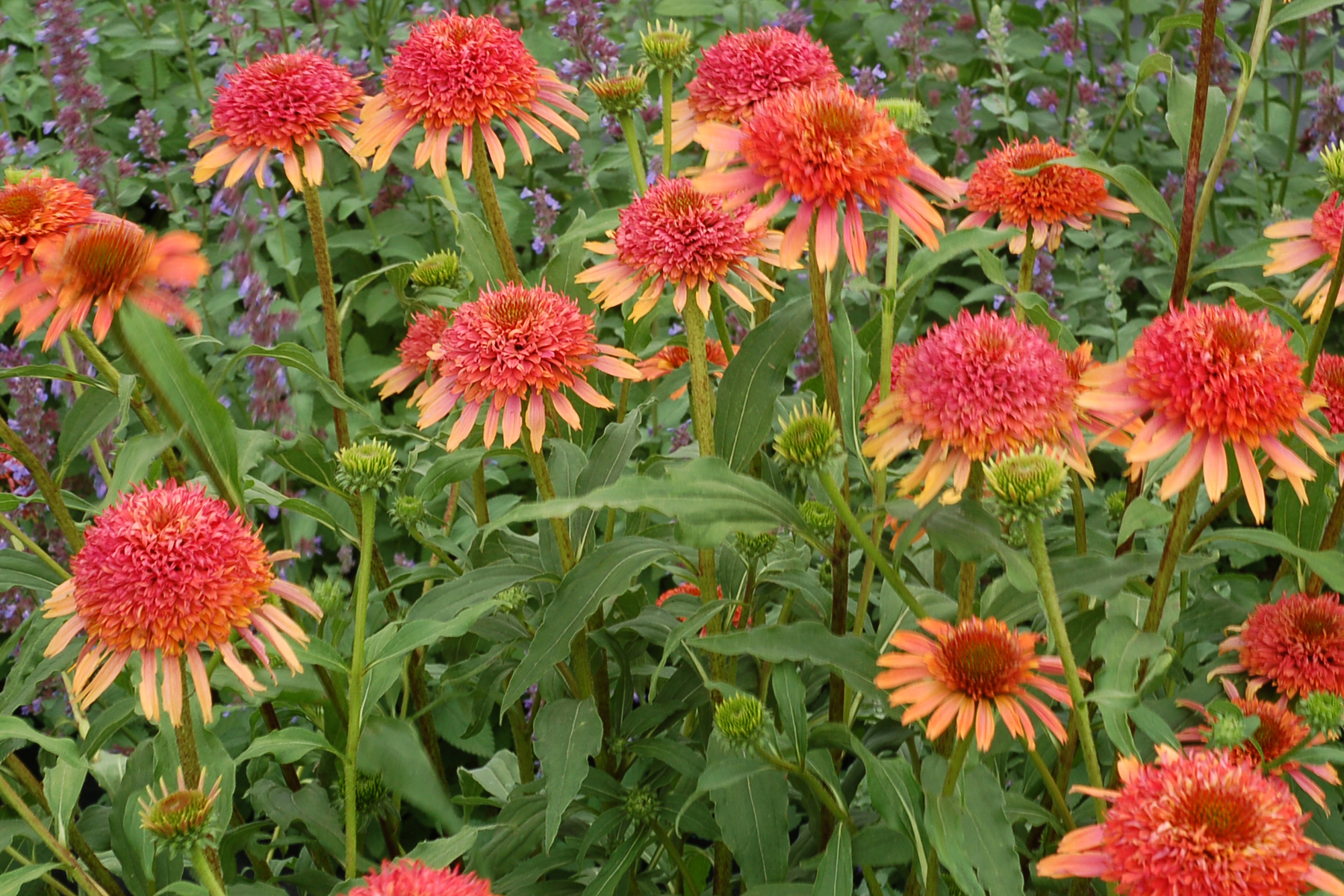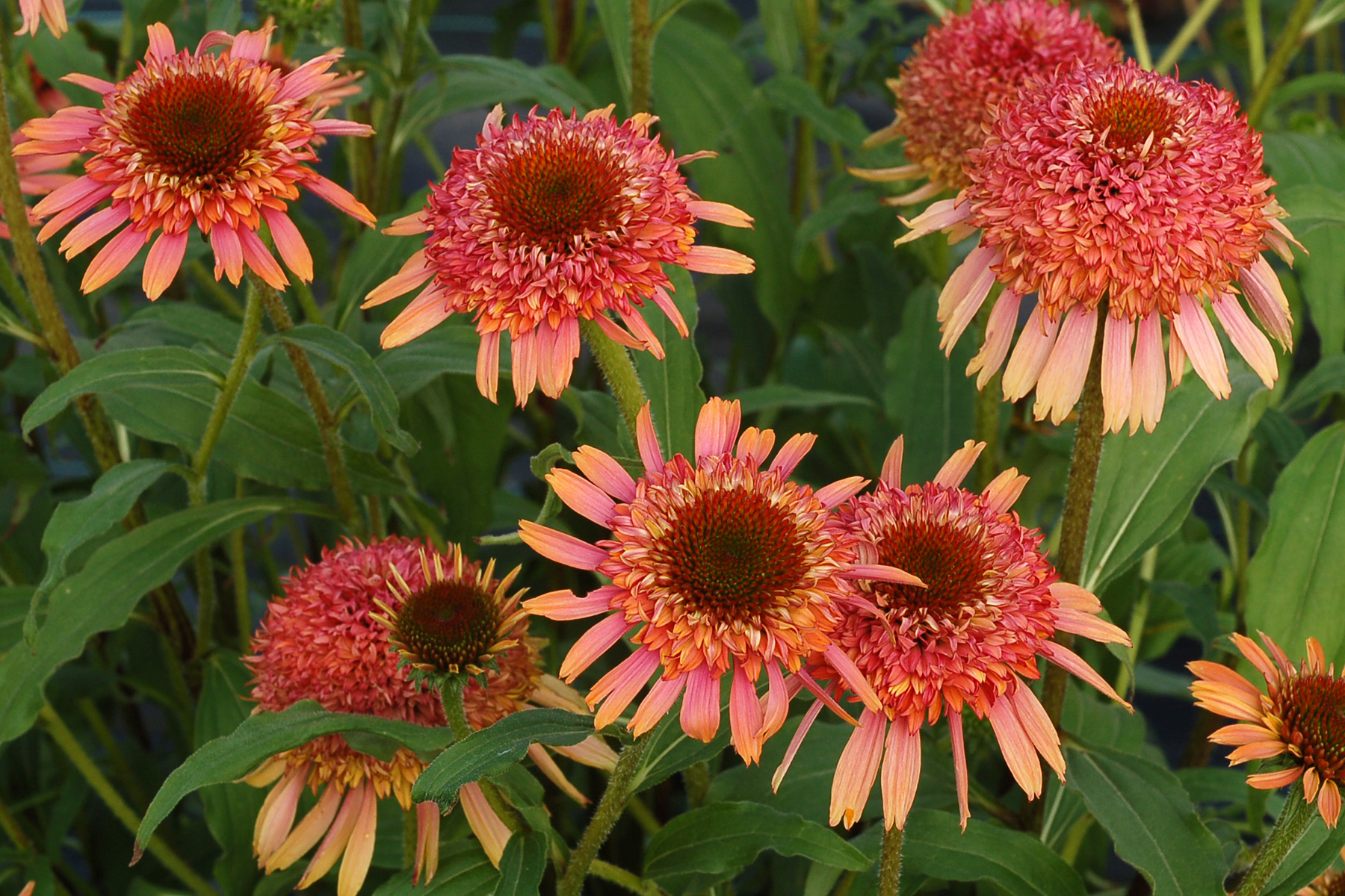 A mid-size Echinacea with double flowers that are very large and multicolored pink and orange. Grows vigorously and forms a full plant quickly.