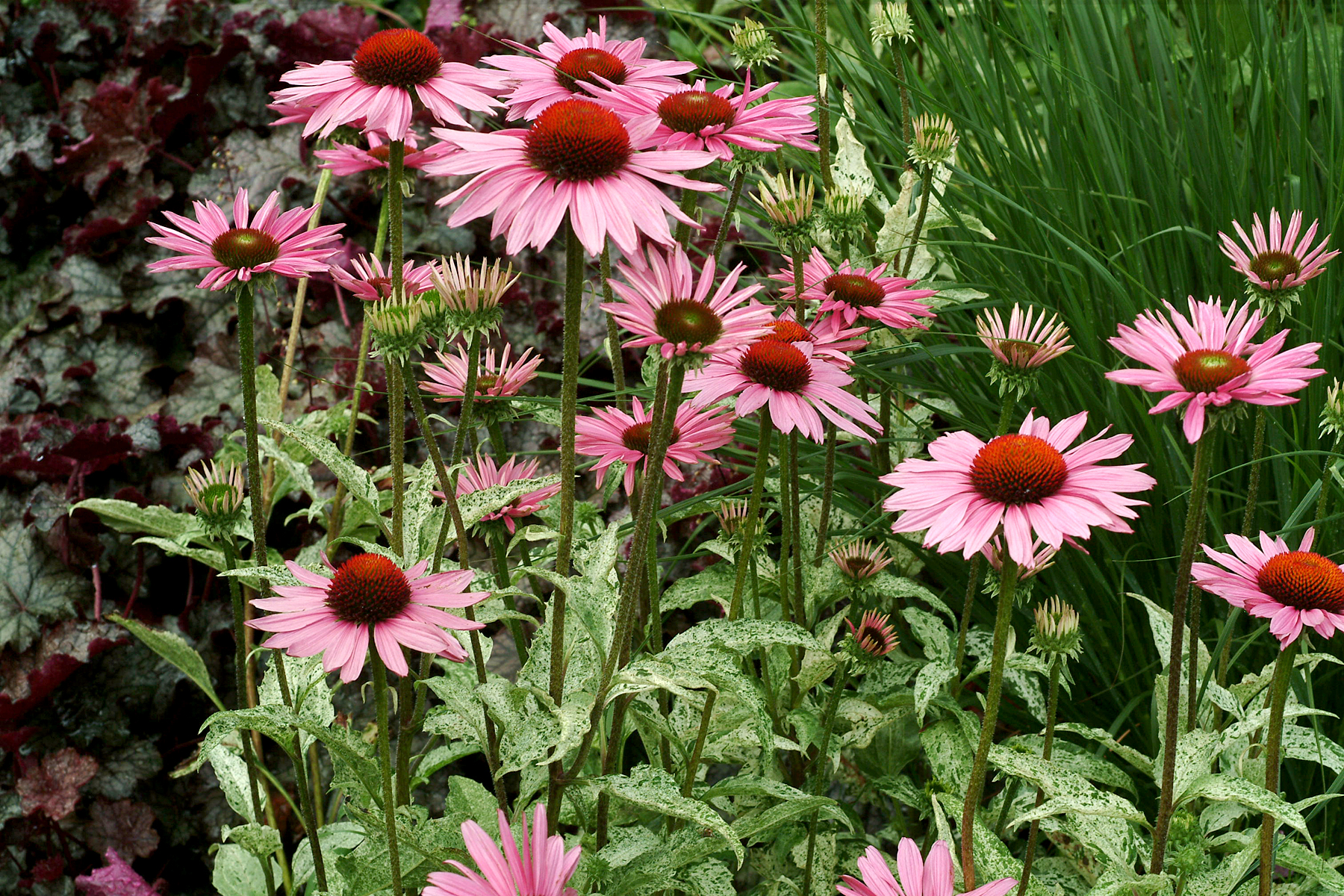 | Comments | Flower color deepens during cool weather conditions. This plant, due to it variegation, is not as strong and rapid growing as other Echinacea. |