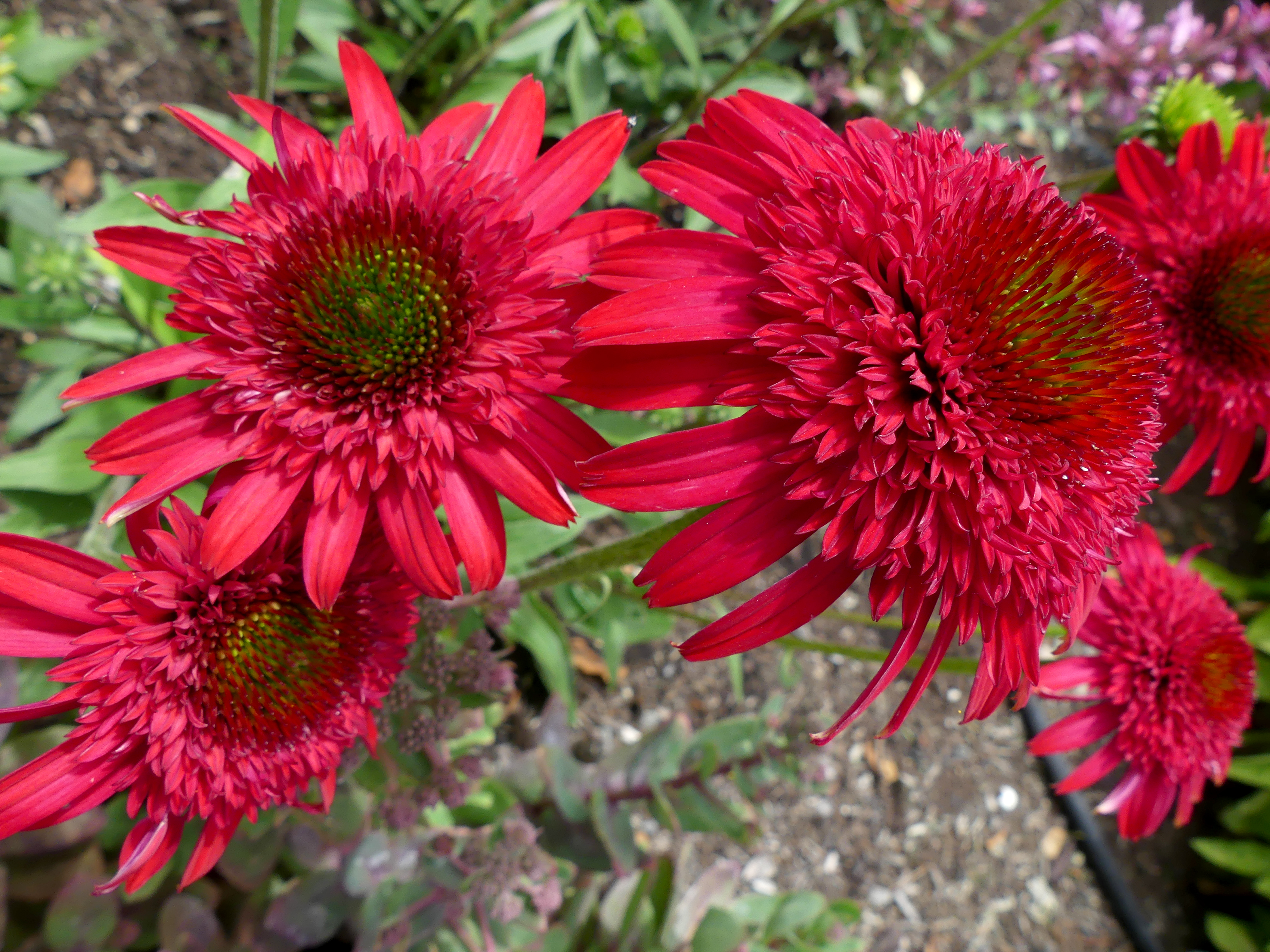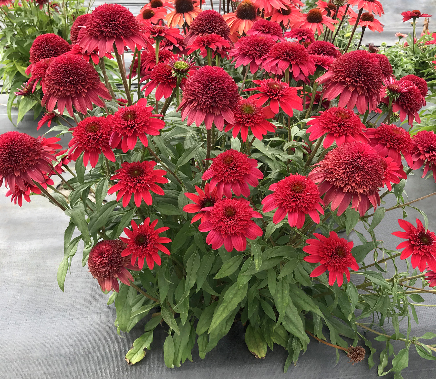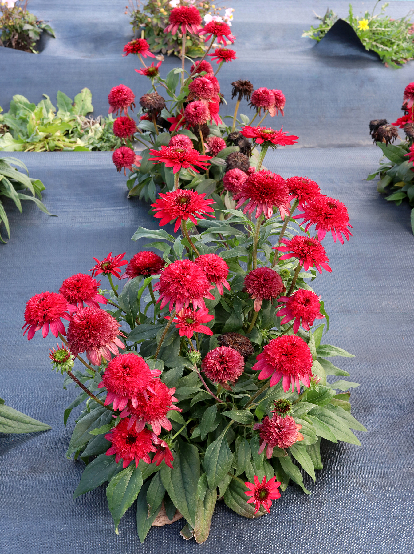 Stout stems support over-sized double, ruby colored flowers. A wonderful and rugged addition to the new SUNNY DAYS™ series of double flowered, garden worthy Echinacea from TERRA NOVA®. An overachiever in all areas; performance, color and flower size. A true claret-ruby that has little color shift.