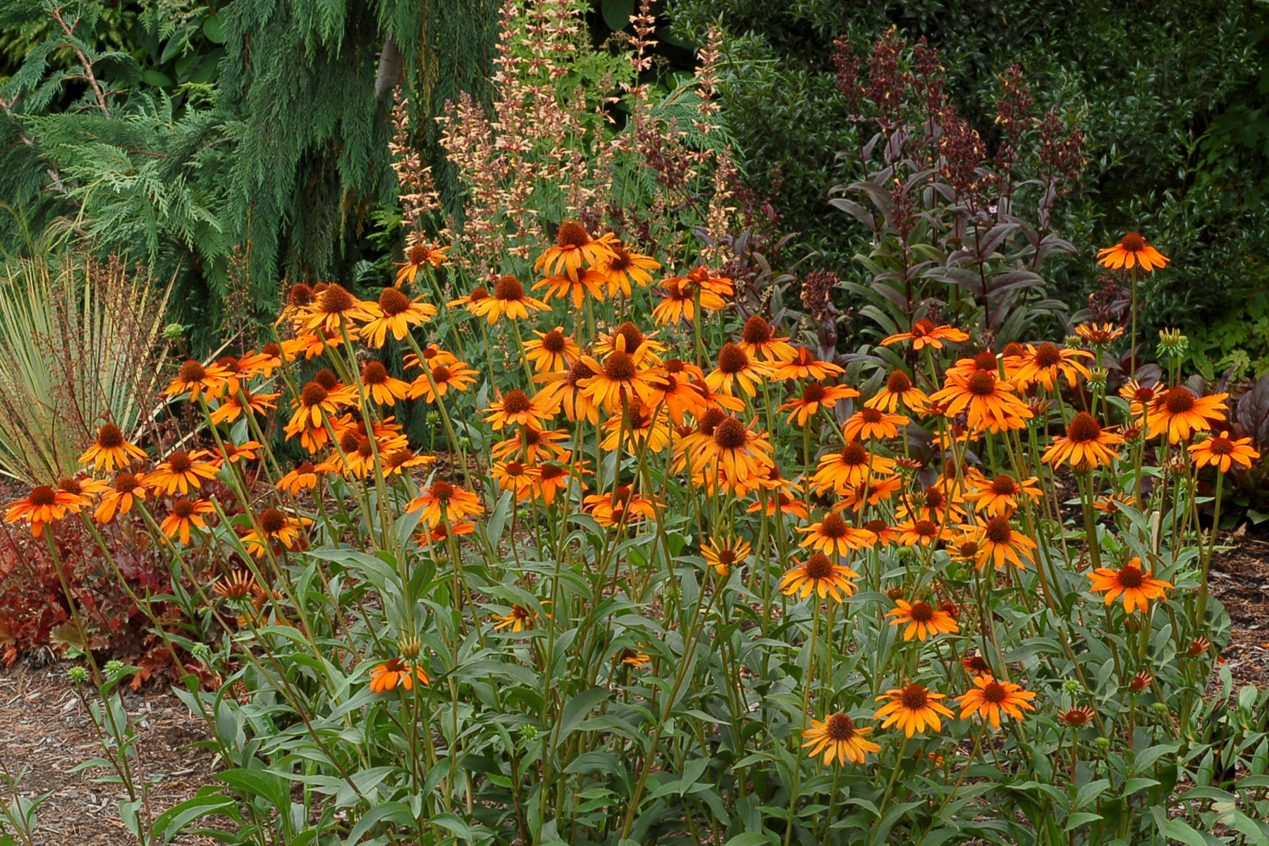 This dark orange coneflower explodes with massive 4½” flowers with wide petals. 'Tiki Torch' retains its intense color for weeks rather than days. The spicy-scented blooms sit atop strong and upright 36″ stems. Use for the border and for cut flowers. Easy to grow. Ignite this flaming dream! Winner of multiple awards.