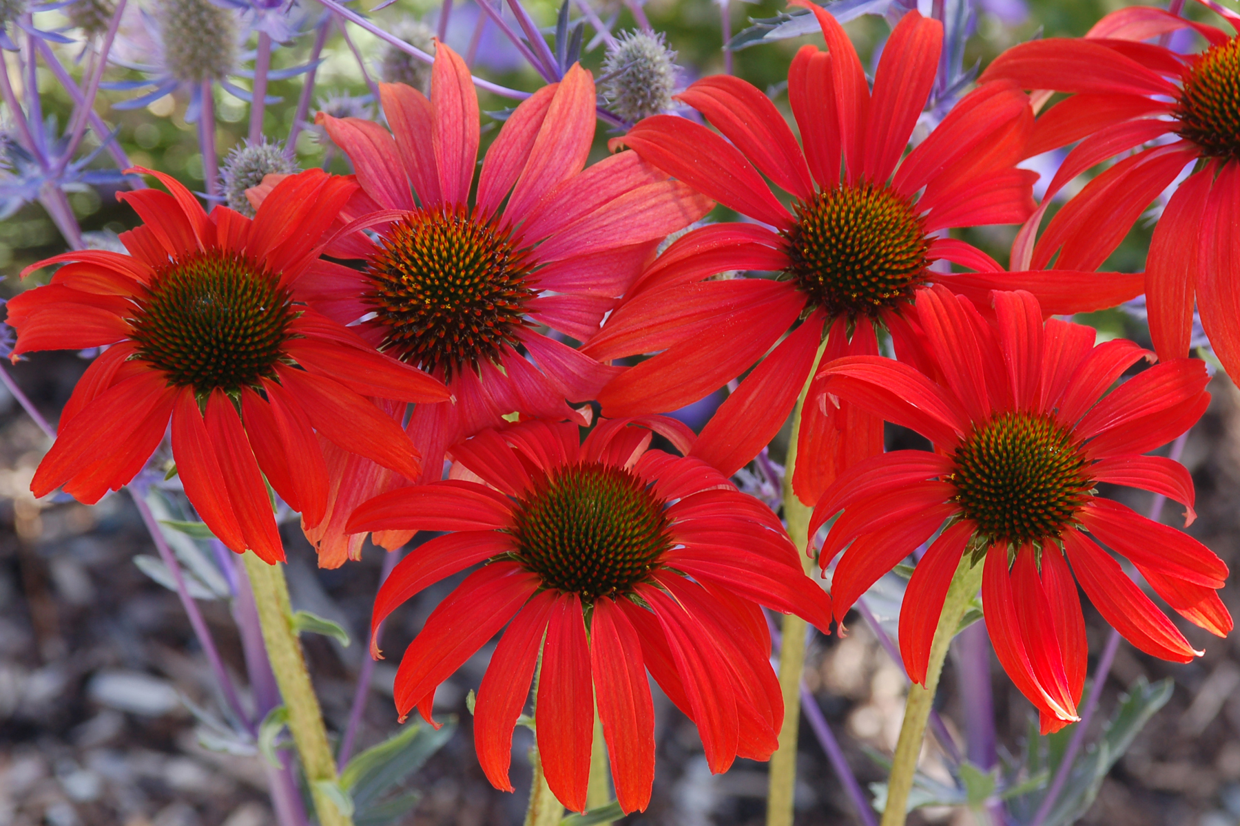 Warm, tomato-red flowers to 6″ wide stunned our nursery visitors! A real treat which grows to 32″ tall and nearly as wide. Flowers will cover this selection 'til frost! Plants are well-branched and show excellent vigor. A natural pairing with E. 'Mac 'n' Cheese' or 'Now Cheesier'.
