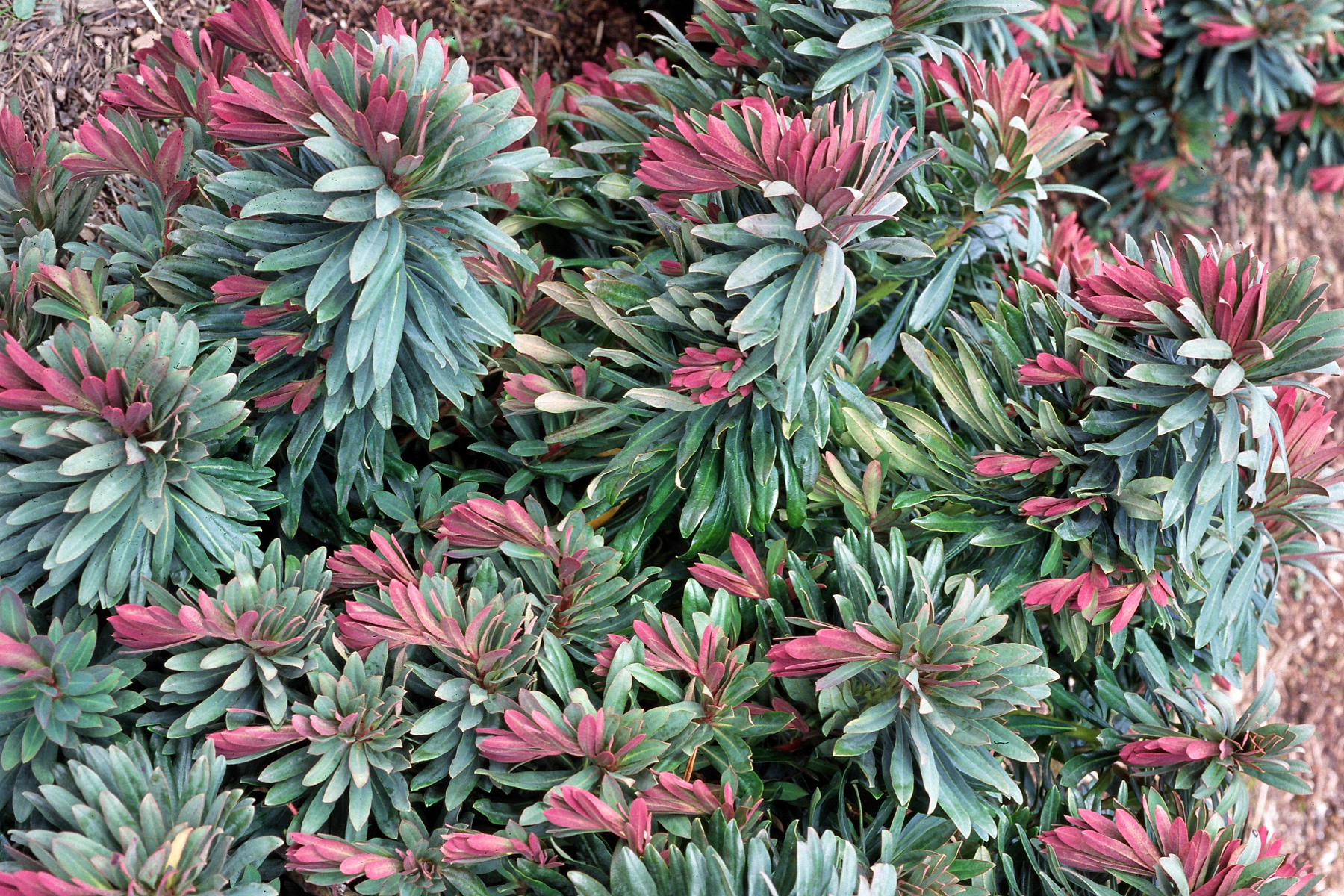 This evergreen has long, blue-green leaves that emerge red-purple in the spring. 'Jade Dragon' is robust, compact, bushy, and deer resistant. The summer blooming flower heads are huge and bright chartreuse. 'Jade Dragon' came from a cross between E. characias ssp. wulfenii and E. amygdaloides 'Rubra'.
