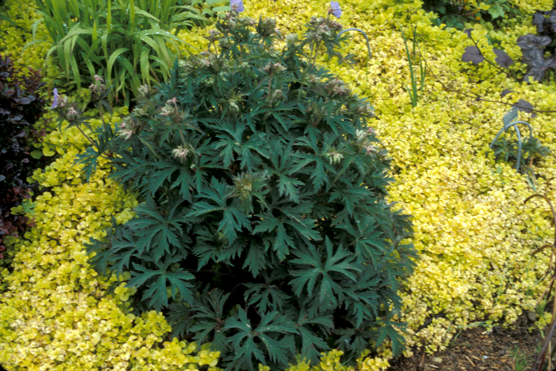 This Geranium has purple foliage in spring and later turns dark green with a purple edge and a compact habit with large deep blue purple flowers. This plant is four times larger then 'Midnight Reiter'.