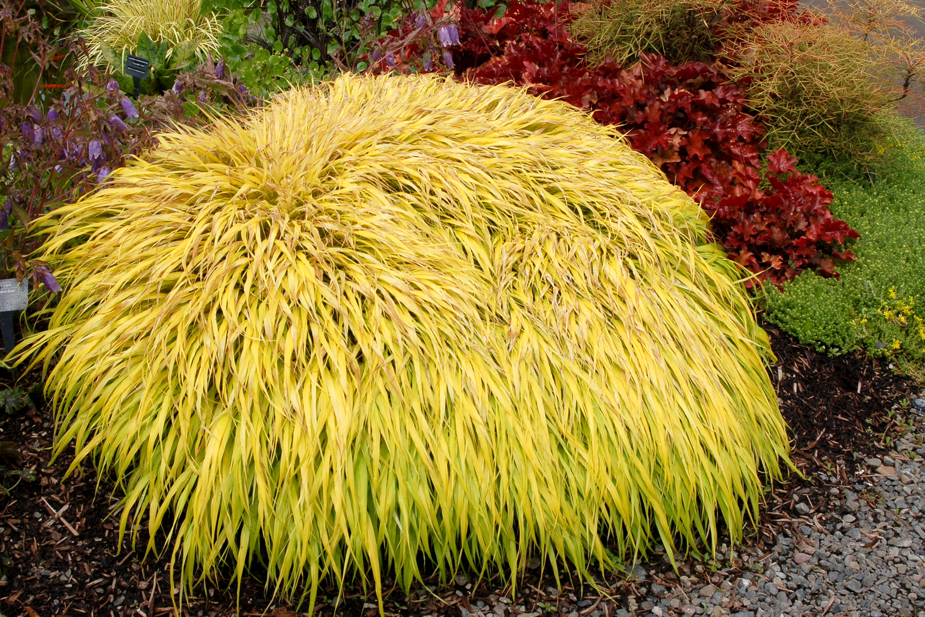 This gleaming, metallic gold “Forest Grass” holds its brilliant color all summer before turning tan in winter. The leaves are upright, spiky and are awesome in containers! Dan saw this glowing in the morning sun while visiting Suzuki-En in the Kowaguchi area of Japan.