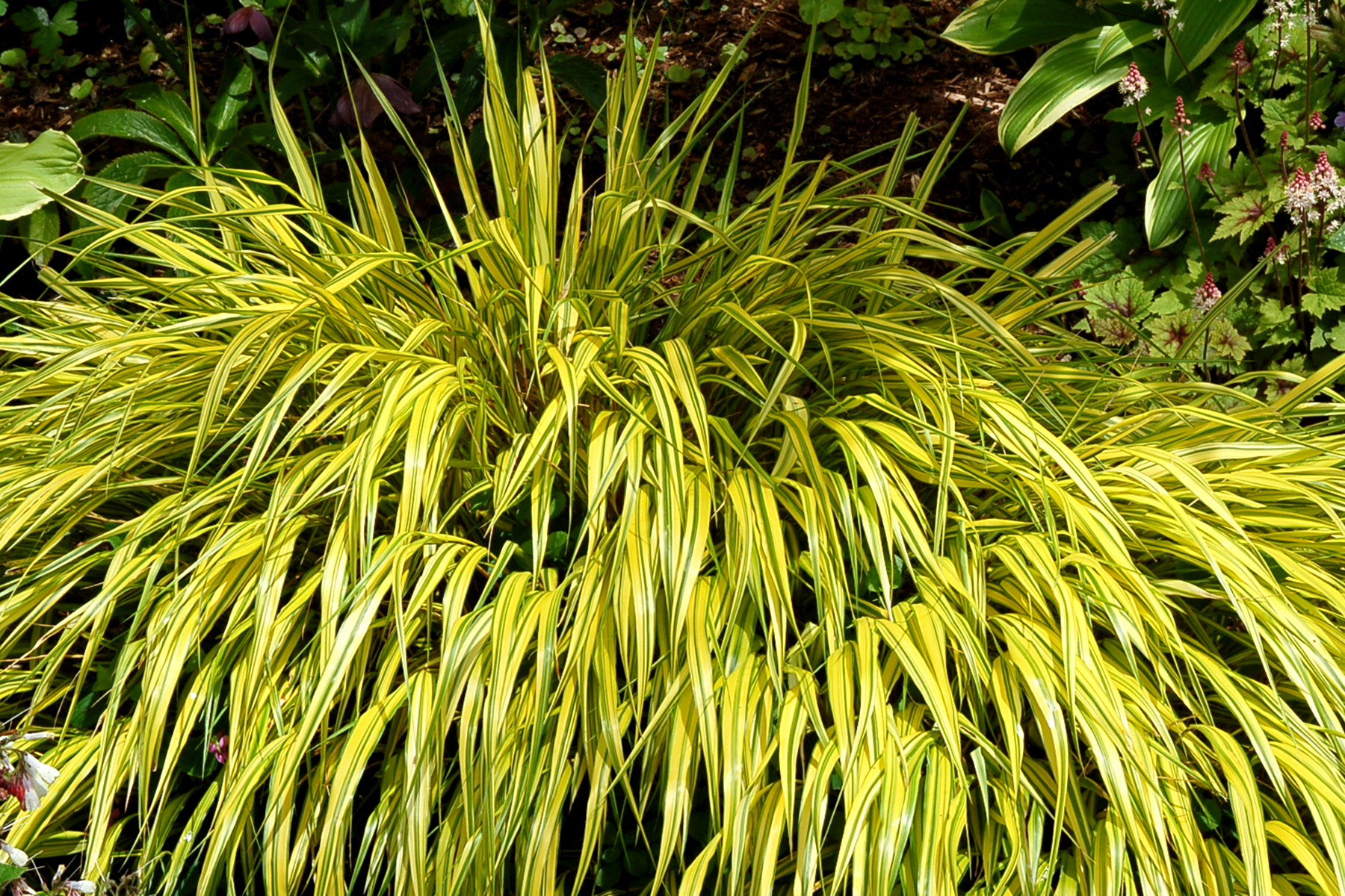 Surprisingly, this form of (haw-koh-nay-clo-ah) is harder to find than the variegated forms! THE grass for shady locations, this Japanese gem is outstanding between Hosta. They lend peace and grace to streambeds or along pathways in the shade garden. We grow it in the Pacific Northwest in full sun as well. Nice in containers too.