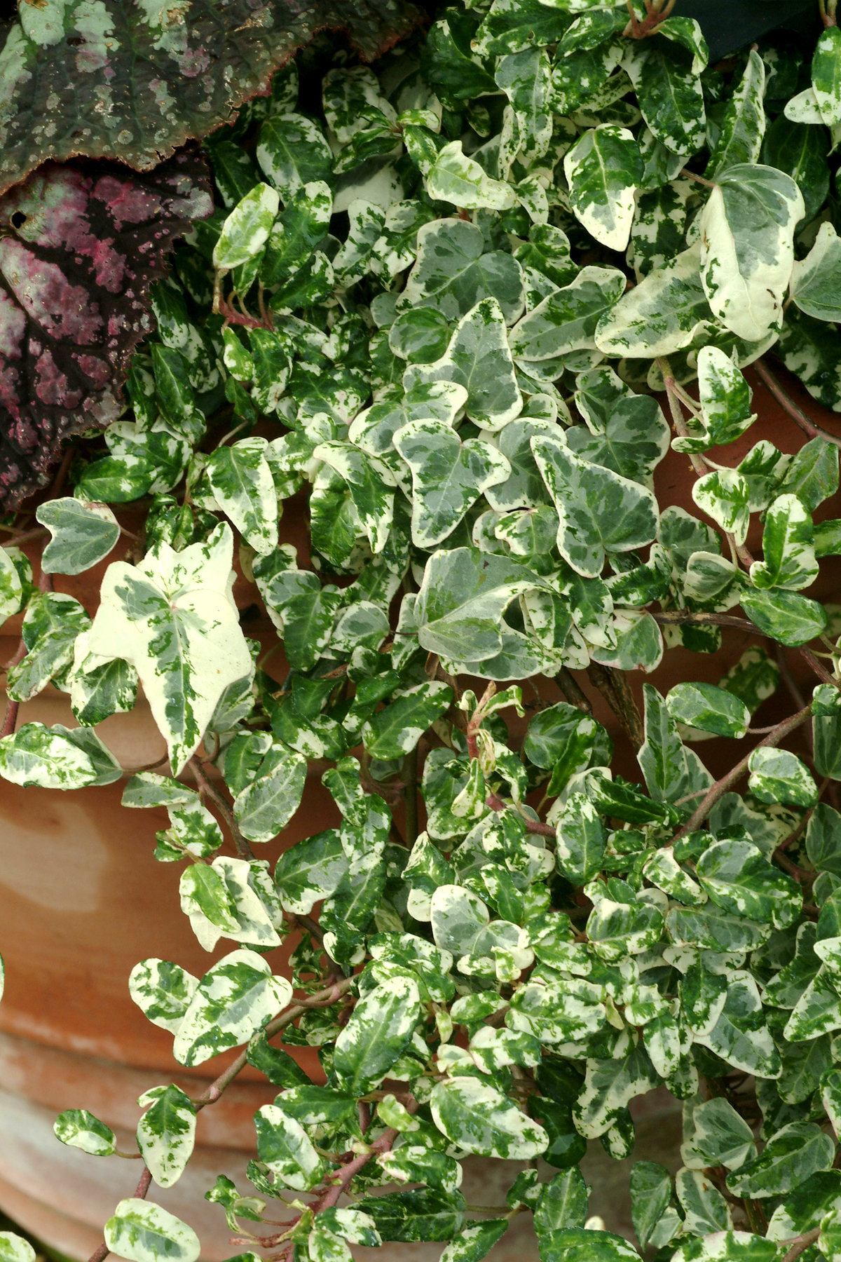 This Hedera has white variegation splashes across the dense foliage, pink stems and tiny little leaves. A lovely ground-cover for a shady area.