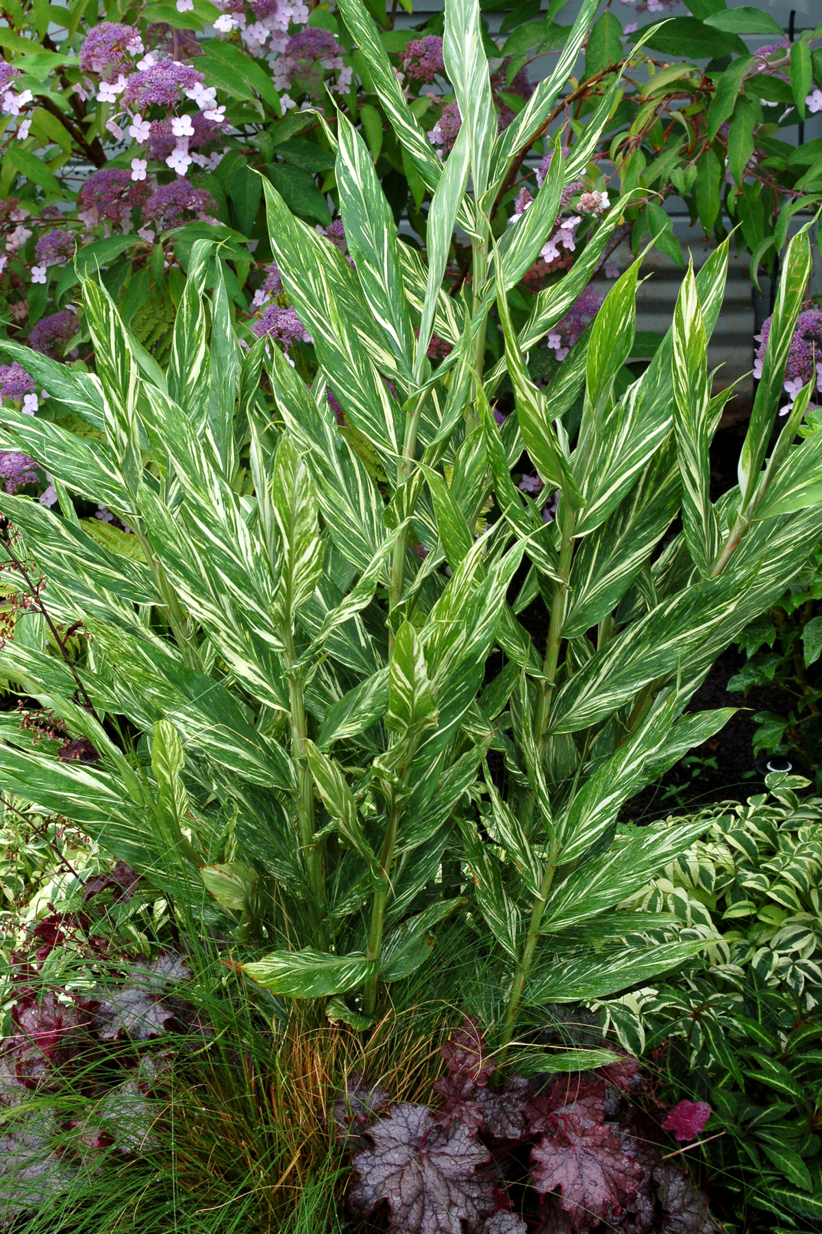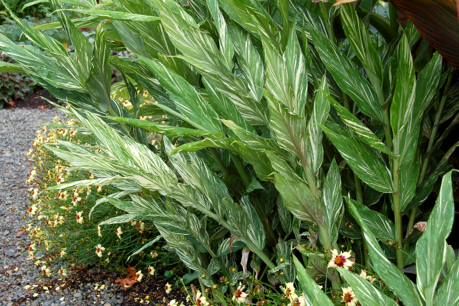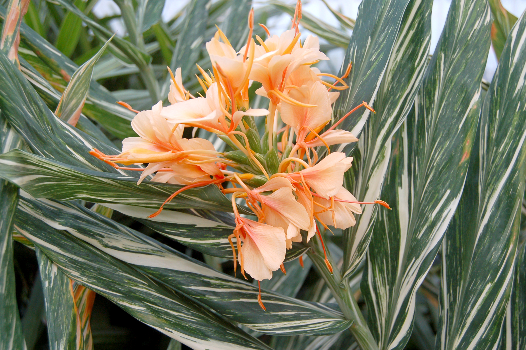 Make a Hawaiian splash with this boldly variegated hybrid ginger. Intoxicatingly fragrant apricot flowers emerge in midsummer and continue thru fall. The upright habit of 'Tahitian Flame' creates a wonderful architectural accent for both containers and gardens.