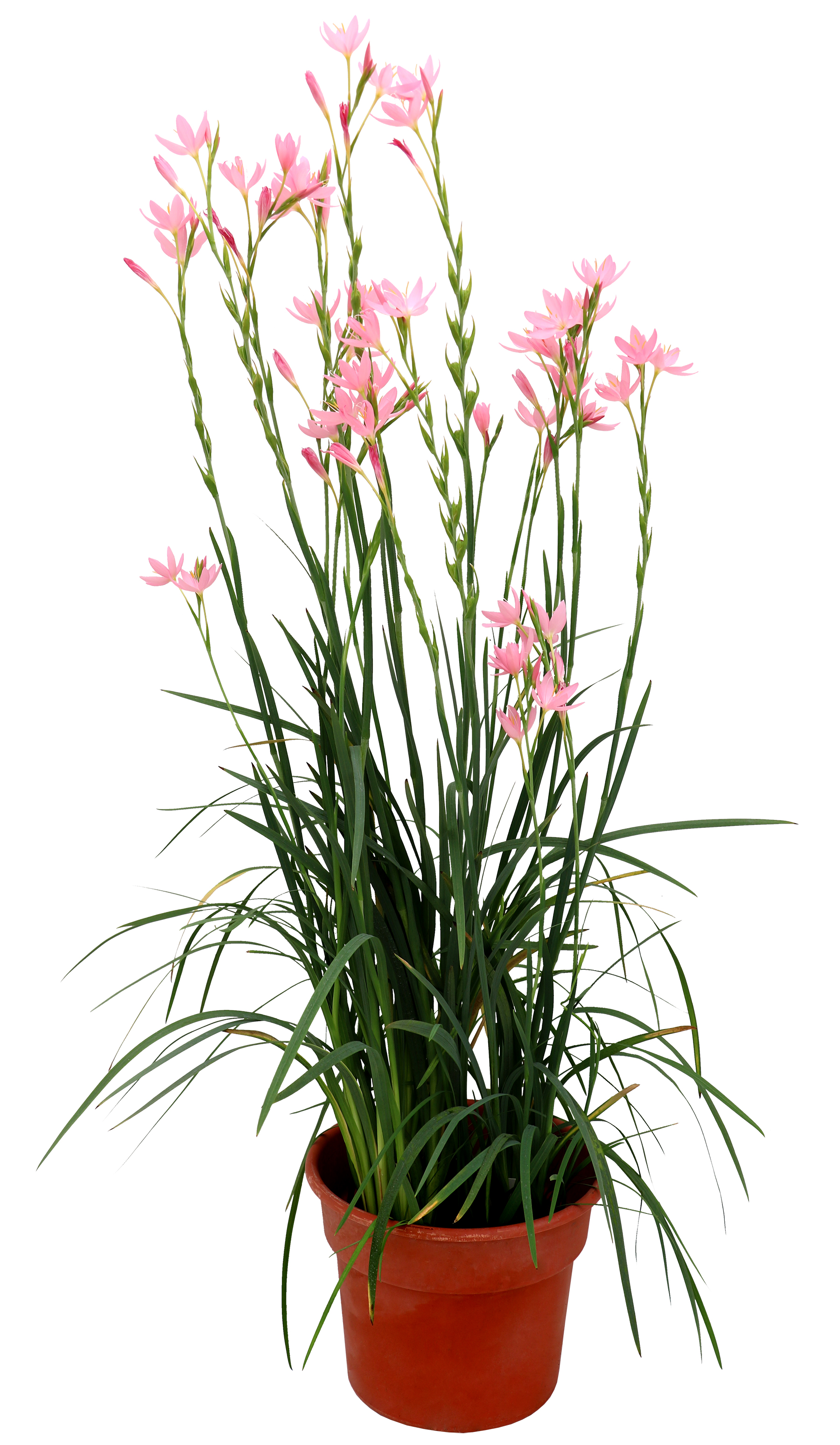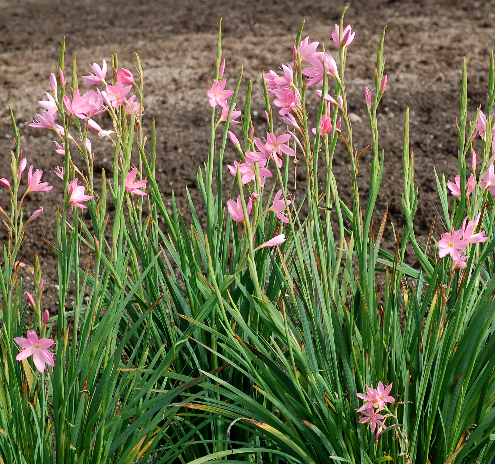 The ROULETTE™ series were bred for multiple crowns quickly, fast bloom time, multiple bloom, short inflorescences, and good bloom size. ROULETTE™ Pink has pink flowers. Hesperantha bloom in the fall and early winter.