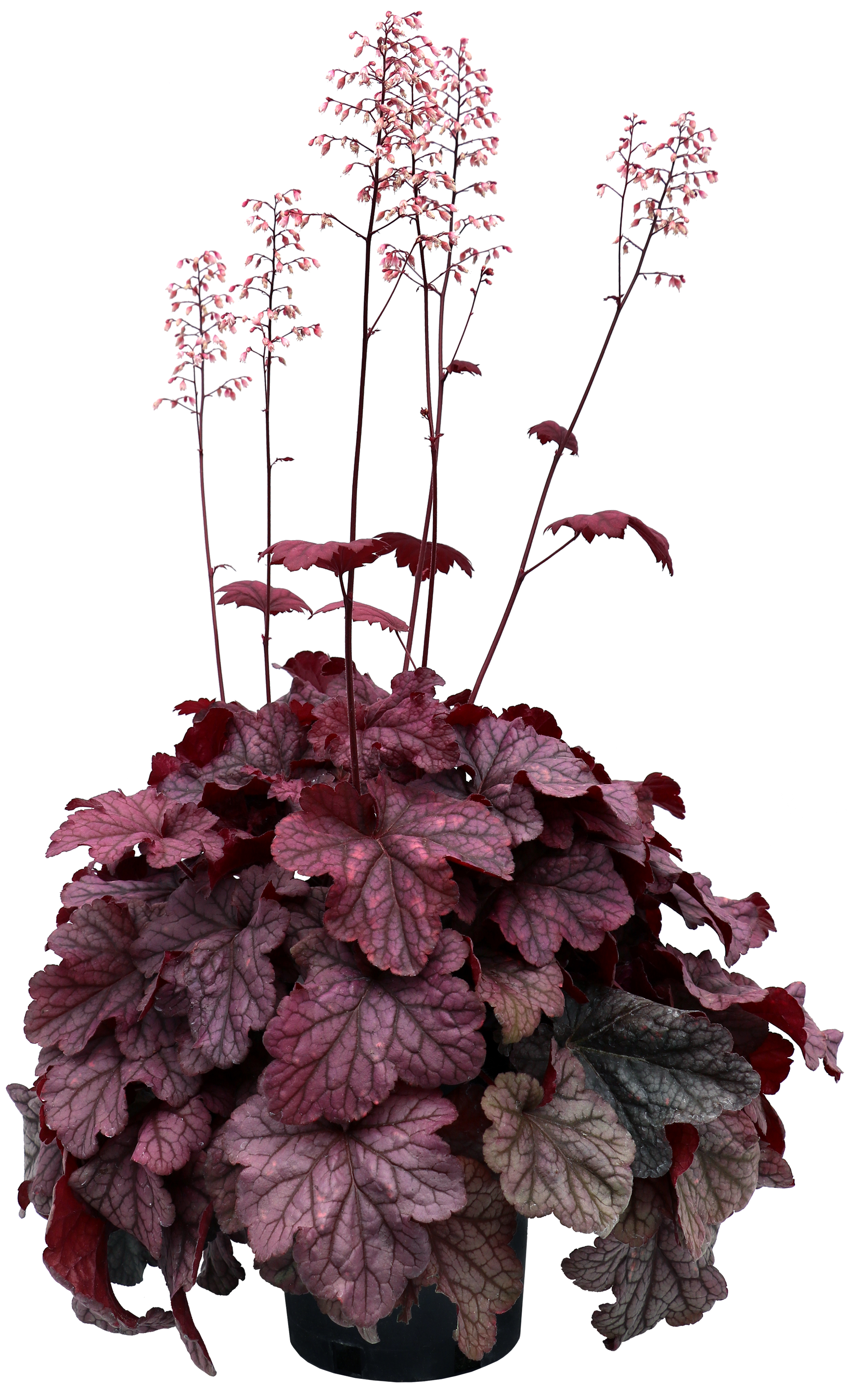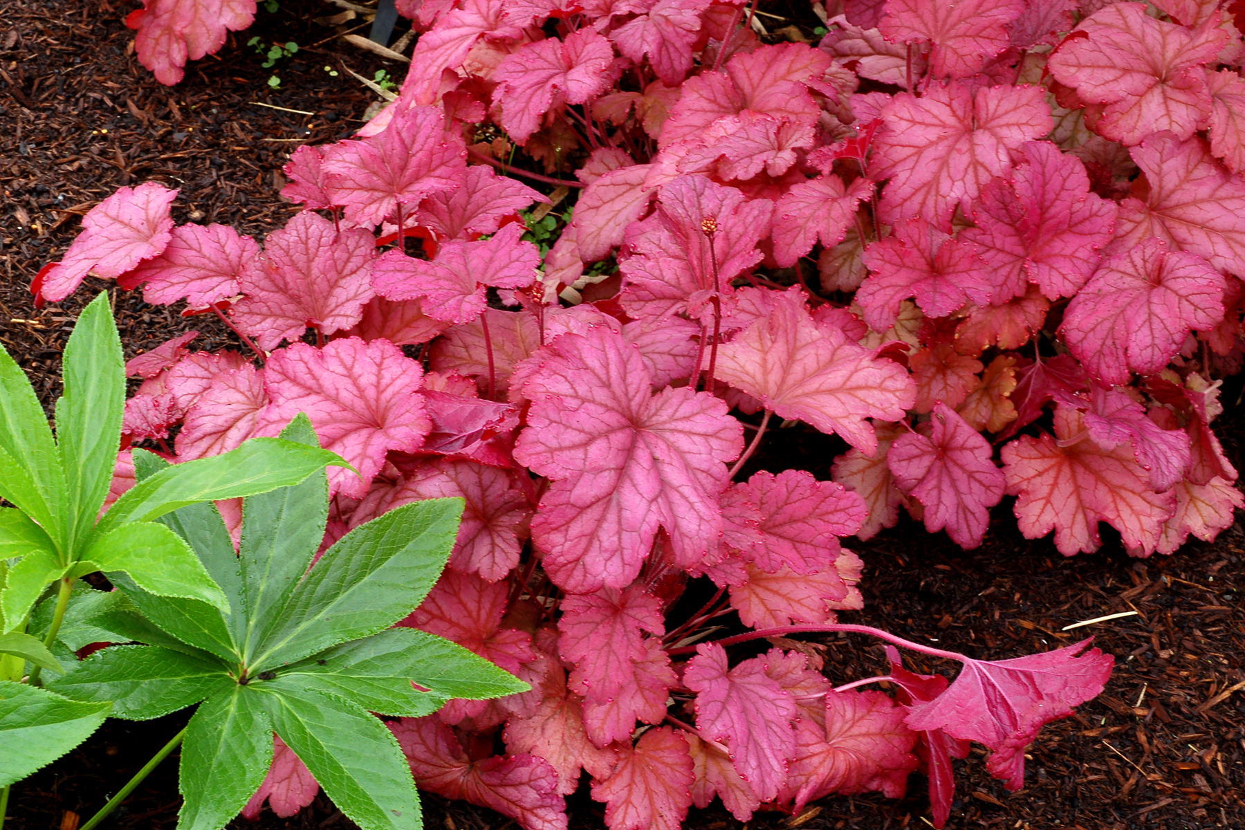 Bold round leaves emerge in spring the color of, well, its namesake! Metallic rose-pink leaves have both H. villosa and H. americana blood, so heat tolerance is a given. For a tasty combo, combine it with cool-blue leaved hostas. Truly four seasons of foliage interest. An award winner!