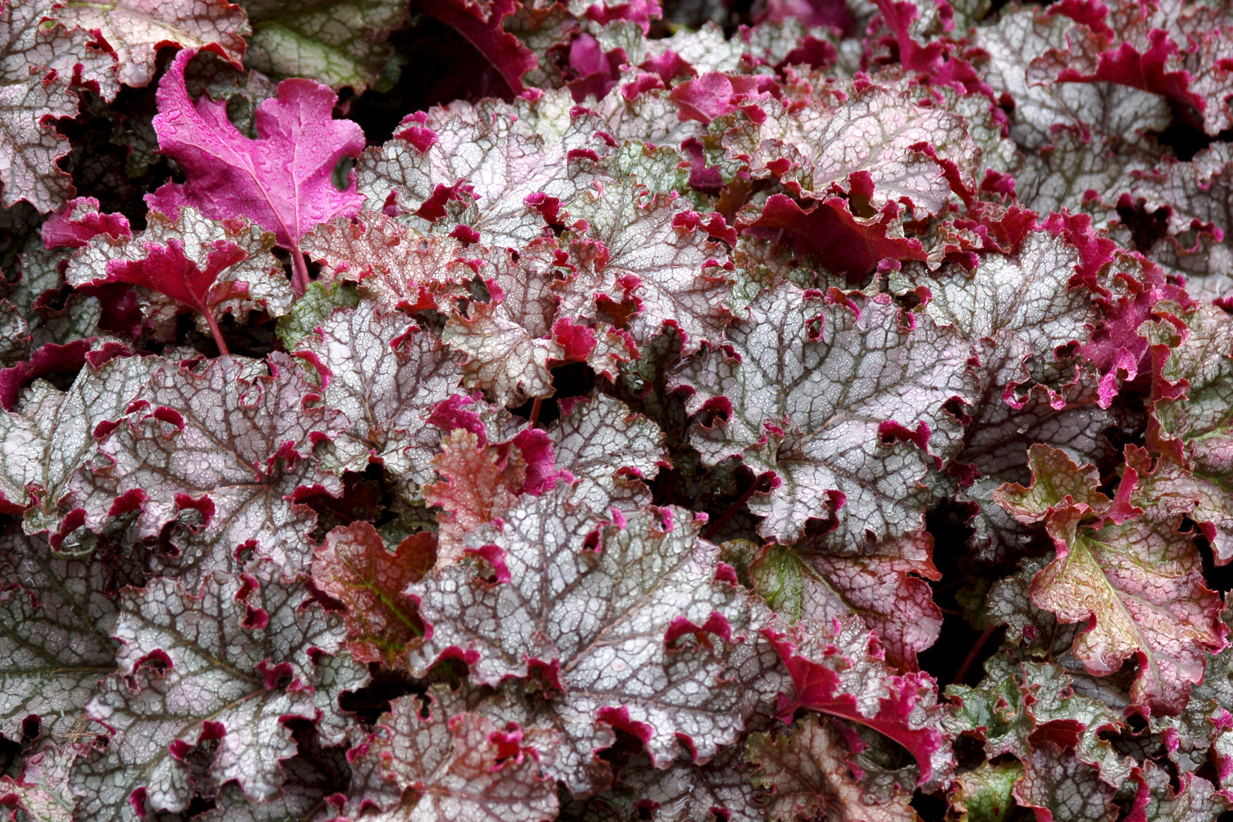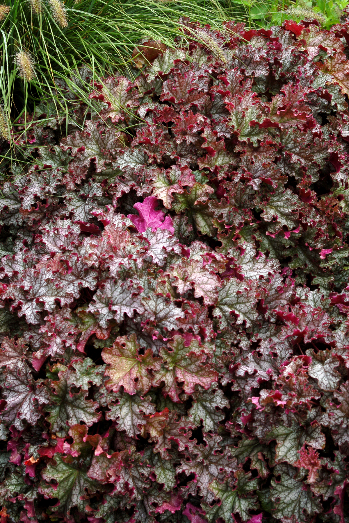 This amazing plant has wavy leaves and strong silver veils over dark foliage making this interesting Heuchera a winner. It forms a tight ruffled mound with jagged edges and is attractive year around. A gold metal winner!