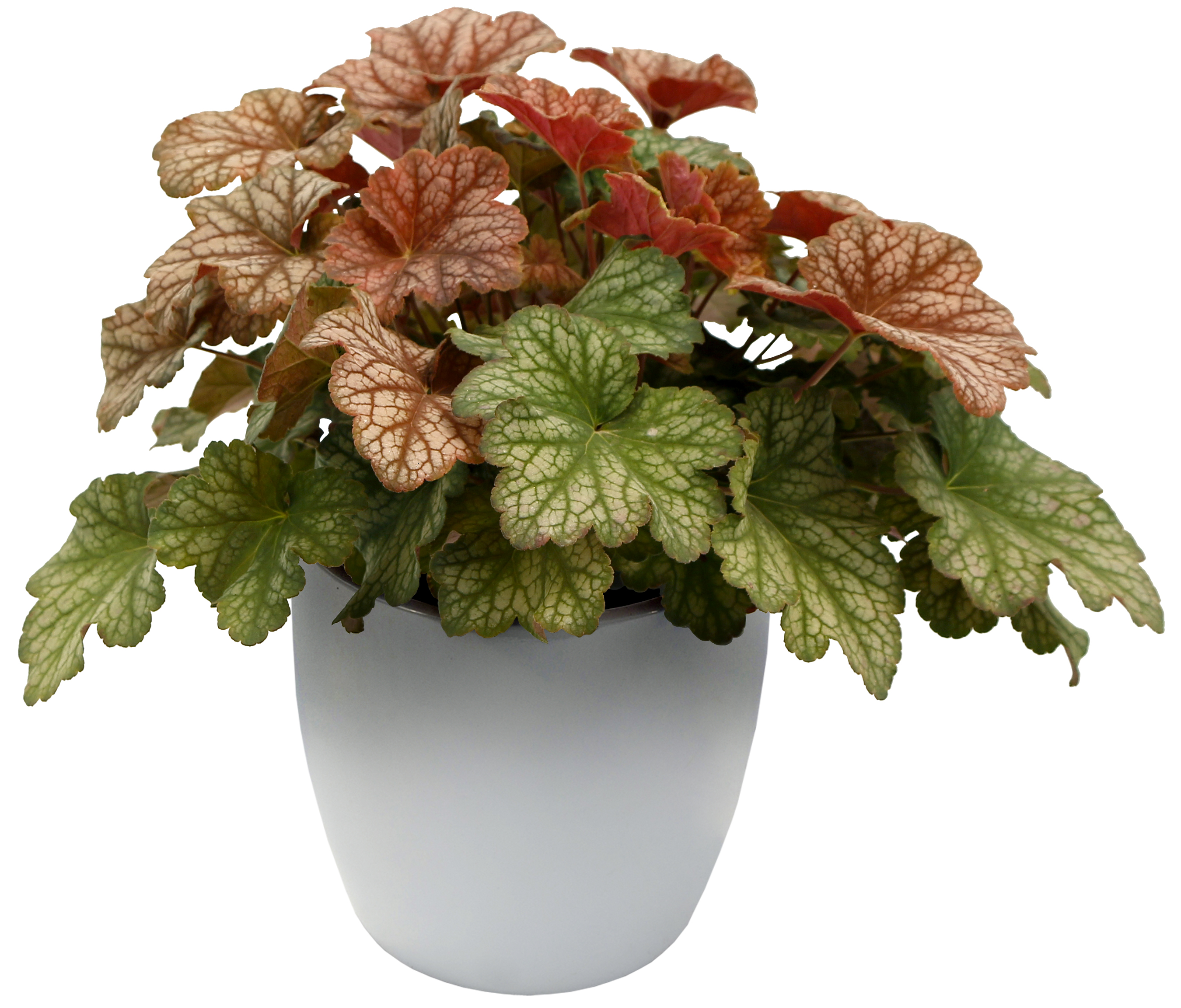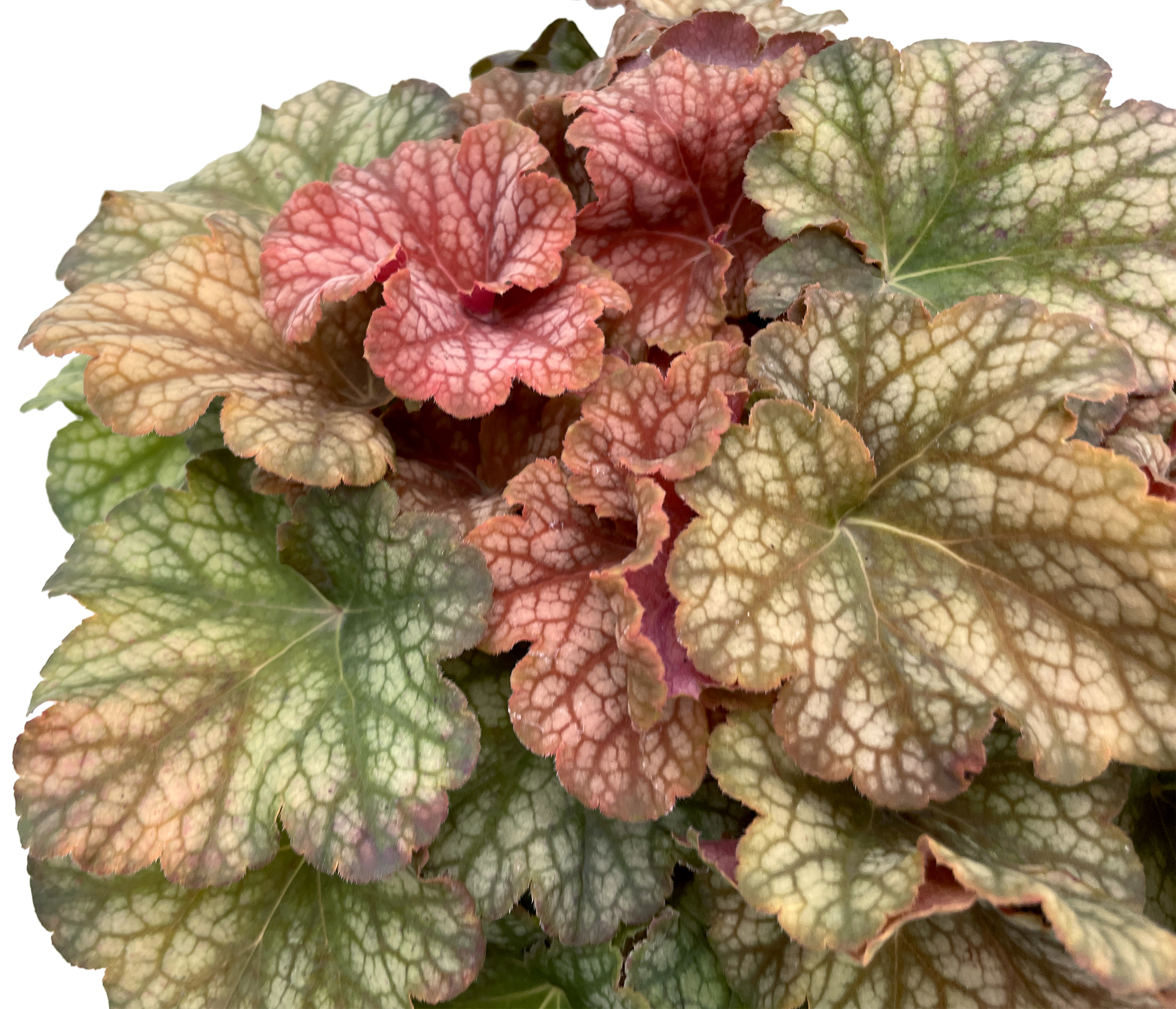 A most curious Heuchera! 'Changeling' is so named because of the unique characteristic of changing colors every week or so. From top to bottom, new color emerge. New foliage starts off blushing peach and cherry and changes to champagne and taupe, finally ending up several shades of celadon green, pine, and moss. The strong H. americana bloodline enhances this plant with a sharp, silver veil that highlights the contrasting veins.