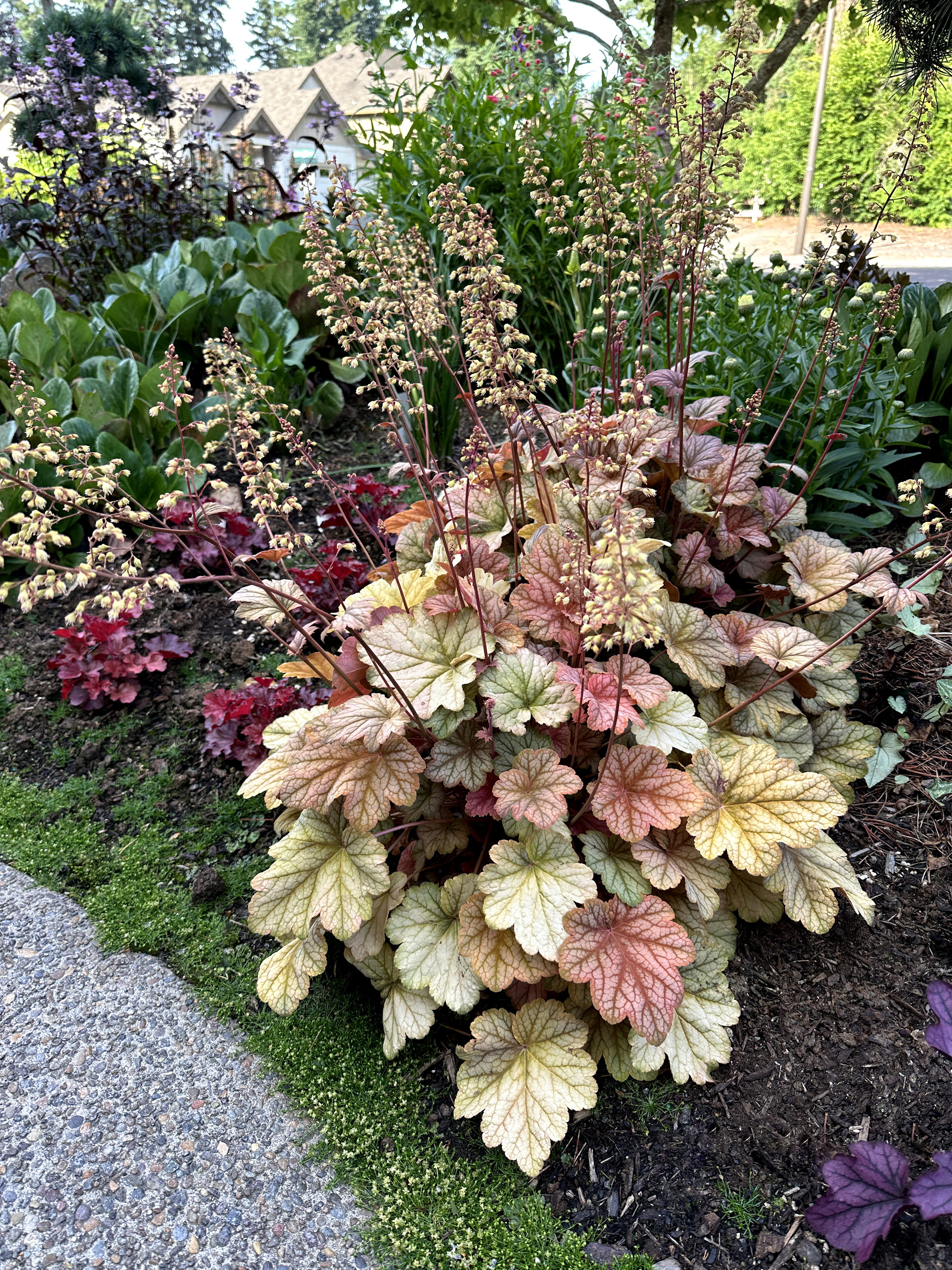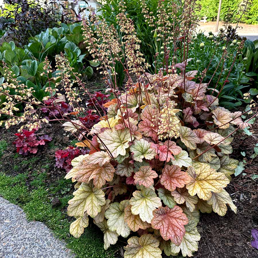 Some varieties of coral bells change colors throughout the year. Spring and fall weather tends to make the colors brighter while the summer’s heat may encourage a light silvering to develop on some varieties. This is perfectly normal and should not be a cause for concern.