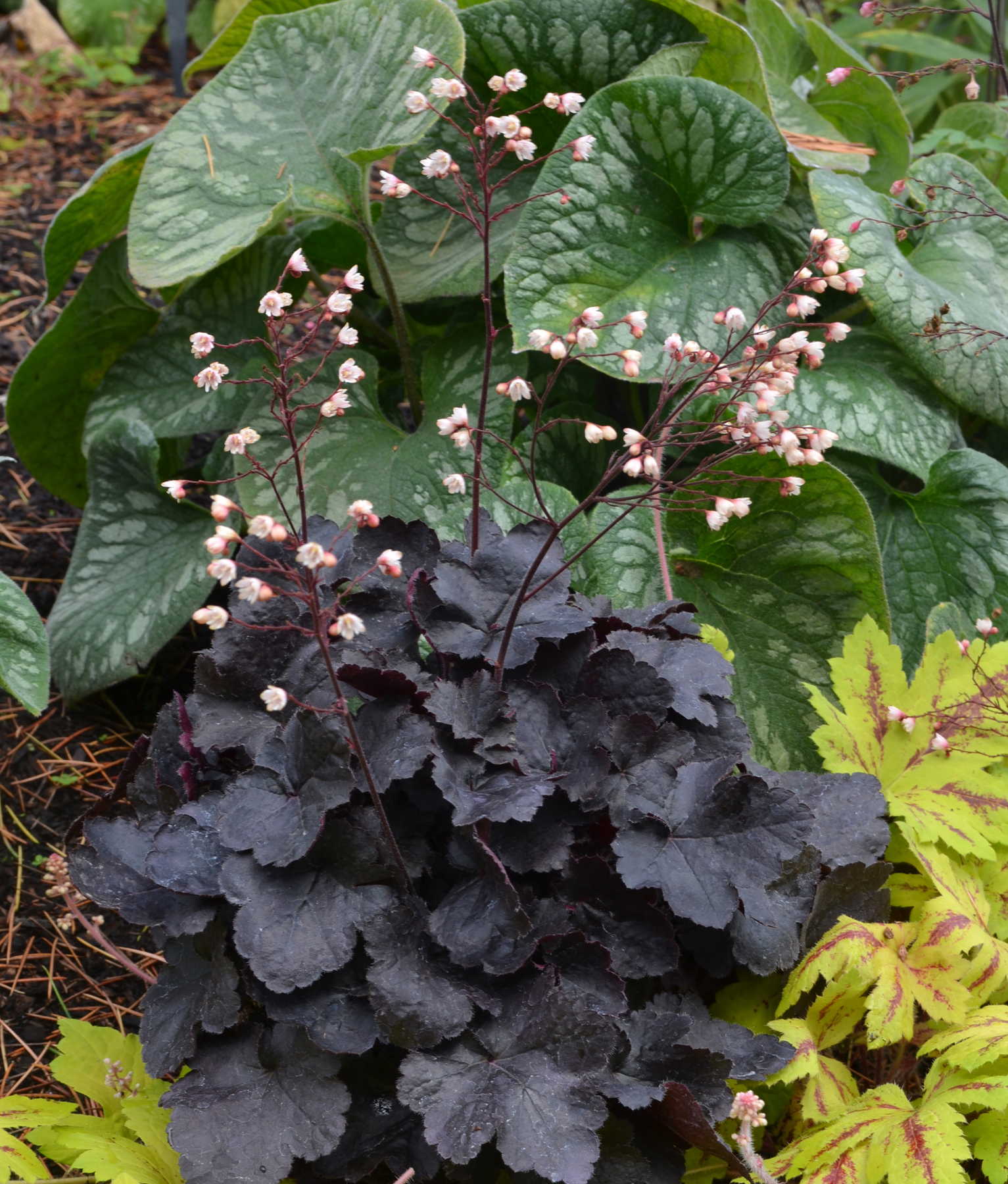 This sweet, dark chocolate foliaged cutie is a magnificent miniature of Heuchera 'Obsidian', with very nice, light pink flowers. Measuring 6″ high and 9″ wide with 10″ high flower spikes, 'Coco' will charm the most jaded gardener. Very long blooming; great for pots, mixed containers in rock gardens or borders.