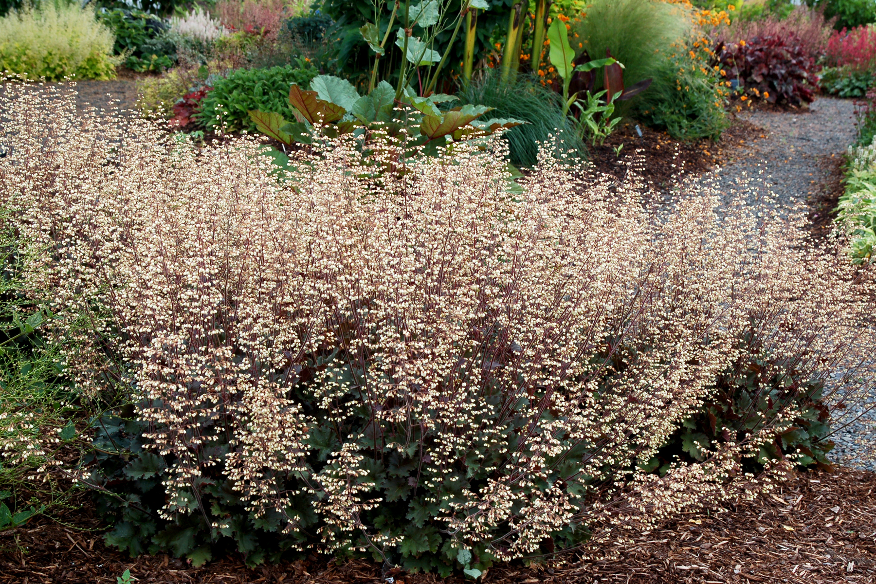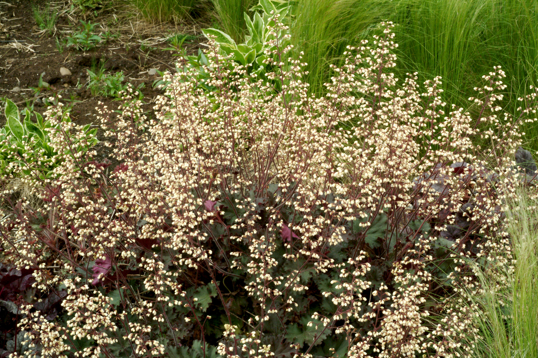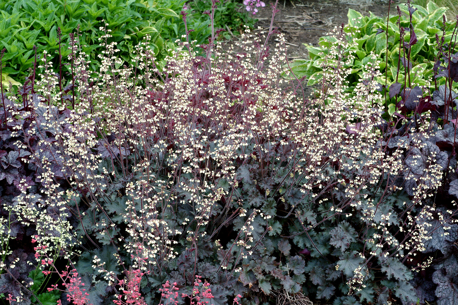 This Heuchera has ivory flowers that explode in profusion over ruffled ebony foliage. It has a nice compact habit. Long lived and easy to grow.