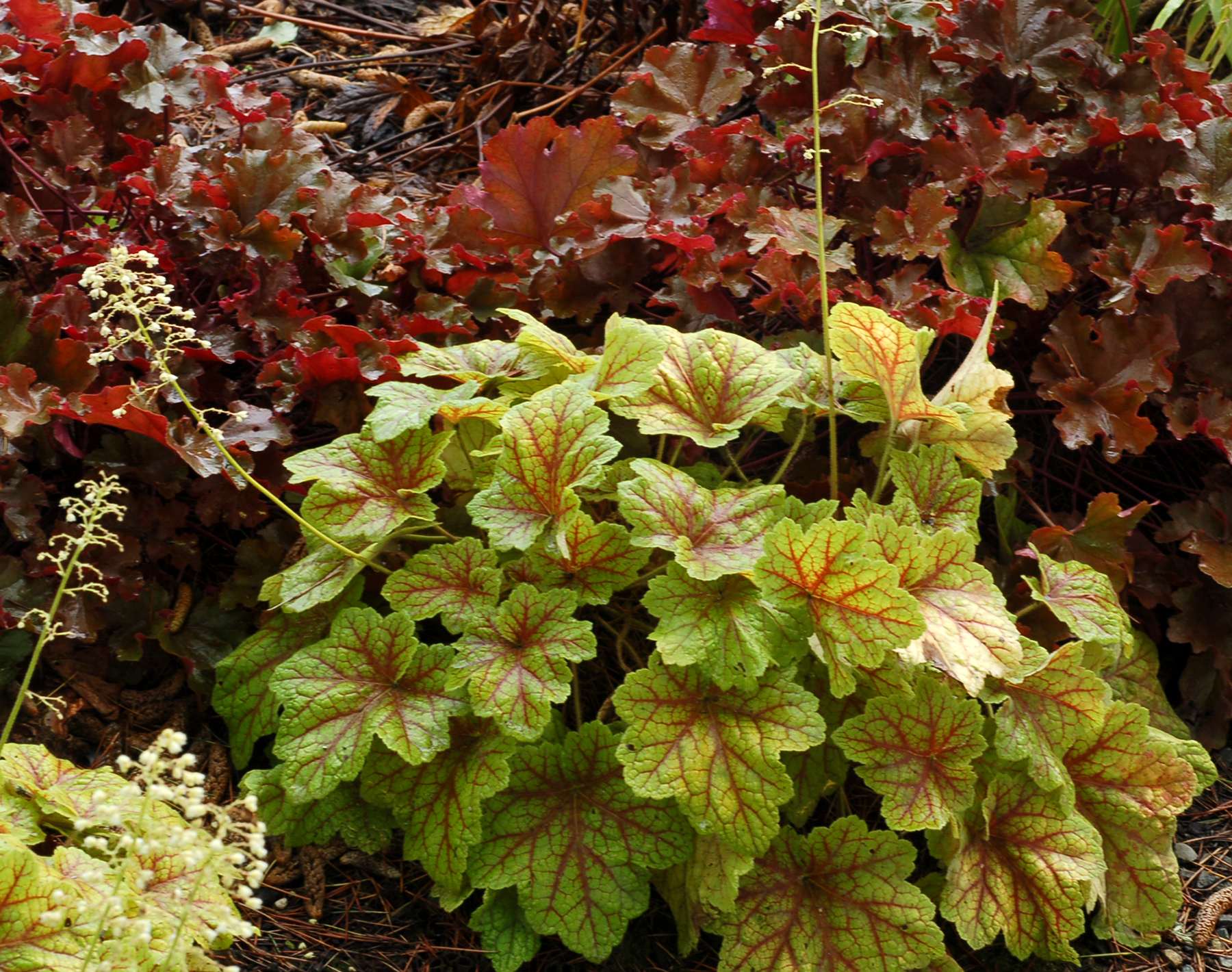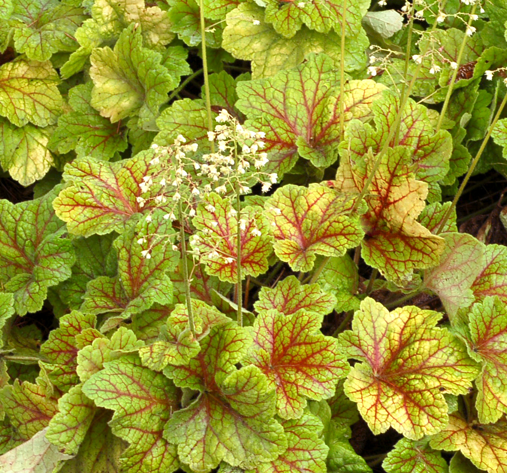 Shocking, blood-red veins electrify the golden leaves of this startling Heuchera. The red venation stays while the leaf changes from shades of yellow in spring, to chartreuse in summer and fall, and tan in the winter. Short, dense cones of white flowers. This vigorous, clumping H. villosa hybrid delivers what 'Tiramisu' promised.