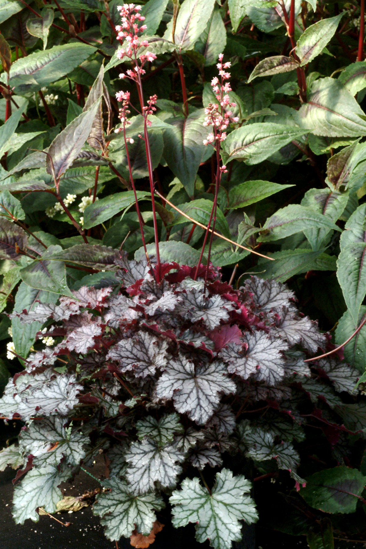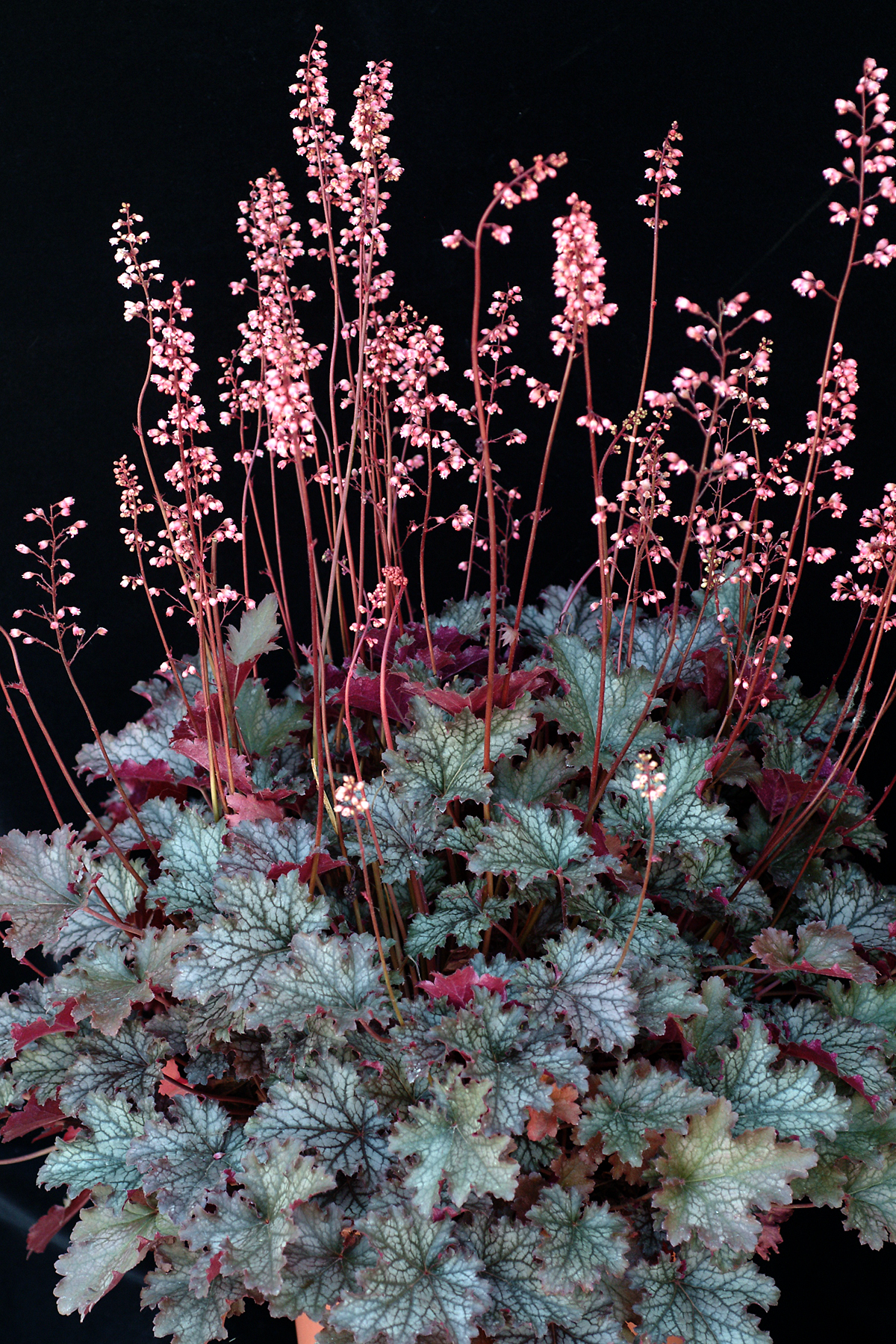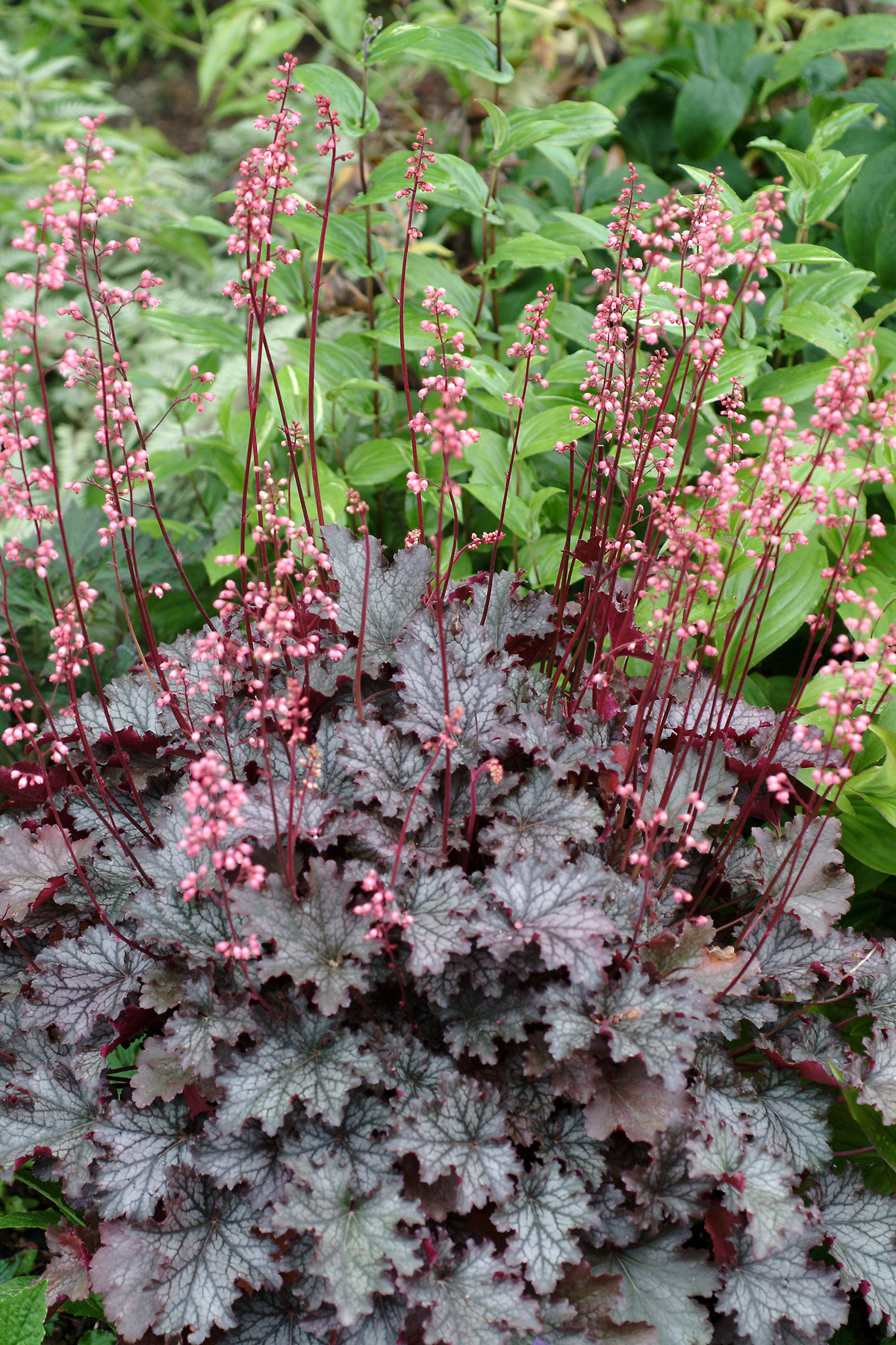 This compact, free flowering plant has veiled-metallic ruffled leaves with a swirl of coral wand-type flowers around the short stalks. It's a repeat bloomer.