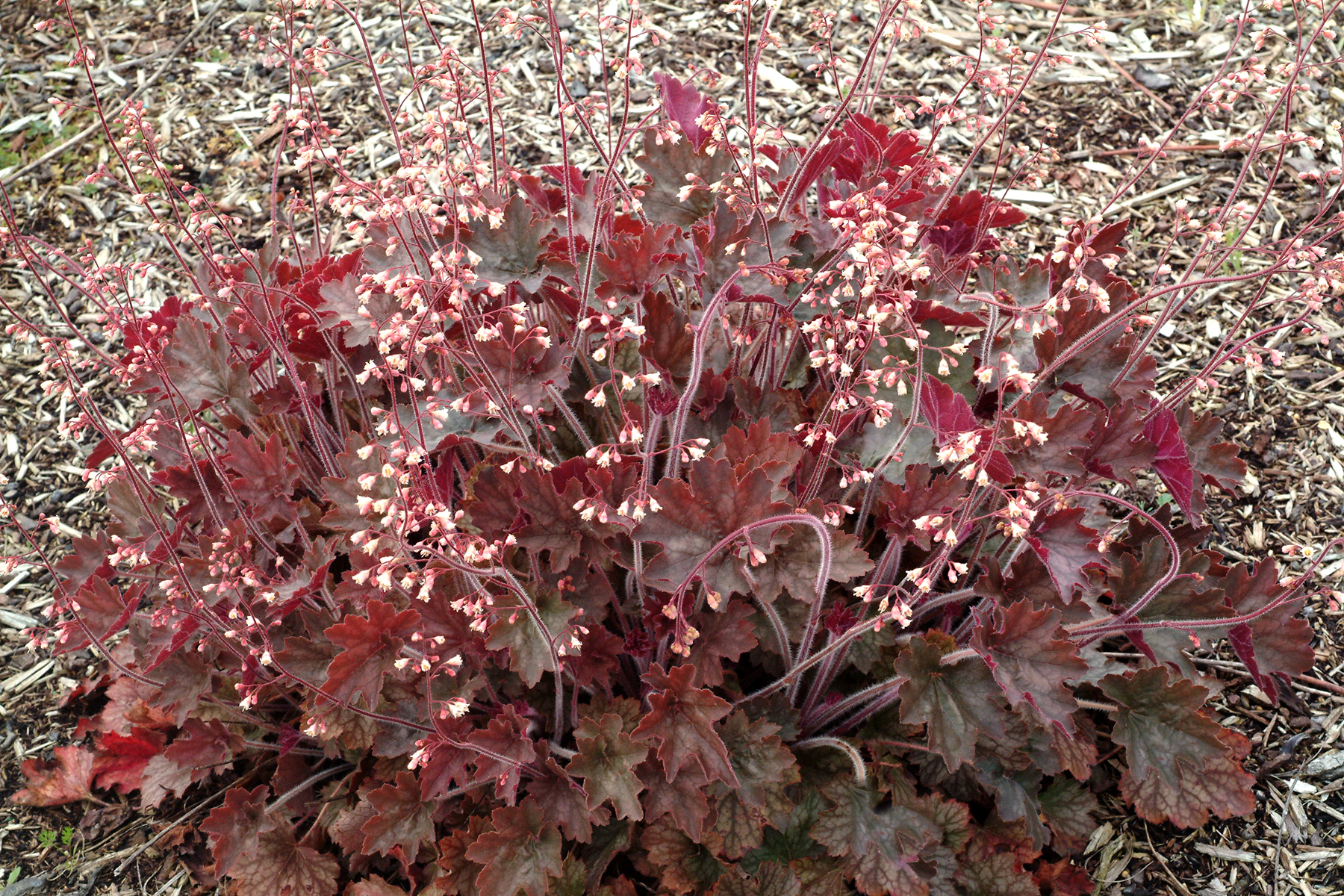 Best recognized by its display of light, coral-bell-shaped flowers on wiry stems held over the lightly ruffled bronze foliage.