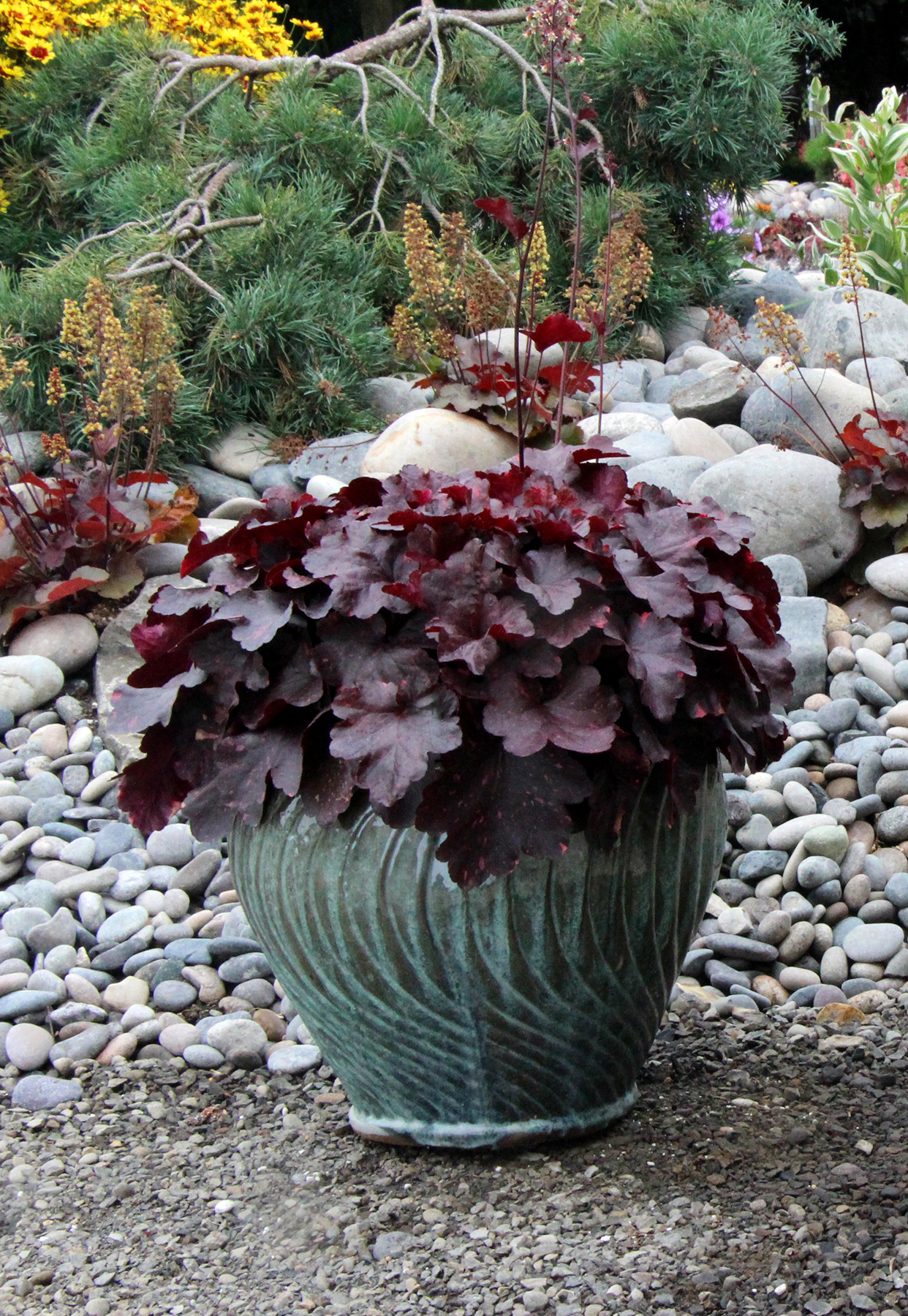 Pots: Coral bells grow beautifully in containers. Just make sure there is a hole in the bottom where the excess water can drain from. Transplant into the landscape in early fall if you’d like them to come back again next year. If you garden in zones 6b or warmer, they can be overwintered in containers.