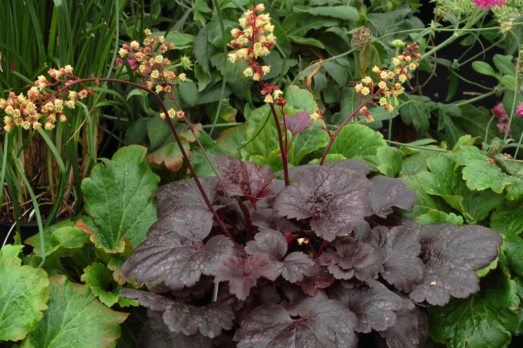 Named for a dark city with its obsidian-black leaves. Heuchera 'Gotham' is a compact plant. It fills a pot quickly and flowers all spring, summer, and fall with primrose yellow flowers that stand out like the moon on a dark night. Good in a container or as an edger in the landscape.