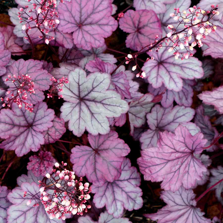 Amazing rose pink spring leaves are followed by lovely light-purple flowers which flower spring through summer. Summer to winter leaves are purple burnished silver. An outstanding container and front of the border type, 'Grape Soda' further illustrates that we have come a long ways in Heuchera breeding. Long lasting flowers make this a dual purpose plant.