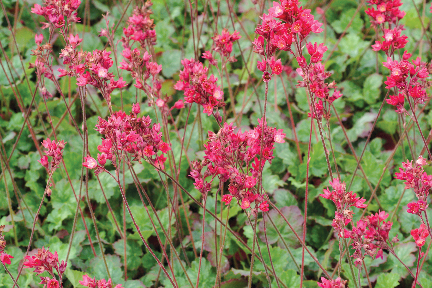 This Heuchera has very large rose-red flowers in wand-shaped spikes over nice green foliage.