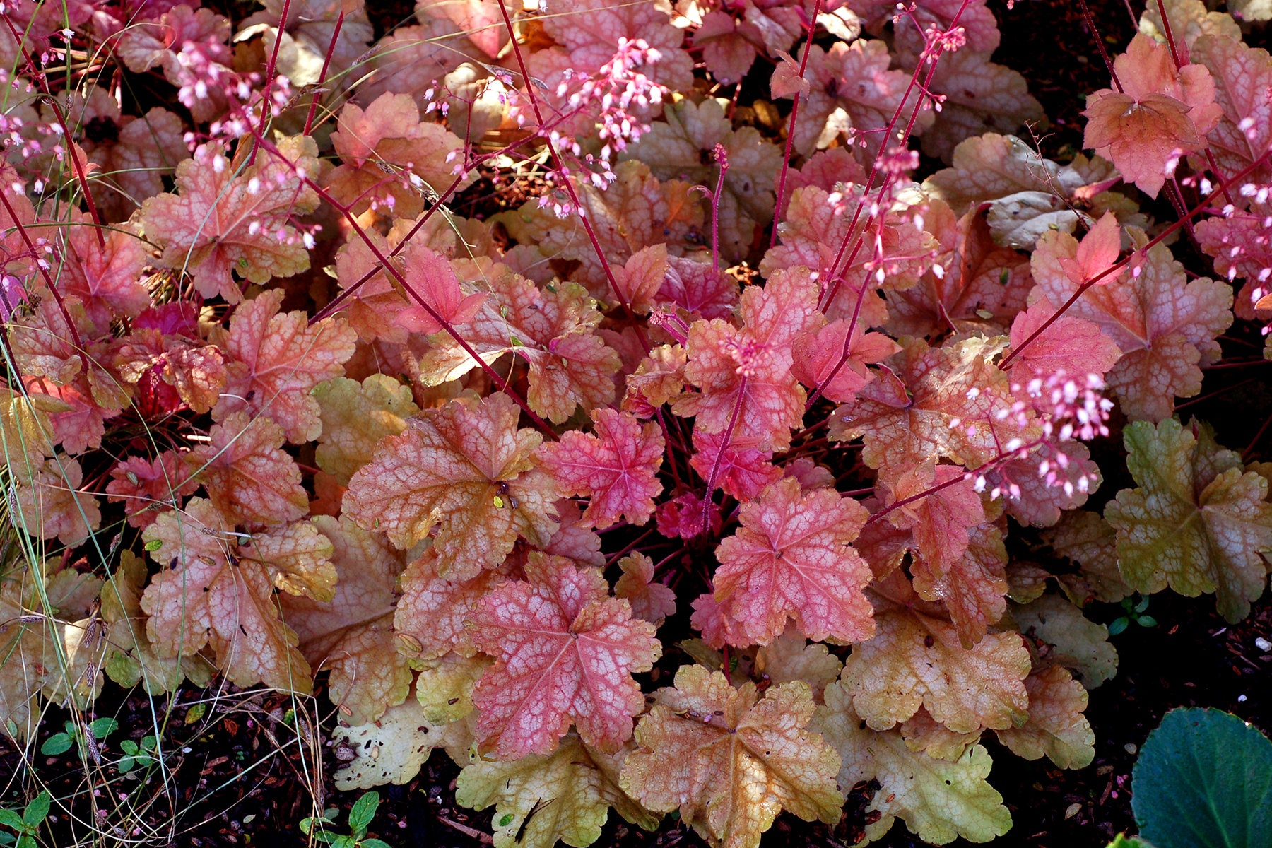Heuchera 'Peach Melba' has leaves that vary in color from peach to orange to rust with the hues and shadings changing with the seasons. Tiny, creamy pink flowers appear in spires in late spring on slender red stems rising above the foliage mound to 16″ tall.
