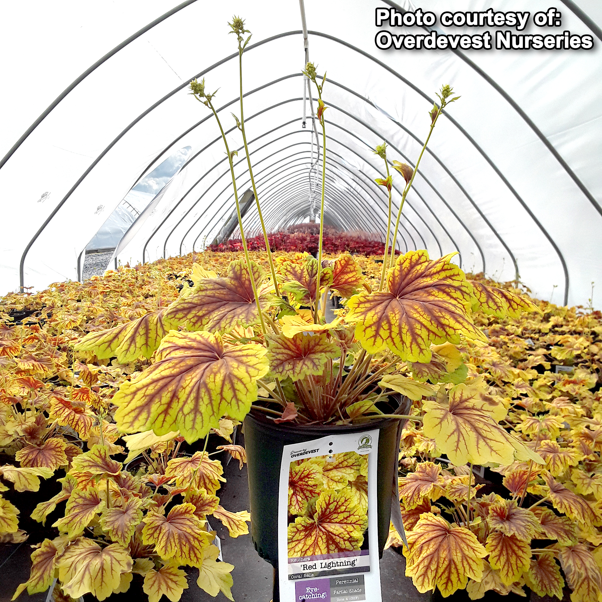 Electrifying dark red veins spark over huge gold leaves. Color holds well throughout the season. 'Red Lightning' is “villosa–strong” and draws your attention from across the garden. Works well in borders and mixed containers.