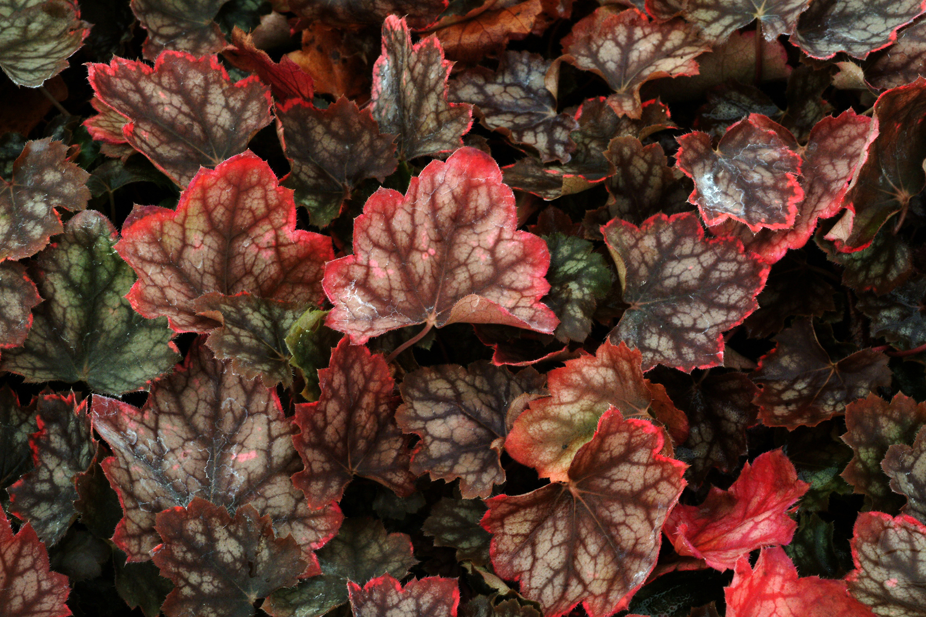 This H. americana type has silver leaves with dark veins. The leaves develop an attractive bright coral edge in fall when cool temperatures return.