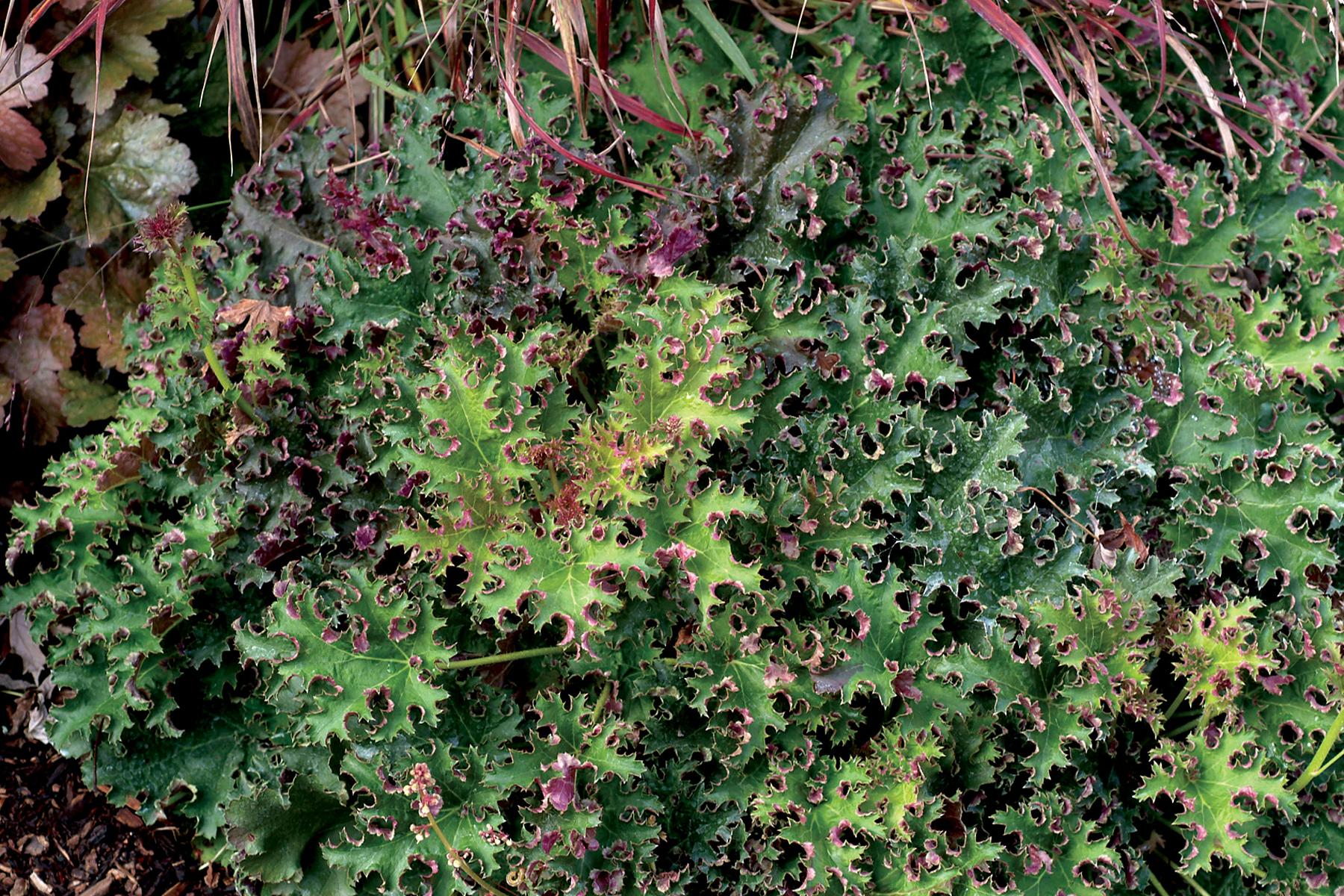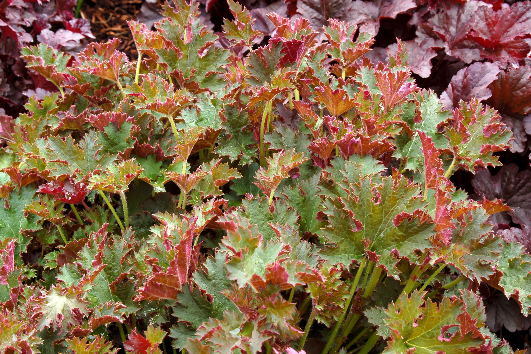 This sport of 'Purple Petticoats' has deeply cut, ruffled leaves which are dark green on top contrasted by luscious burgundy below. The unique substance and leaf color provide dramatic interest in both landscapes and containers. Award of Garden Merit winner.