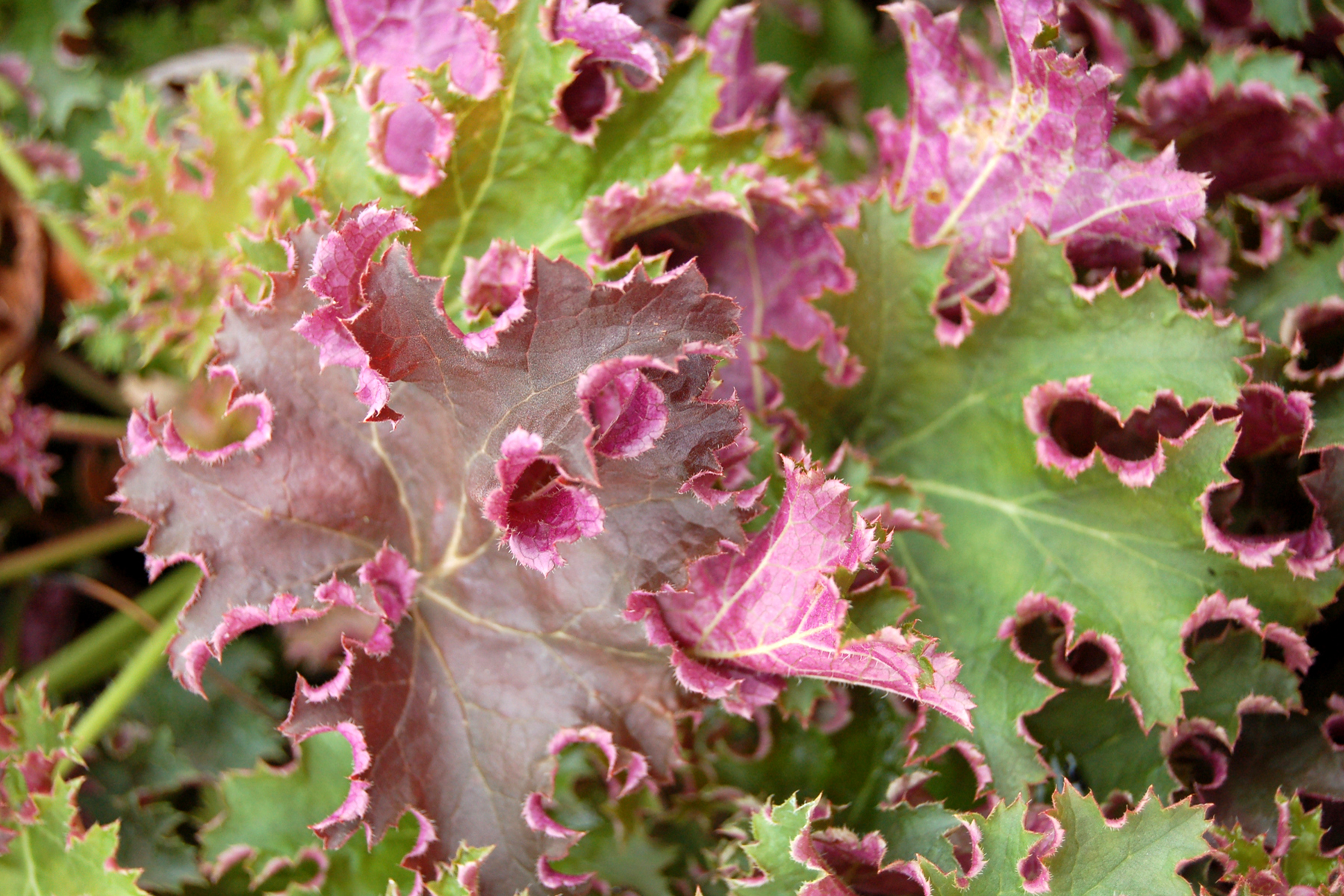 | How Different? | Ruffled dark green leaves with contrasting purple undersides that show with each ruffle. |