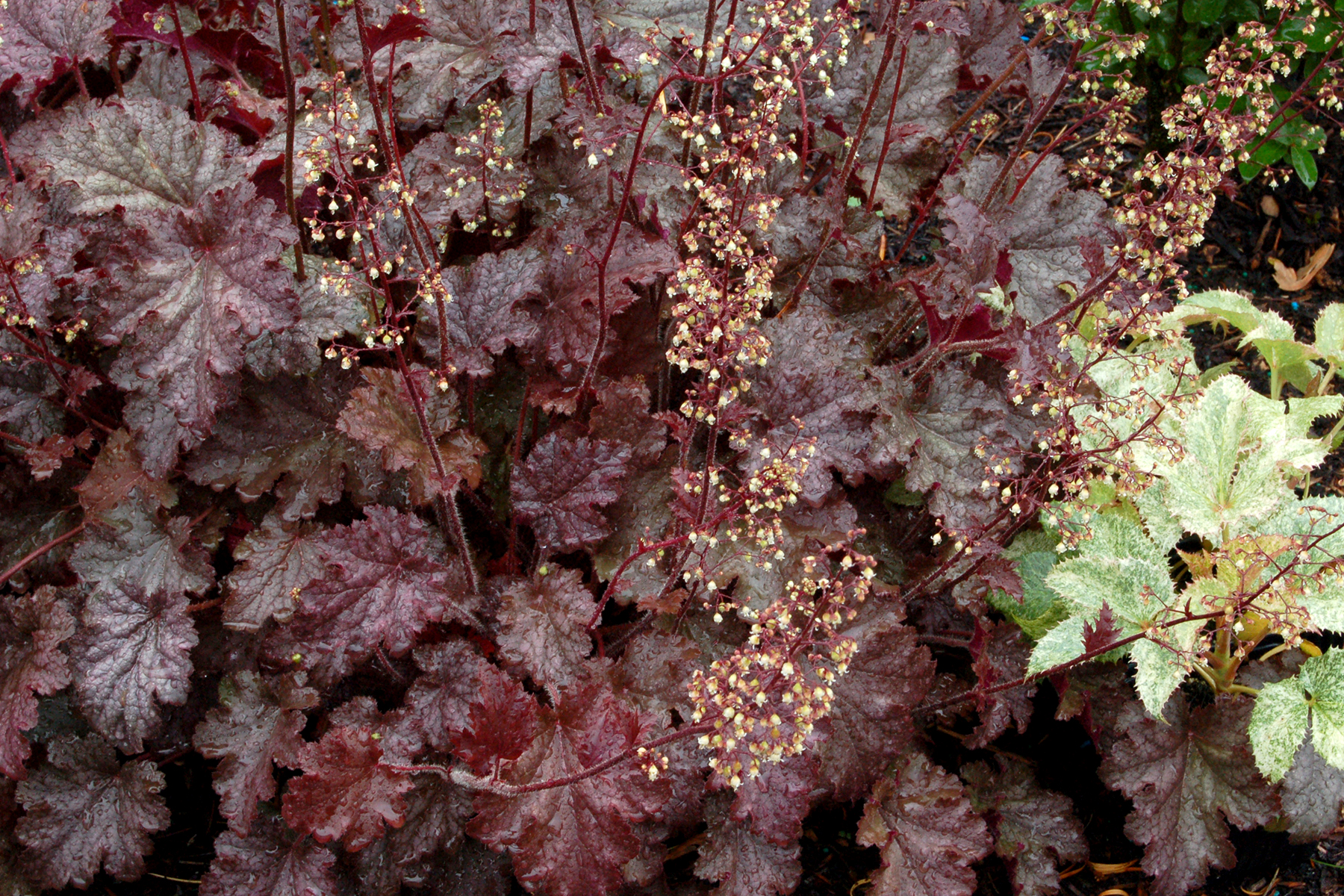 The magnificently ruffled, somewhat glossy leaves are maroon-purple when young, aging to bronze-green with bright purple undersides. Cream colored flowers appear on 3 foot tall, dark purple scapes from late spring to early summer. 'Stormy Seas' has a fantastic compact habit and displays extreme vigor. It is considered to be one of the best landscape Heuchera by its breeder, TERRA NOVA® Nurseries.