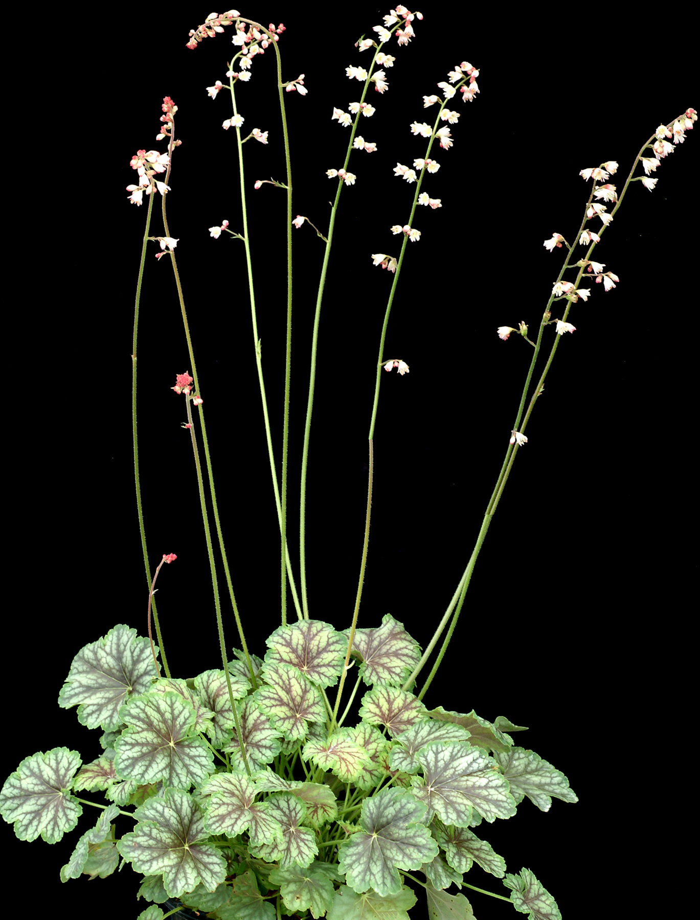 This Heuchera has 'Green Spice'-type foliage of green with red veins and a white veil but with the addition of lovely white flowers. The flowering stems are shorter than 'Green Spice' but taller than the compact forms.
