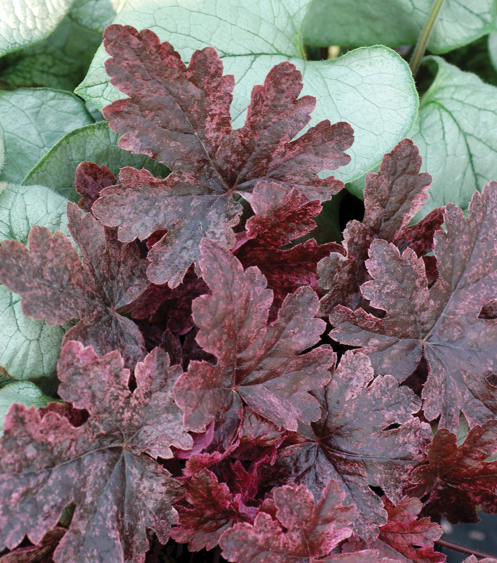 This glossy dark leaf perennial looks sprinkled with fizzy pink spray. This mutation out of 'Burnished Bronze' impresses us with its great performance. Good in sun or shade, containers, or borders. Light pink-white flowers.