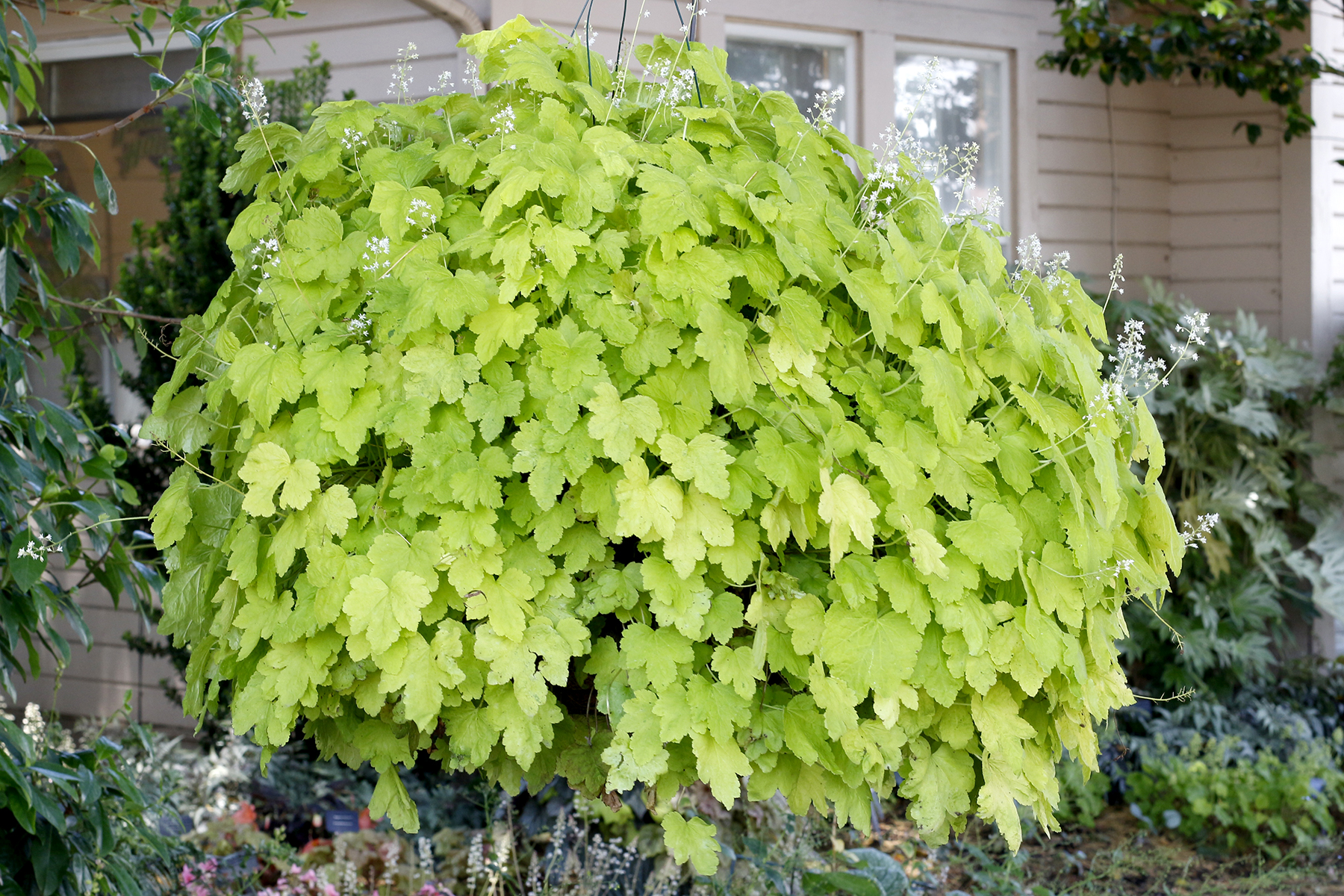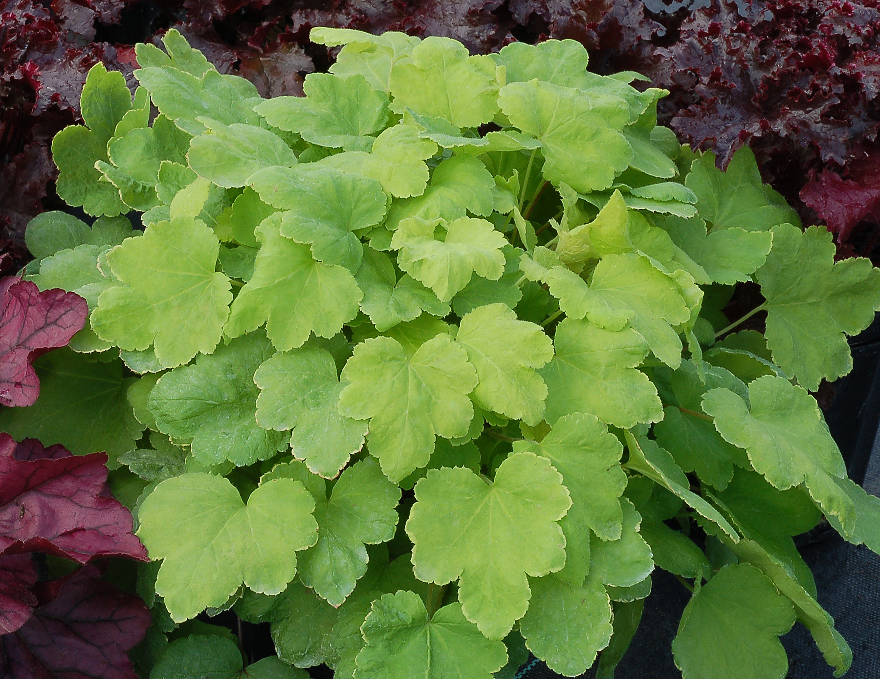 Heucherella HAPPY HOUR™ Lime has clean, clear lime green foliage with no marbling. A spontaneous mutation of the very popular ‘Buttered Rum’. This great mixer has a wonderful vigor and forms a dense clump quickly. Easy maintenance with spring only bloom with short stems of white flowers. Heucherella don’t get rust.