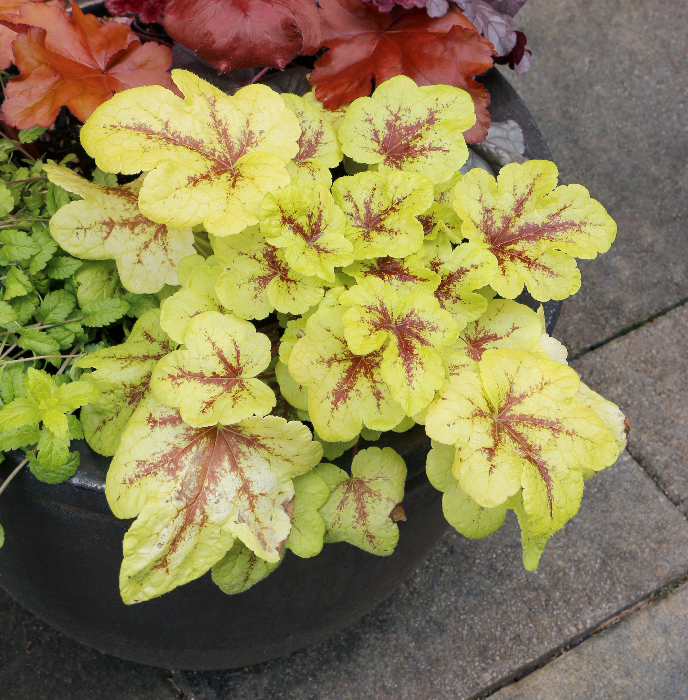 Warm gold spring color gives way to summer lime, always with red veins that hold their color well into the season. Dense, compact habit. Short petioles give this plant a unique fullness. It's always neat with few or no flower spikes for easy maintenance.