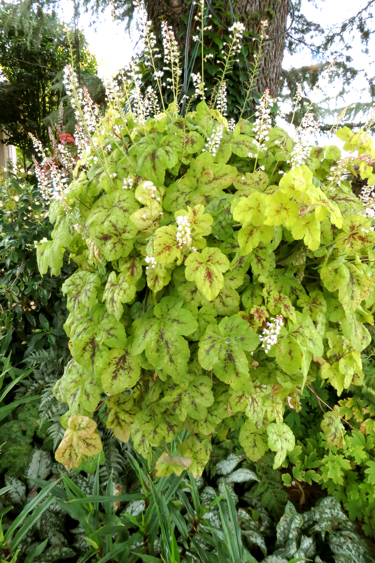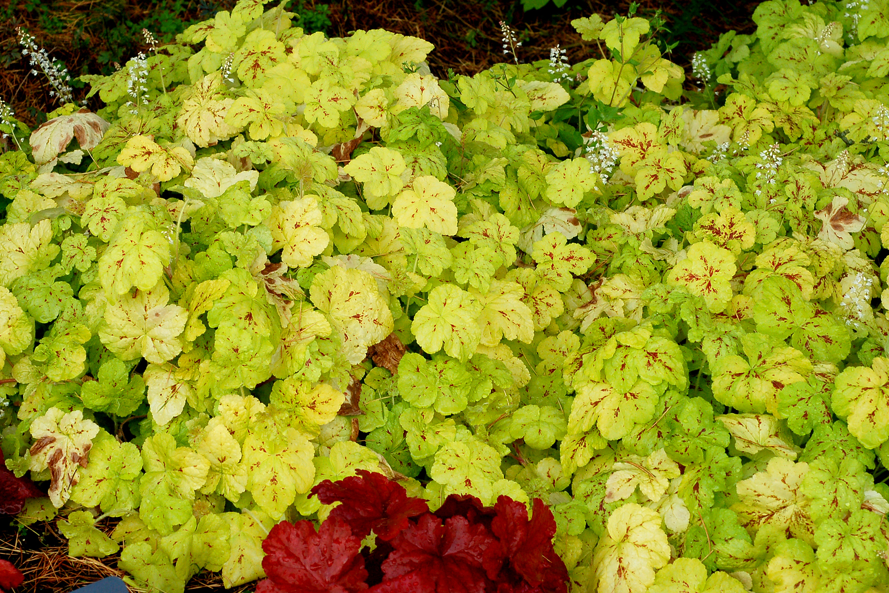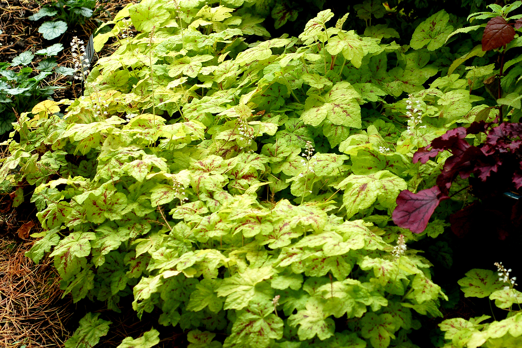 | How Different? | A trailing Heucherella! This has chartreuse to lime leaves that are marked with deep crimson. |