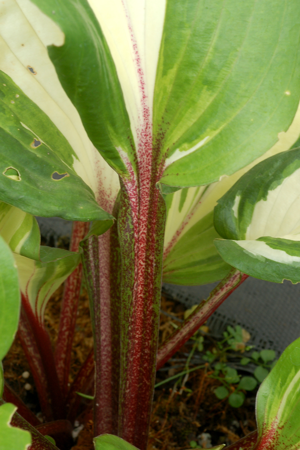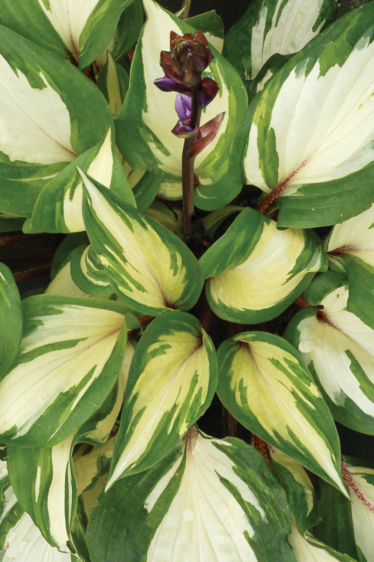 Lovely compact Hosta with beautifully variegated leaves and striking deep burgundy petioles, leaf bases, and flower stalks. TERRA NOVA® worked on this one for many years perfecting the combination of variegation and introducing the red pigmentation to the foliage. Flower color is deep lavender purple in August.