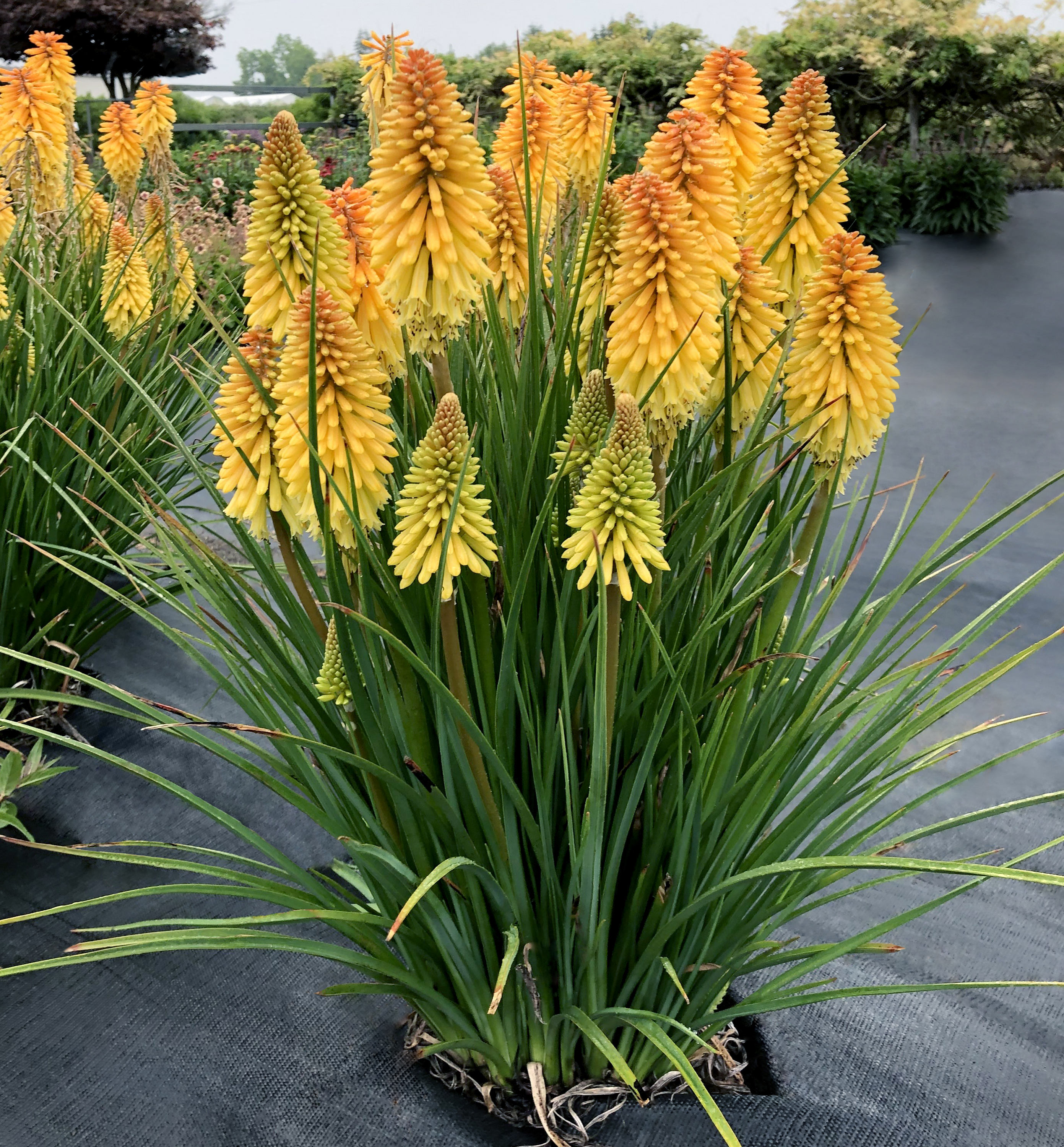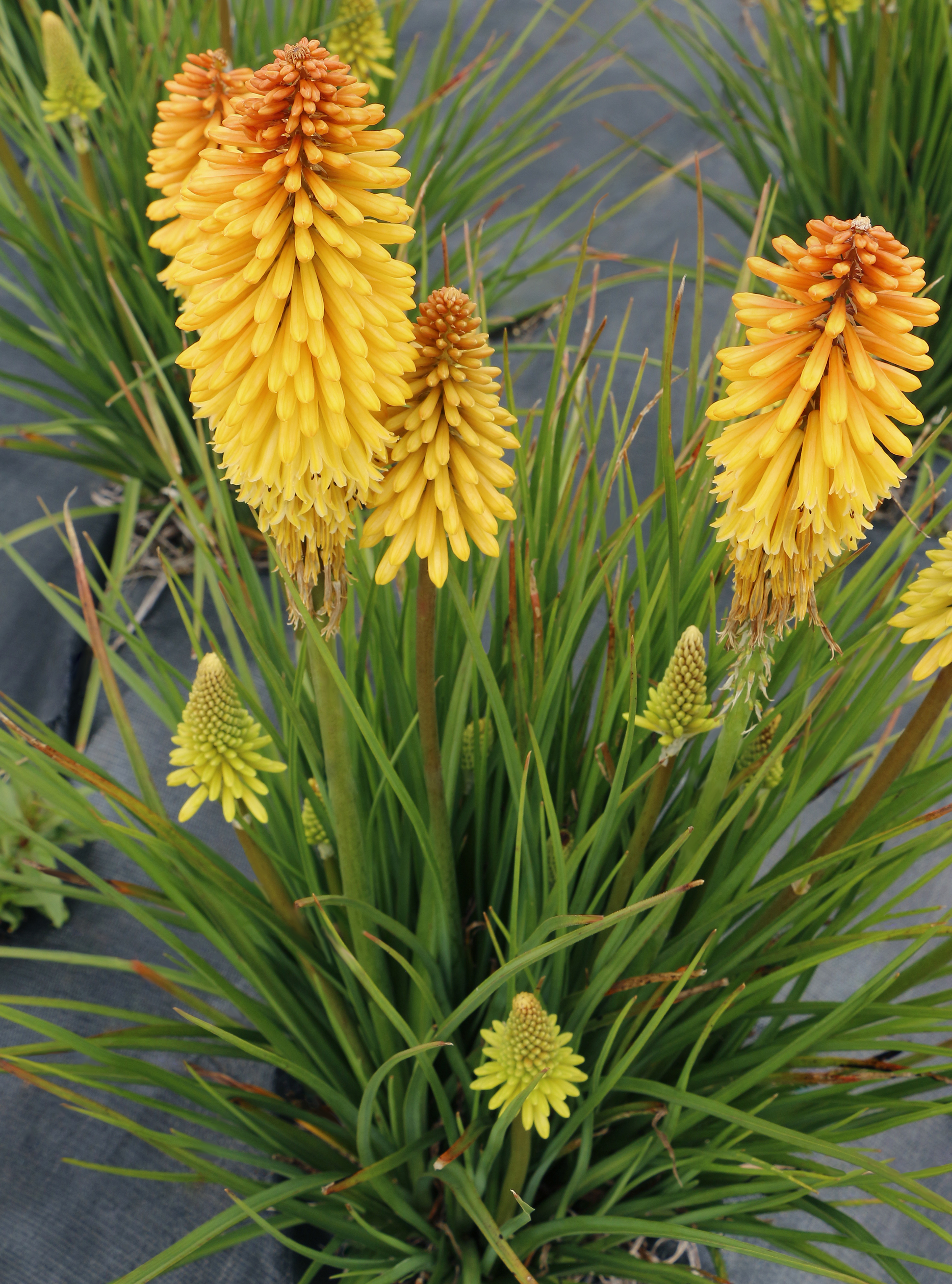 Opt to plant your Kniphofia in the ground rather than containers, as the mature plants grow into large clumps that often measure 2 to 3′ across.