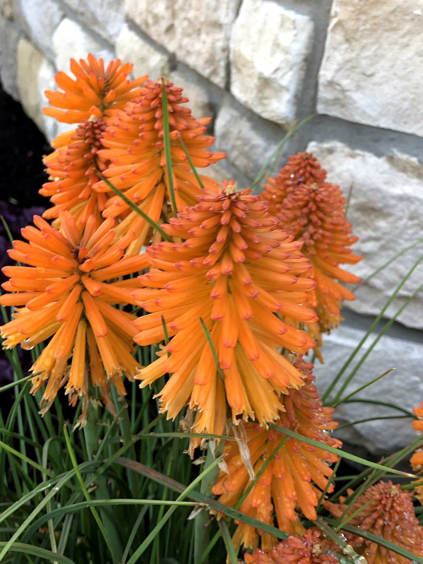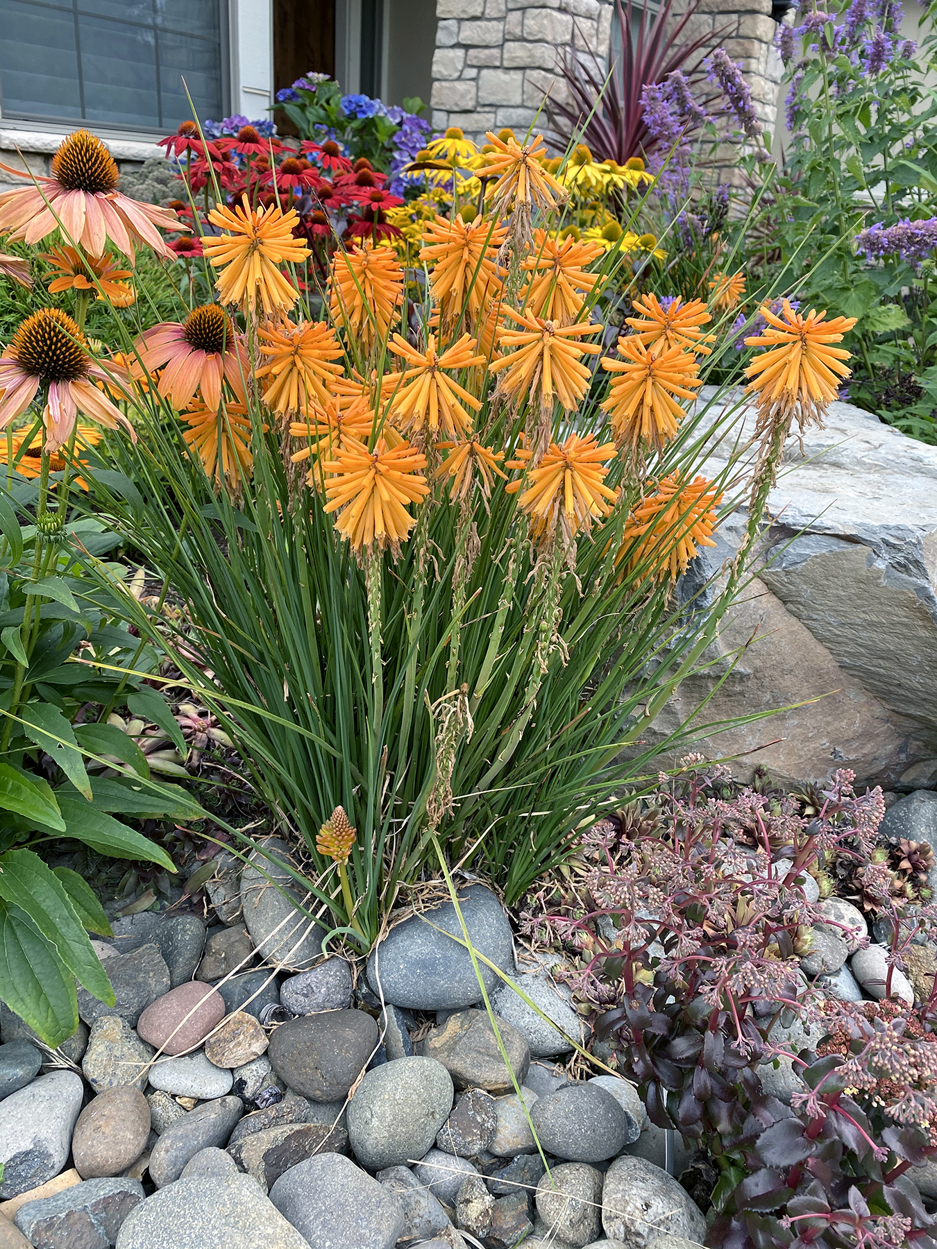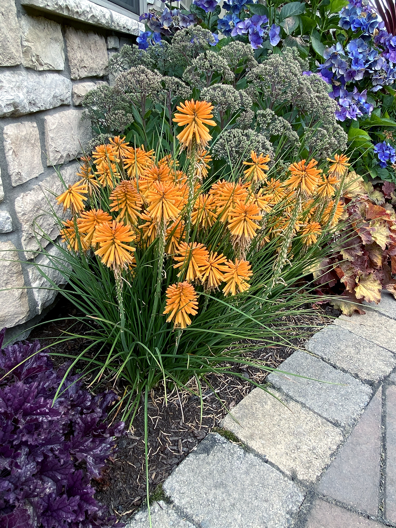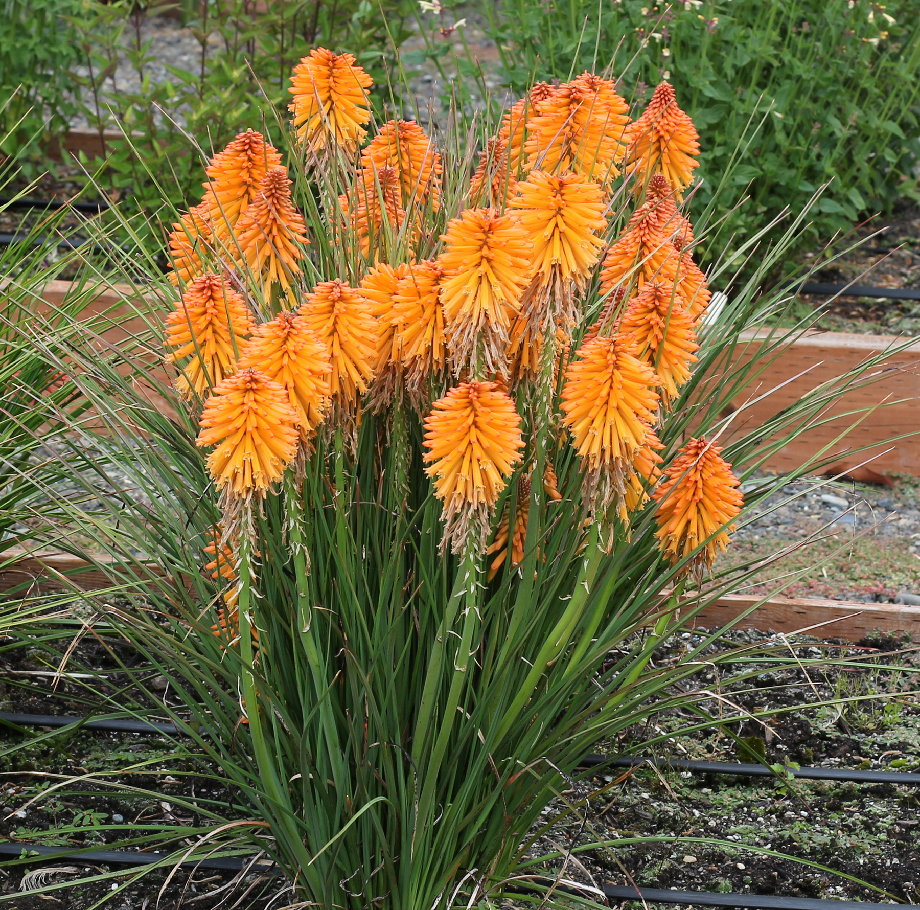 Opt to plant your Kniphofia in the ground rather than containers, as the mature plants grow into large clumps that often measure 2 to 3′ across.