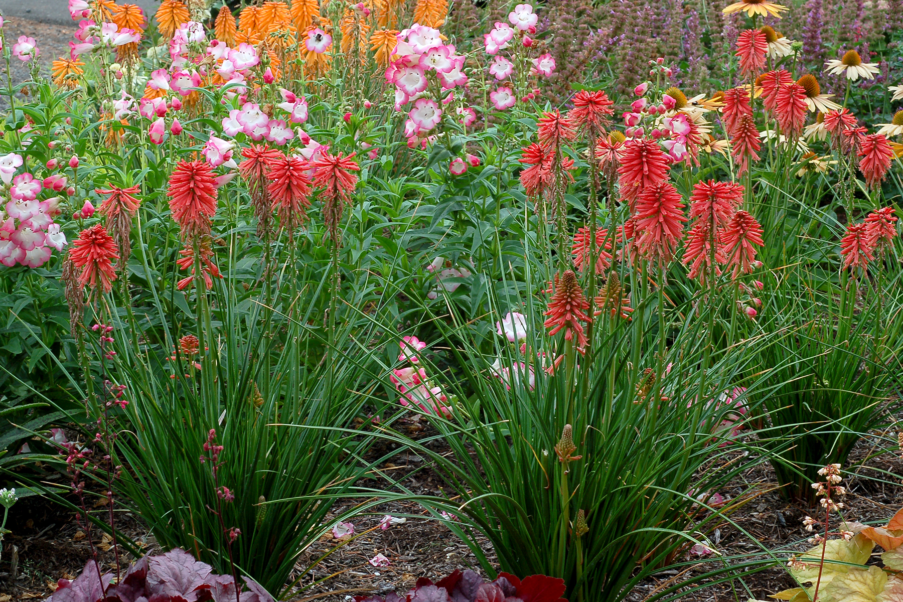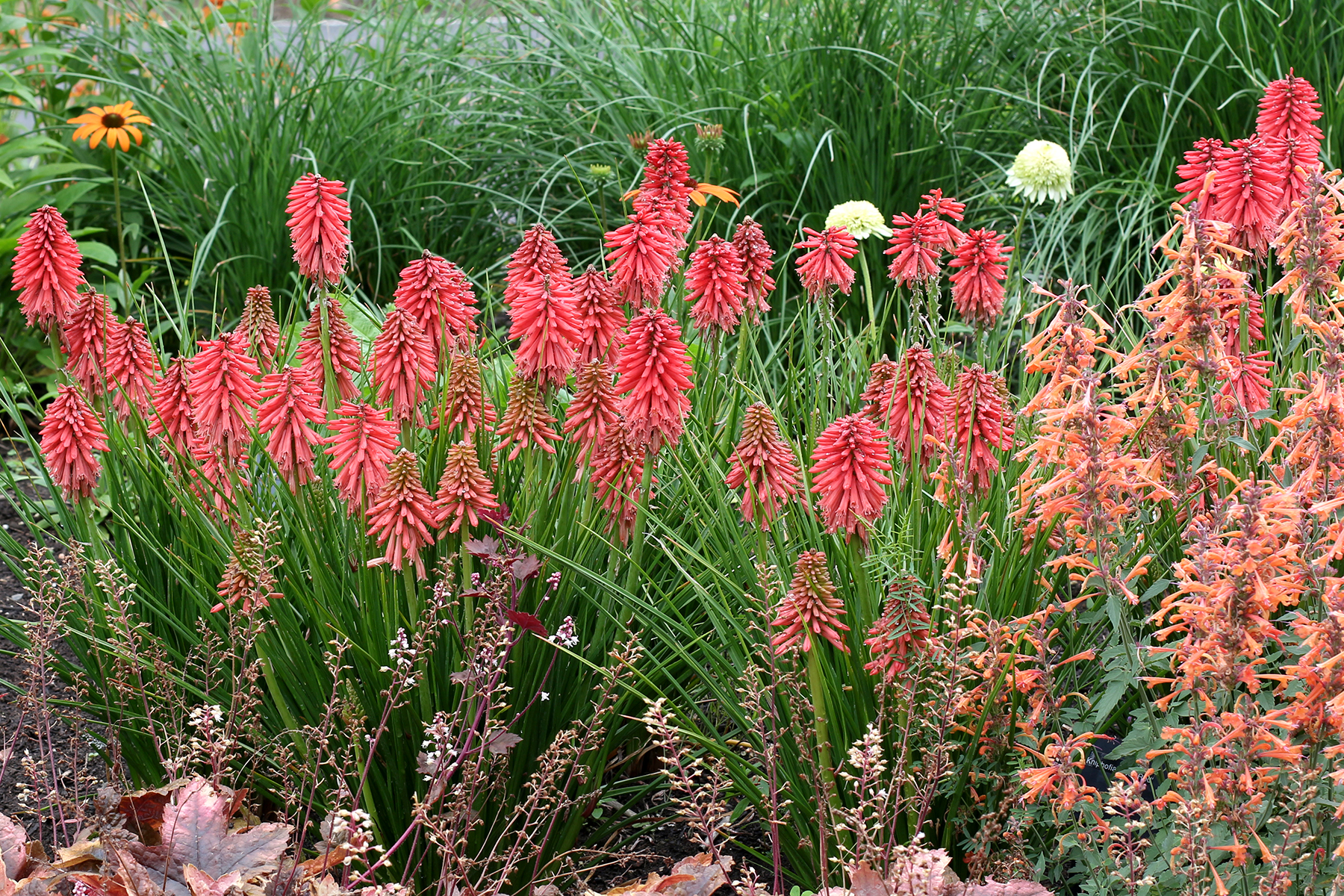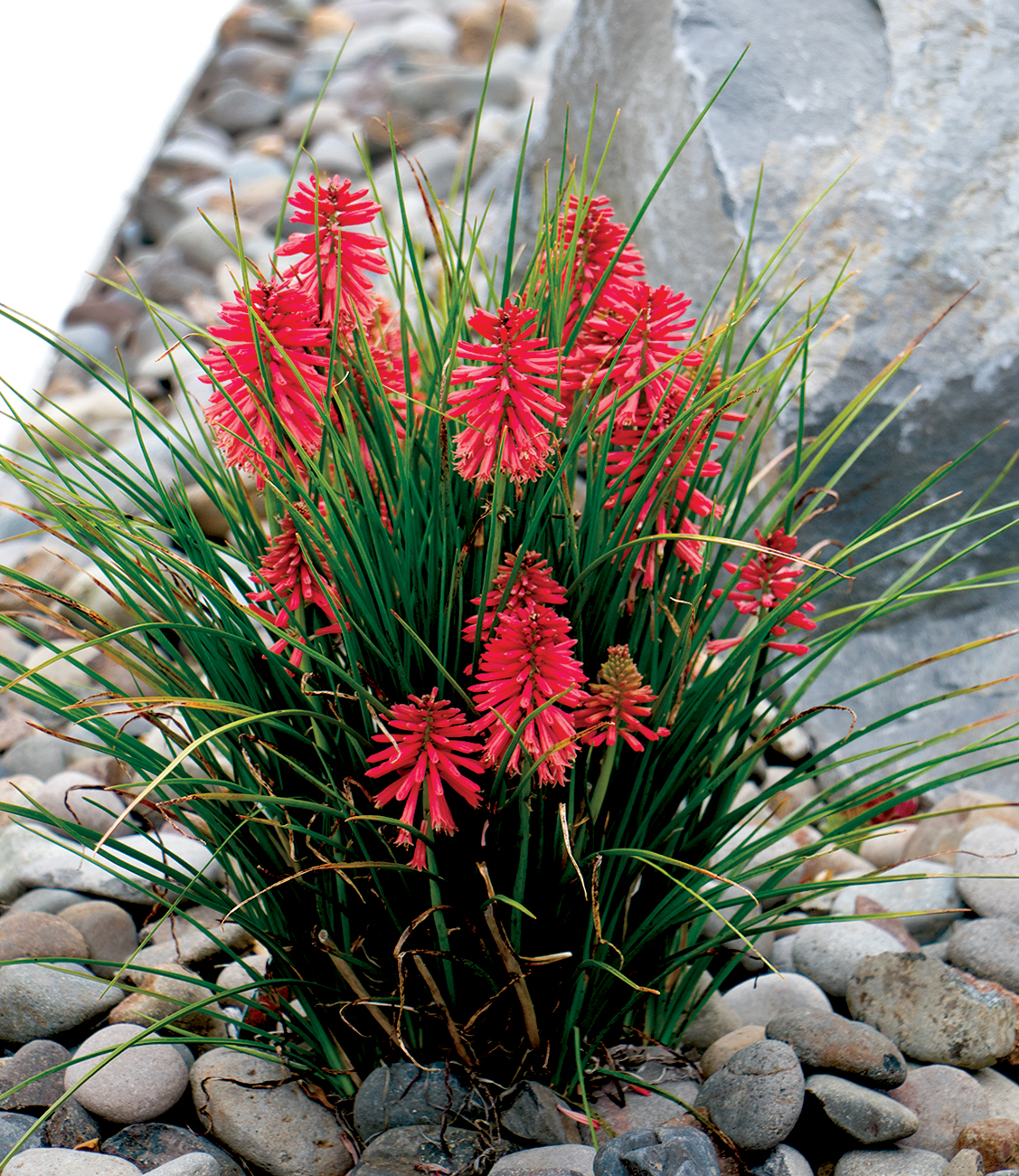 Opt to plant your Kniphofia in the ground rather than containers, as the mature plants grow into large clumps that often measure 2 to 3′ across.