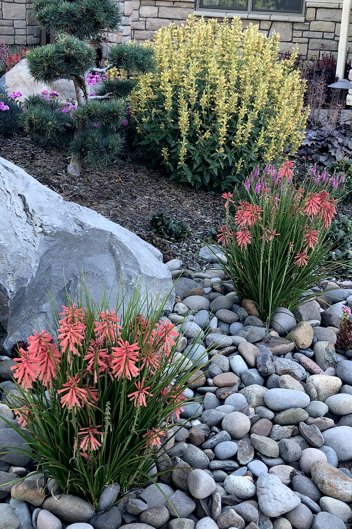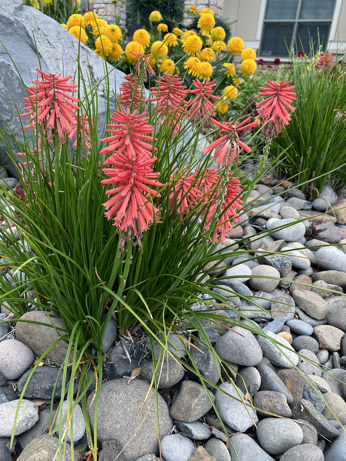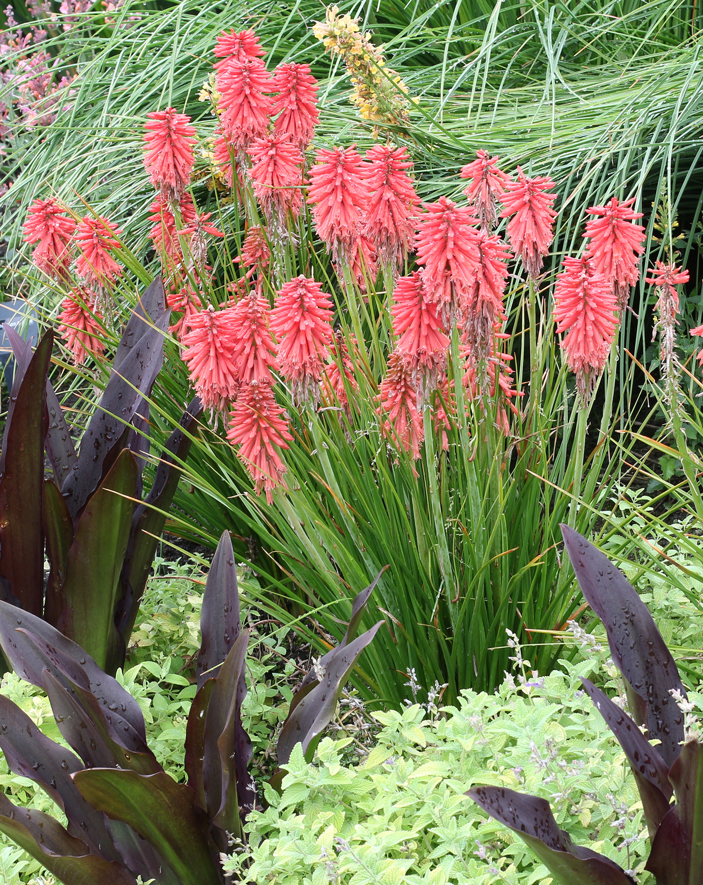 Opt to plant your Kniphofia in the ground rather than containers, as the mature plants grow into large clumps that often measure 2 to 3′ across.