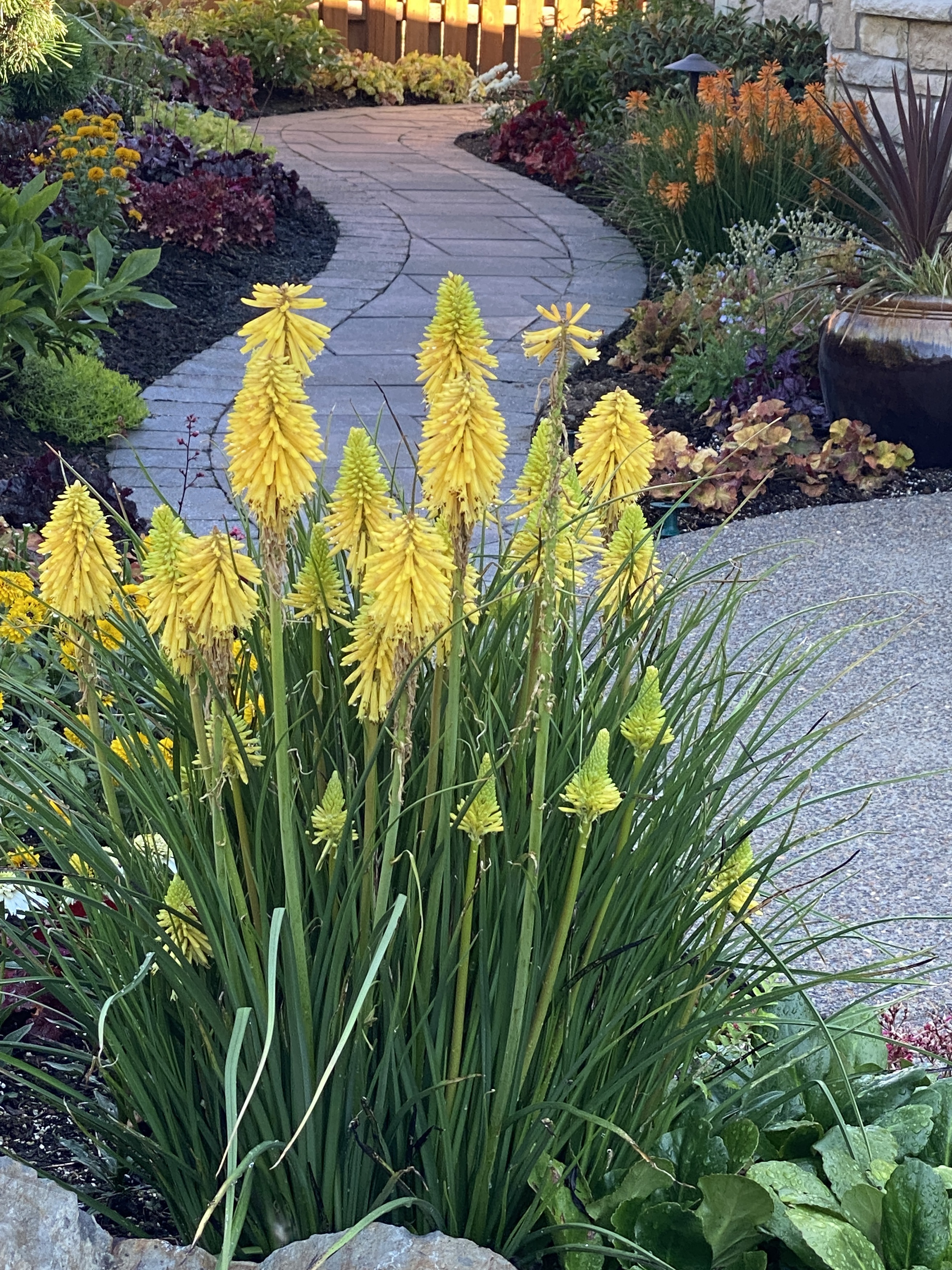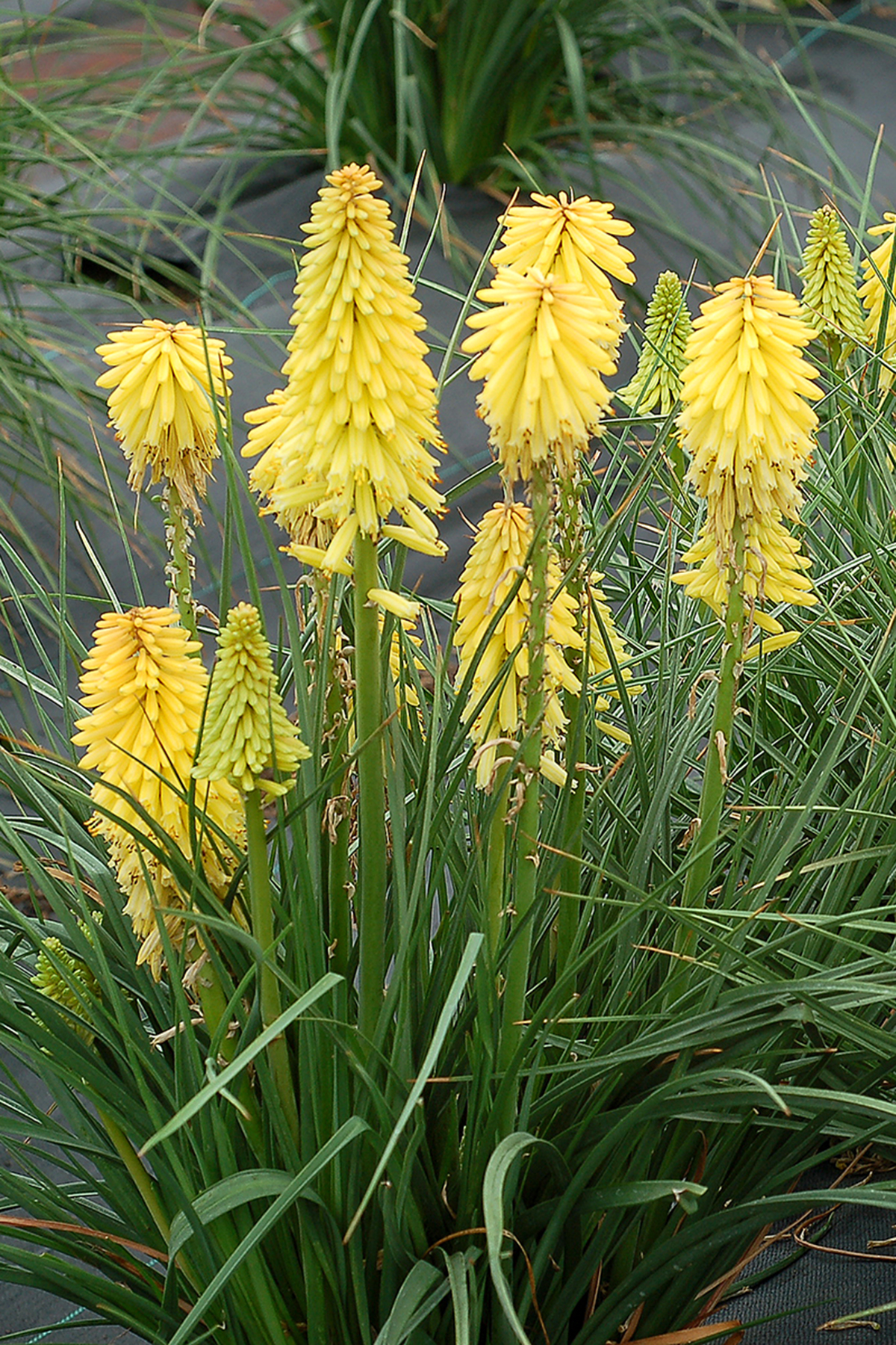 Opt to plant your Kniphofia in the ground rather than containers, as the mature plants grow into large clumps that often measure 2 to 3′ across.