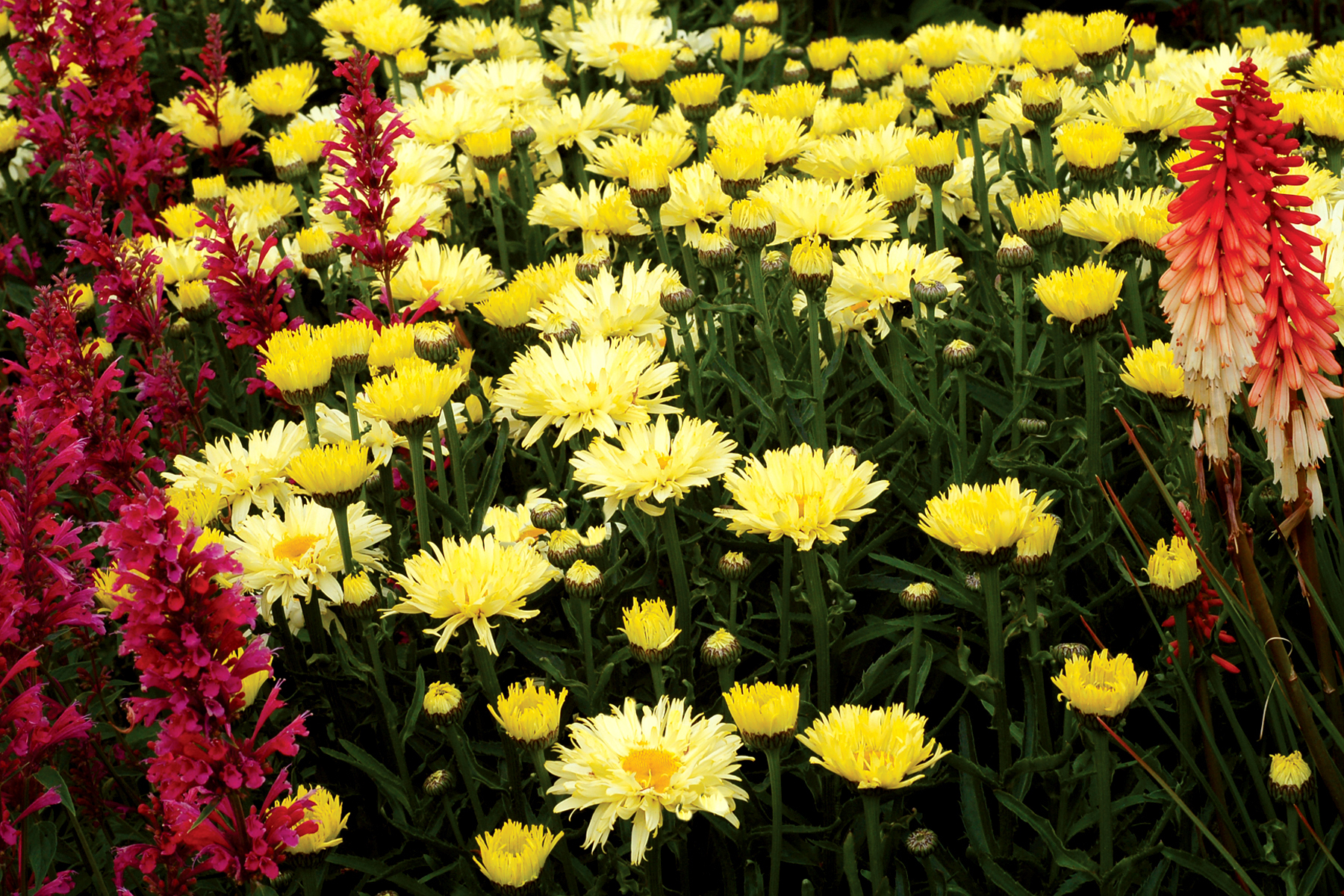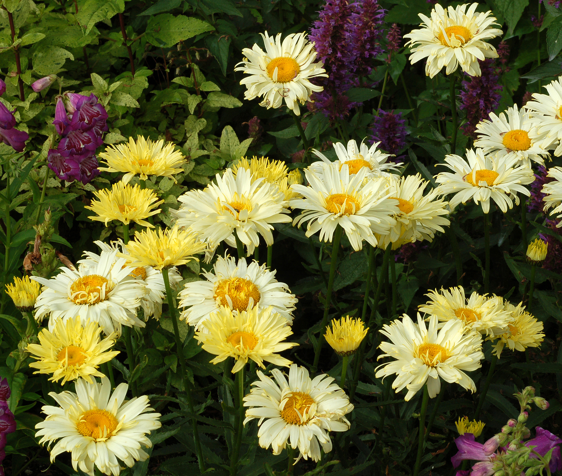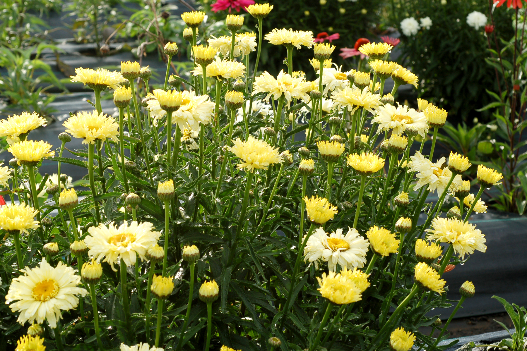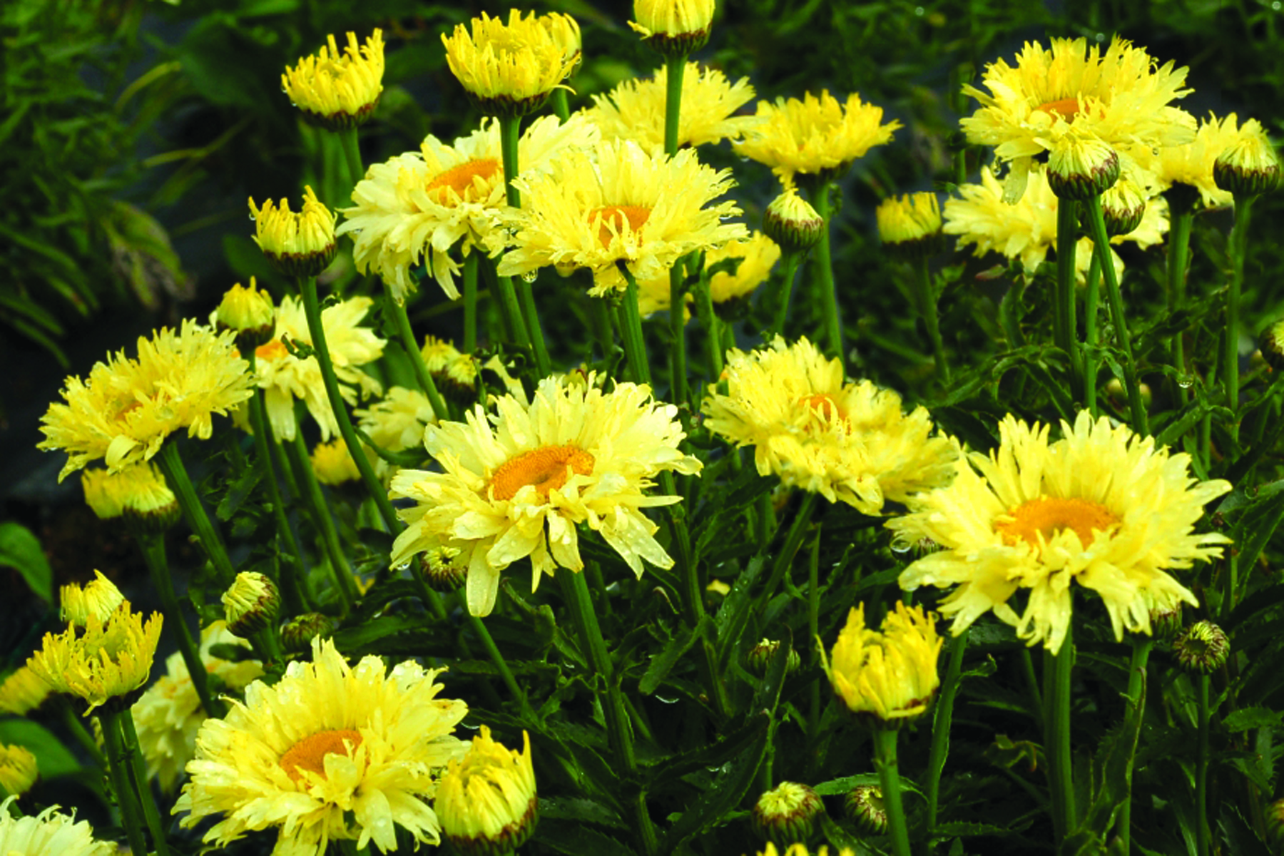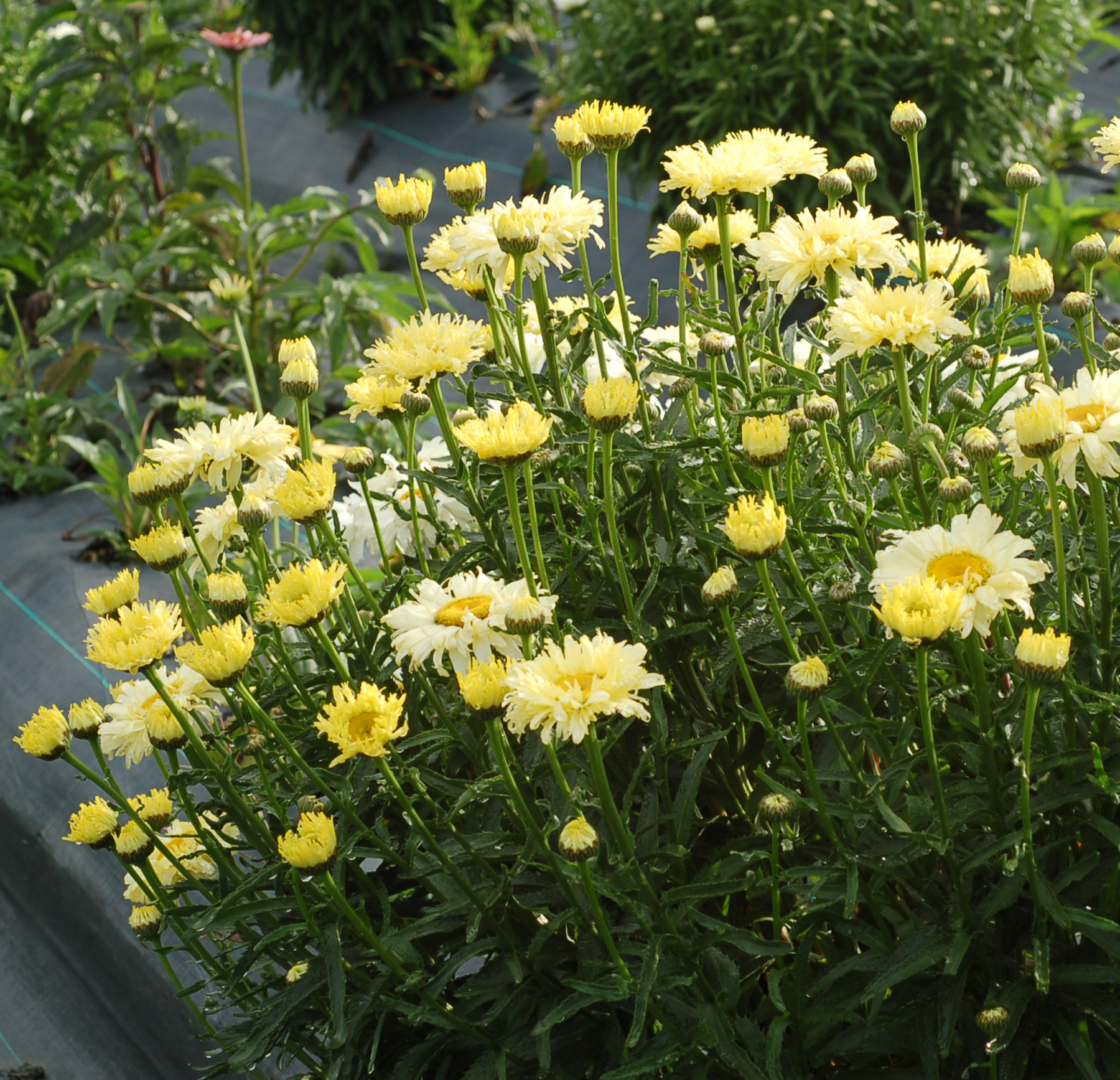 This is the yellowest flowering Shasta daisy ever! Long blooming and compact with semi-double flowers. 'Goldfinch' is the product of years of breeding for yellow flowers. All other “yellow” Leucanthemum pale in comparison! Charming semi-double flowers, very slowly and gracefully change from bright lemon yellow to an ivory white. A real gem among the bland Leucanthemum offerings.