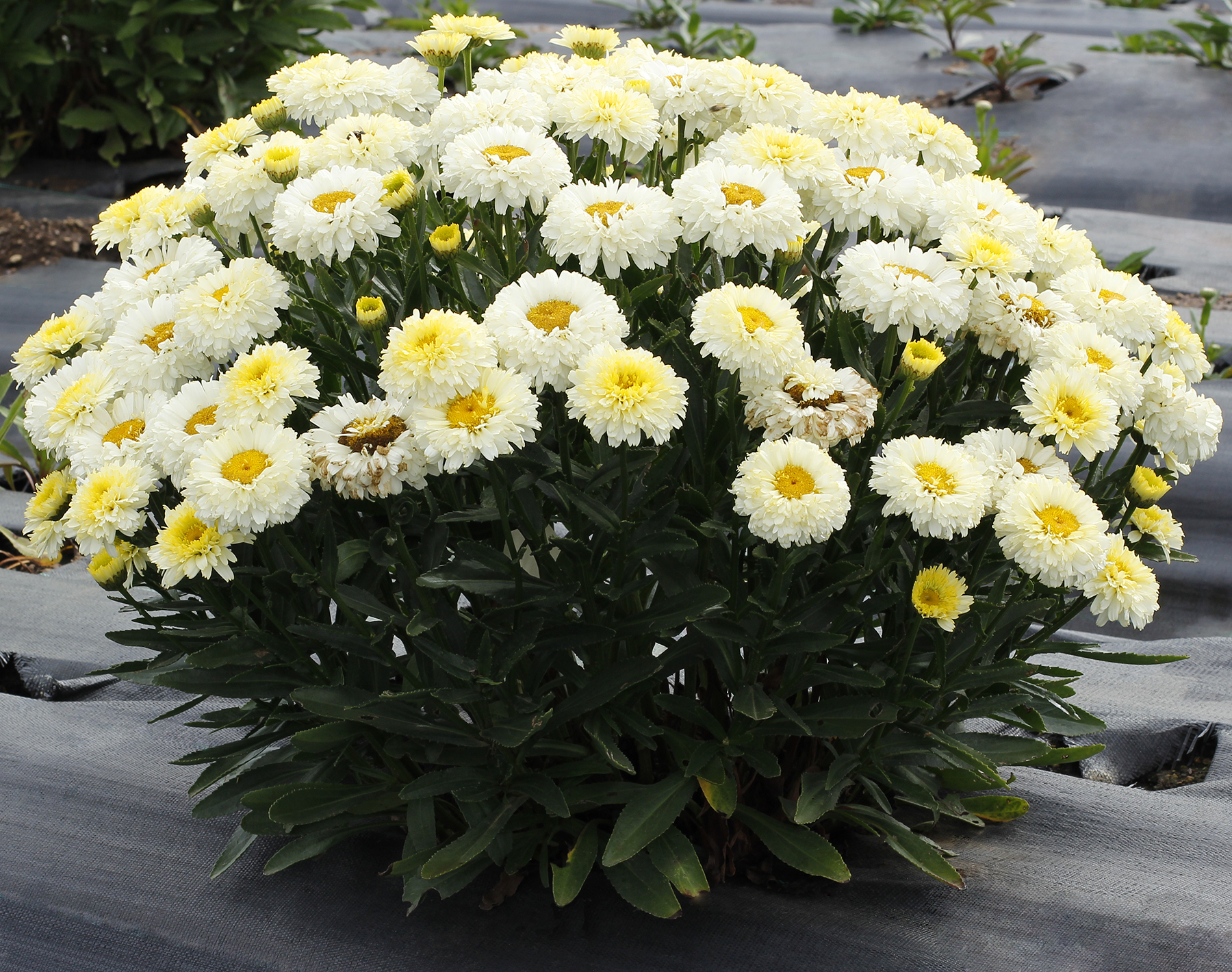 A delightful plant with masses of double lemon yellow to white flowers with gold centers. Its compact habit stays tight and low. This great crown produces multiple flowers in the first year.
